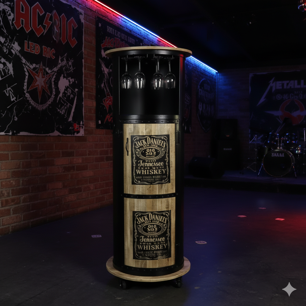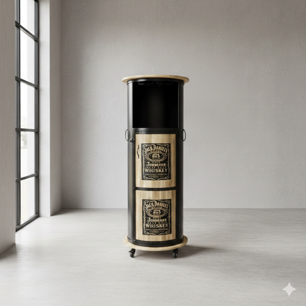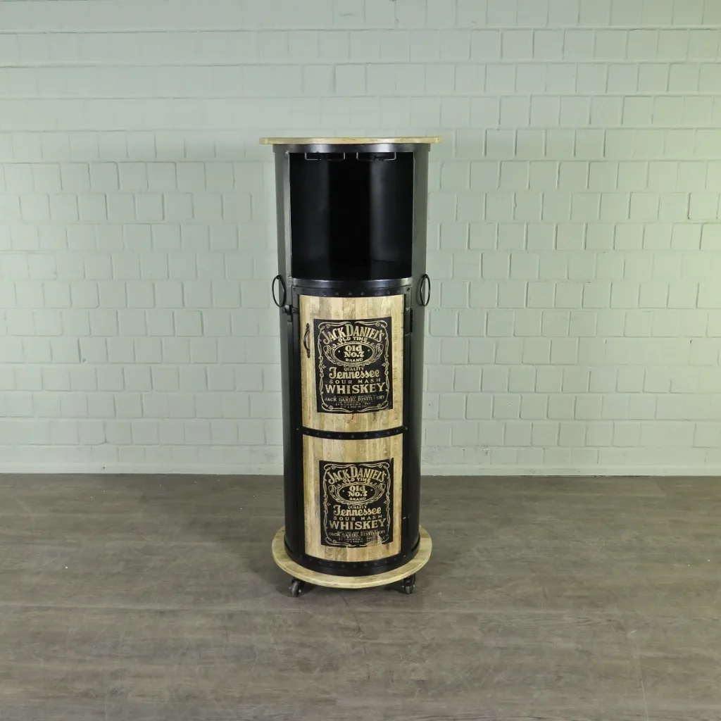 Einmalig gestaltete Minibar auf Rollen in Form eines Fasses aus Metall und Mangoholz hergestellt. Machart und Farbton der Minbar tragen sehr zum optischen Wert dieses Möbels bei, das sowohl dekorative Möglichkeiten als auch genügend Stauraum bietet.