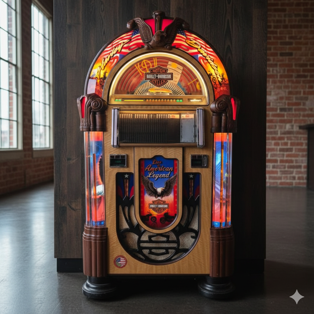 10.995,00€ Exkl. MwSt.Diese klassische CD-6-Jukebox ist offiziell von der Harley-Davidson Company lizenziert. Sie hat das amerikanische Lebensgefühl perfekt eingefangen: Zwei Weißkopfseeadler, das Wahrzeichen der Vereinigten Staaten, erheben sich von den Pilastern, und ein dritter Adler ziert die mittlere Platte, begleitet von zwei Harley-Davidson Motorrädern. Der robuste Charakter der Harley-Davidson wird durch die Beleuchtung des Bogens und die beleuchteten, speziell angefertigten Glasscheiben unterstrichen.