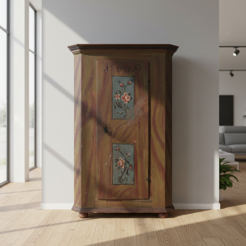 Im Originalzustand stehender Barock Schrank aus Kiefer von ca. 1820. Der 1857 mit Bauernmalerei versehene Schrank befindet sich in einem relativ guten Zustand und weist nur dem Alter entsprechende Gebrauchsspuren auf. Er ist frei von Wurmbefall.