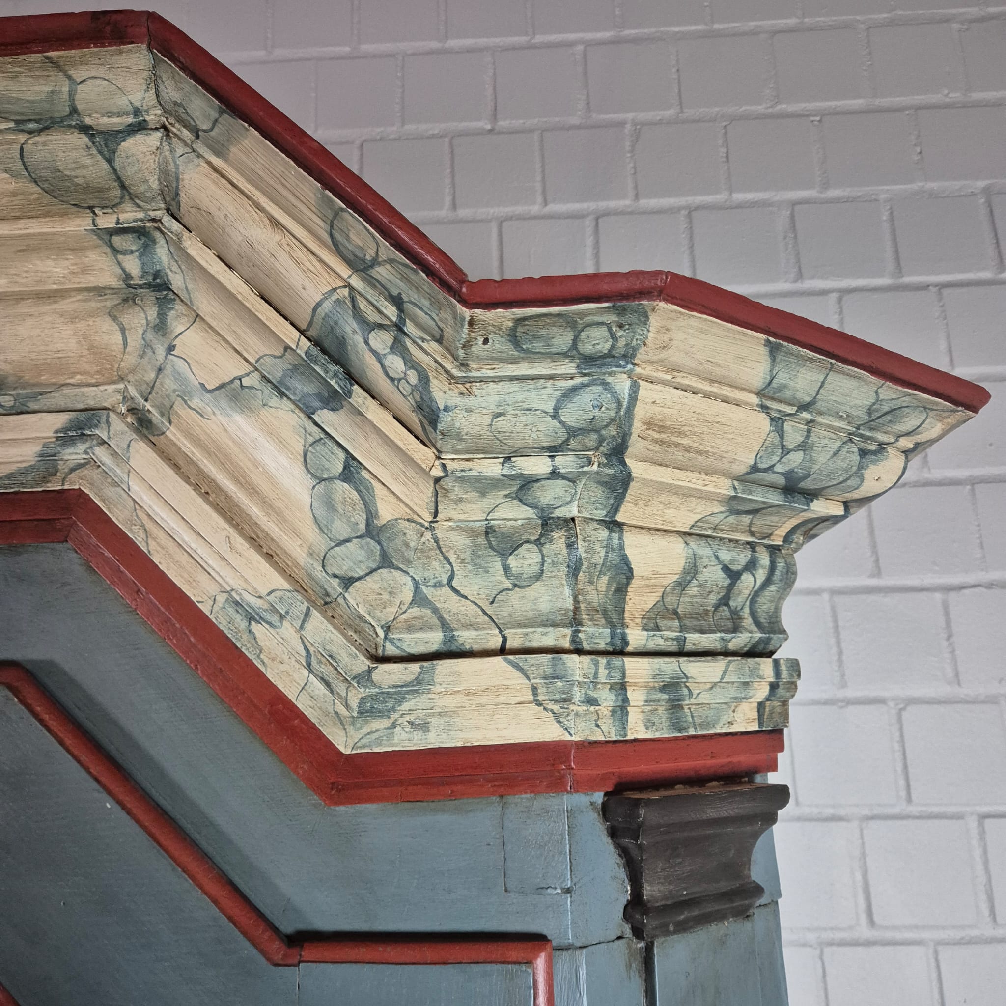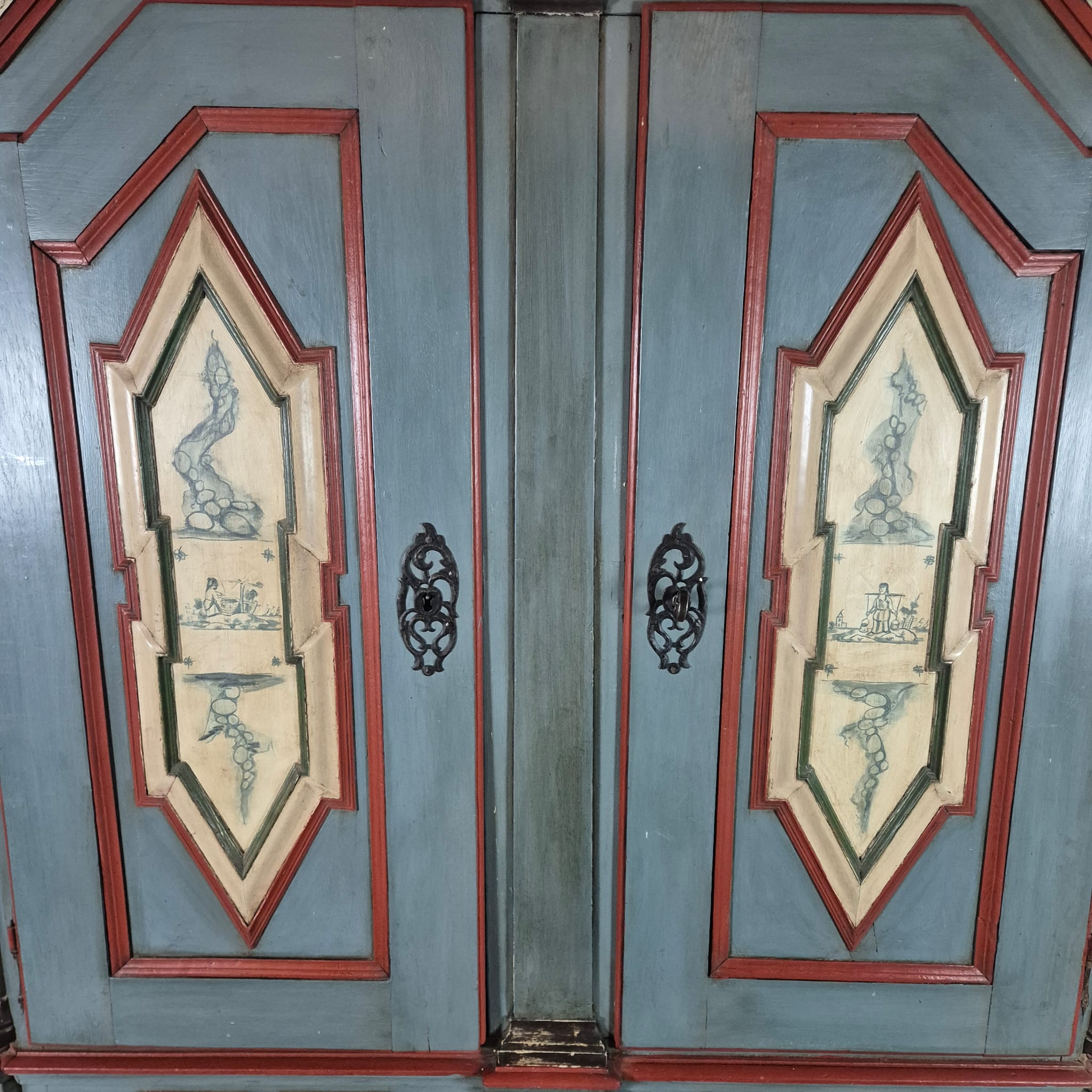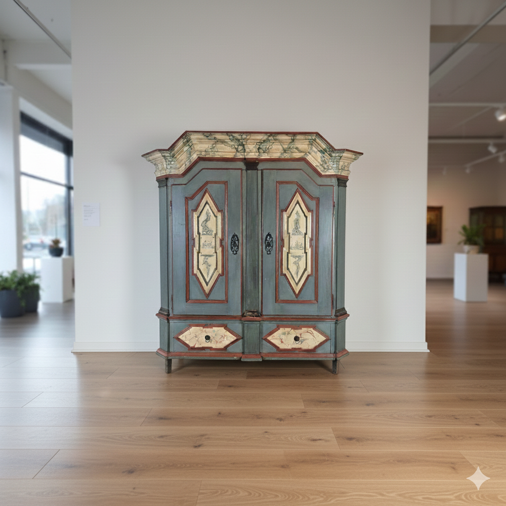 Restaurierter Barock Kleiderschrank aus massiv Eiche (lackiert) von ca. 1770. Der mit Bauernmalerei versehene Schrank befindet sich in einem guten Zustand und weist nur leichte Gebrauchsspuren auf. Zerlegbar (4-teilig).