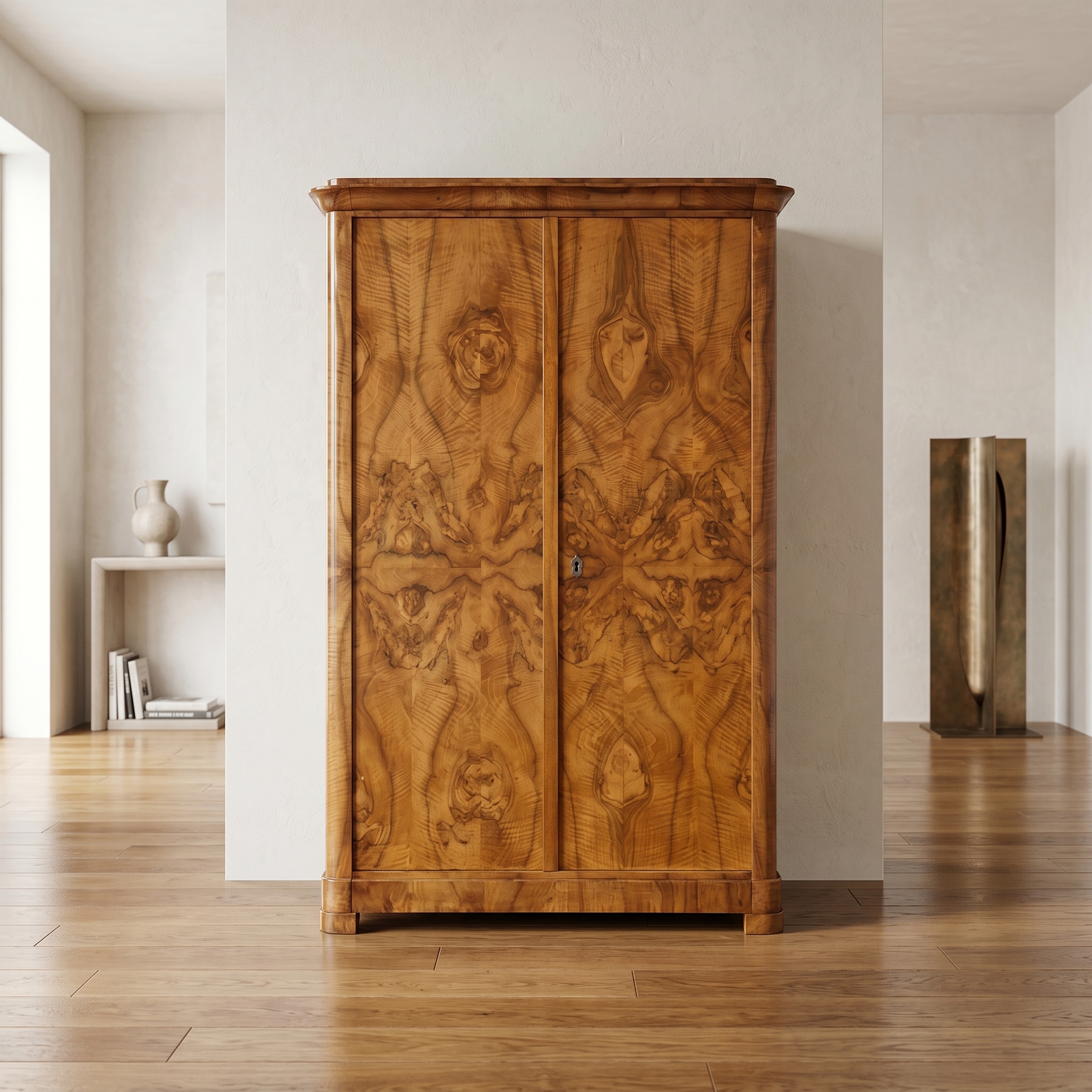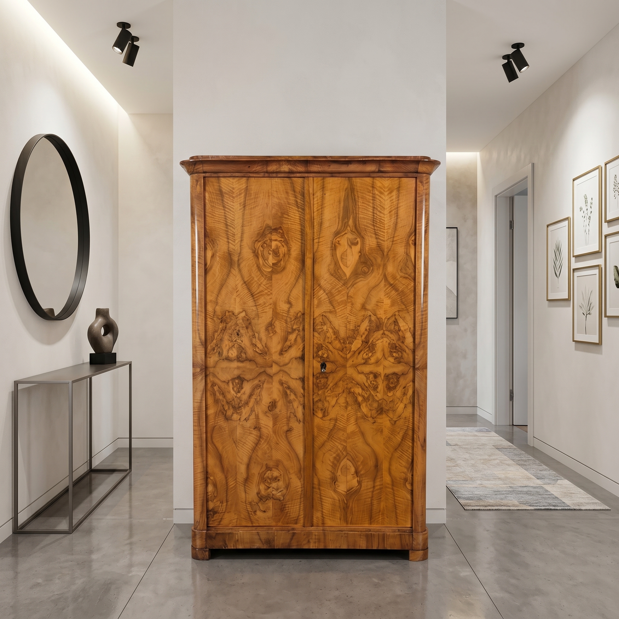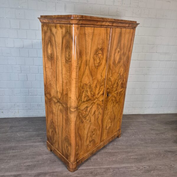 1.899,00€ Exkl. MwSt.Restaurierter Biedermeier Schrank in Nussbaum furniert und von Grund auf Schellack poliert von ca. 1830. Der Kleiderschrank befindet sich in einem sehr guten Zustand und weist nur minimale Gebrauchsspuren auf.