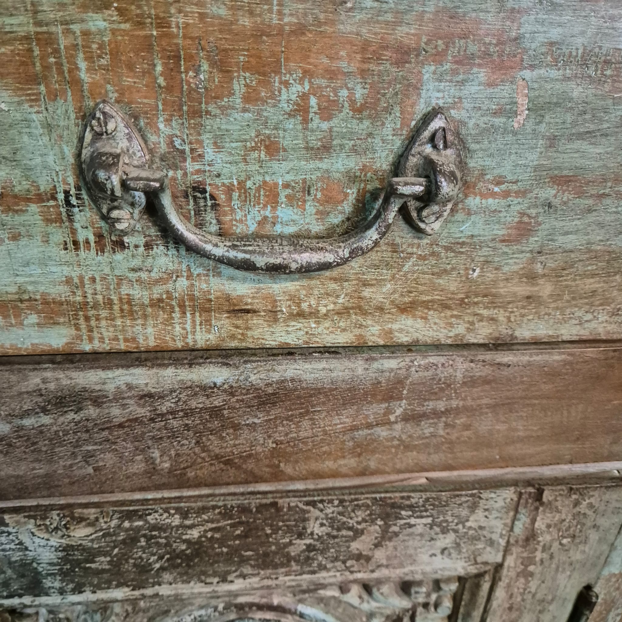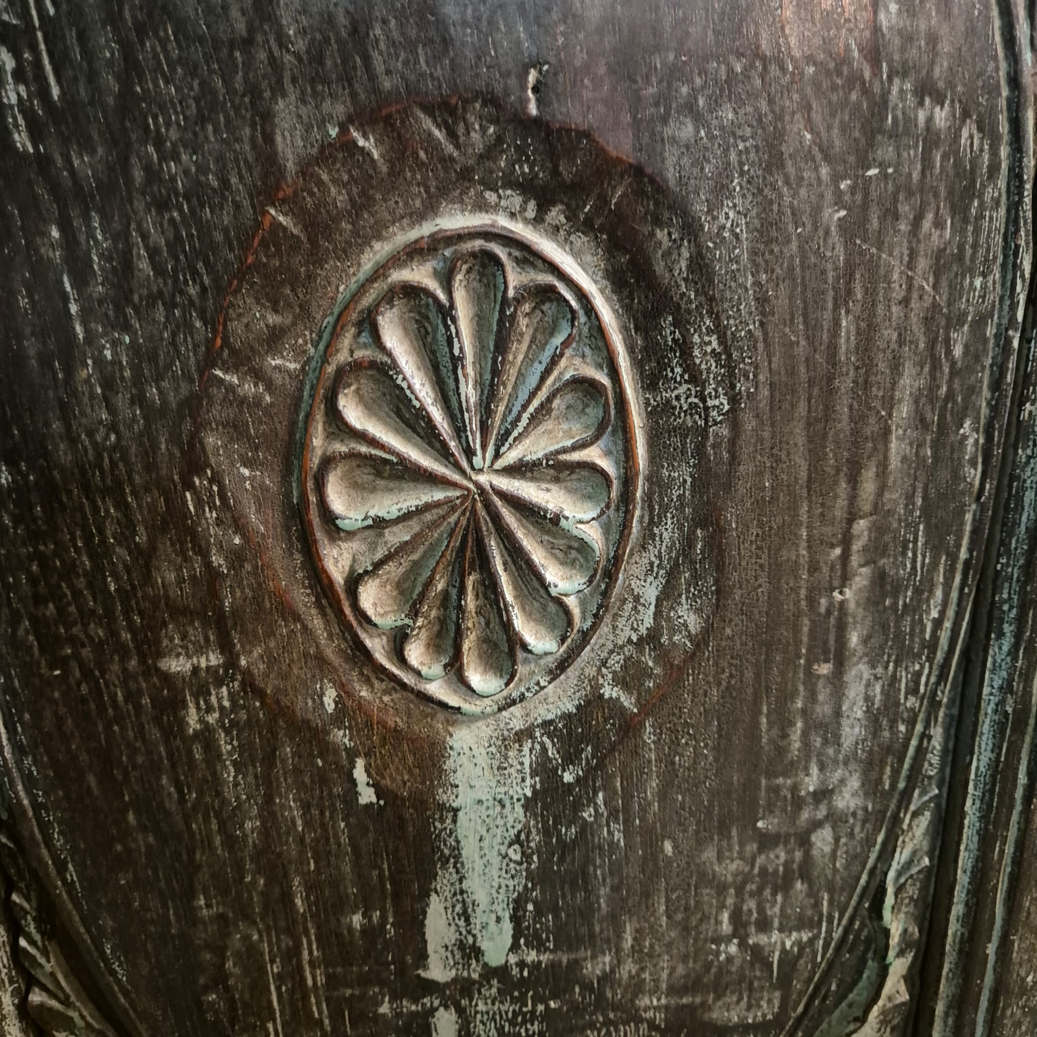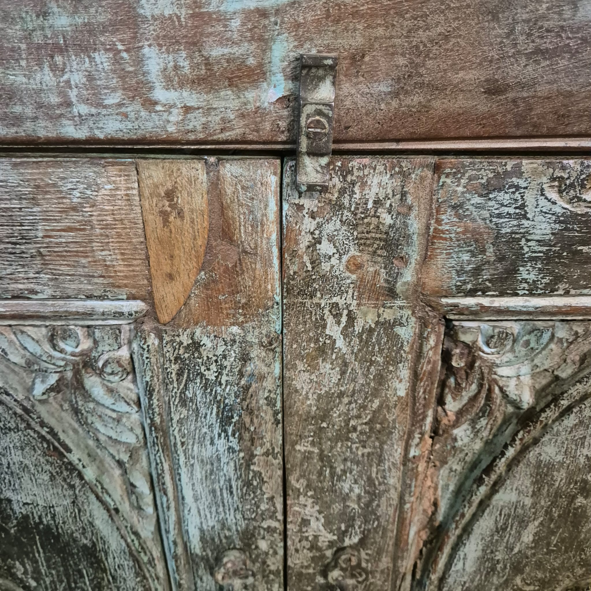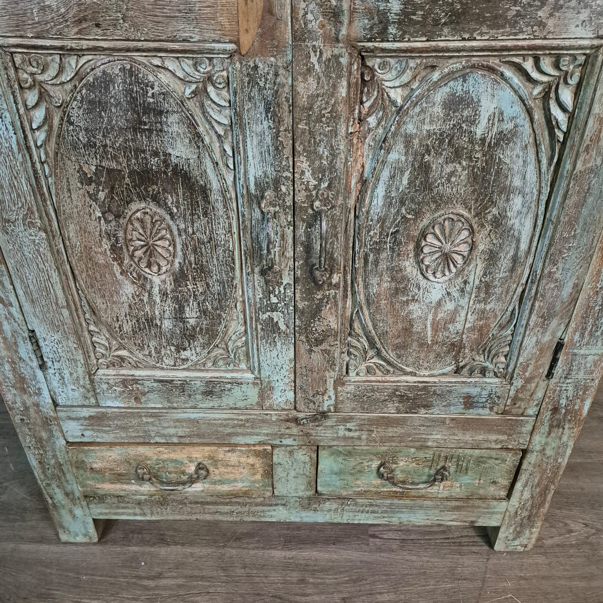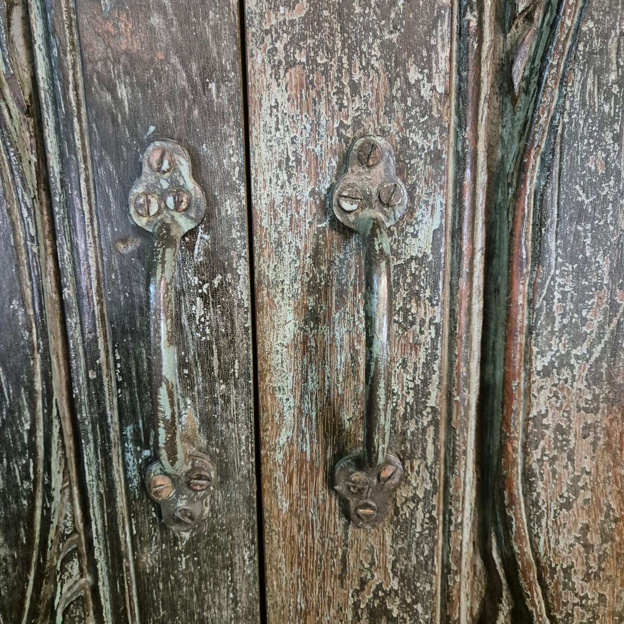 Besondere Merkmale – Kunstvolle Schnitzereien: Ein absolutes Highlight sind die aufwendigen, kreisförmigen Schnitzereien auf den Türfronten. Diese sonnen- oder sternförmigen Muster verleihen dem Schrank eine einzigartige Textur und einen besonderen ethnischen oder kolonialen Touch, der ihn von gewöhnlichen Möbelstücken abhebt. Die Griffe sind schlicht und fügen sich harmonisch in das Gesamtbild ein.