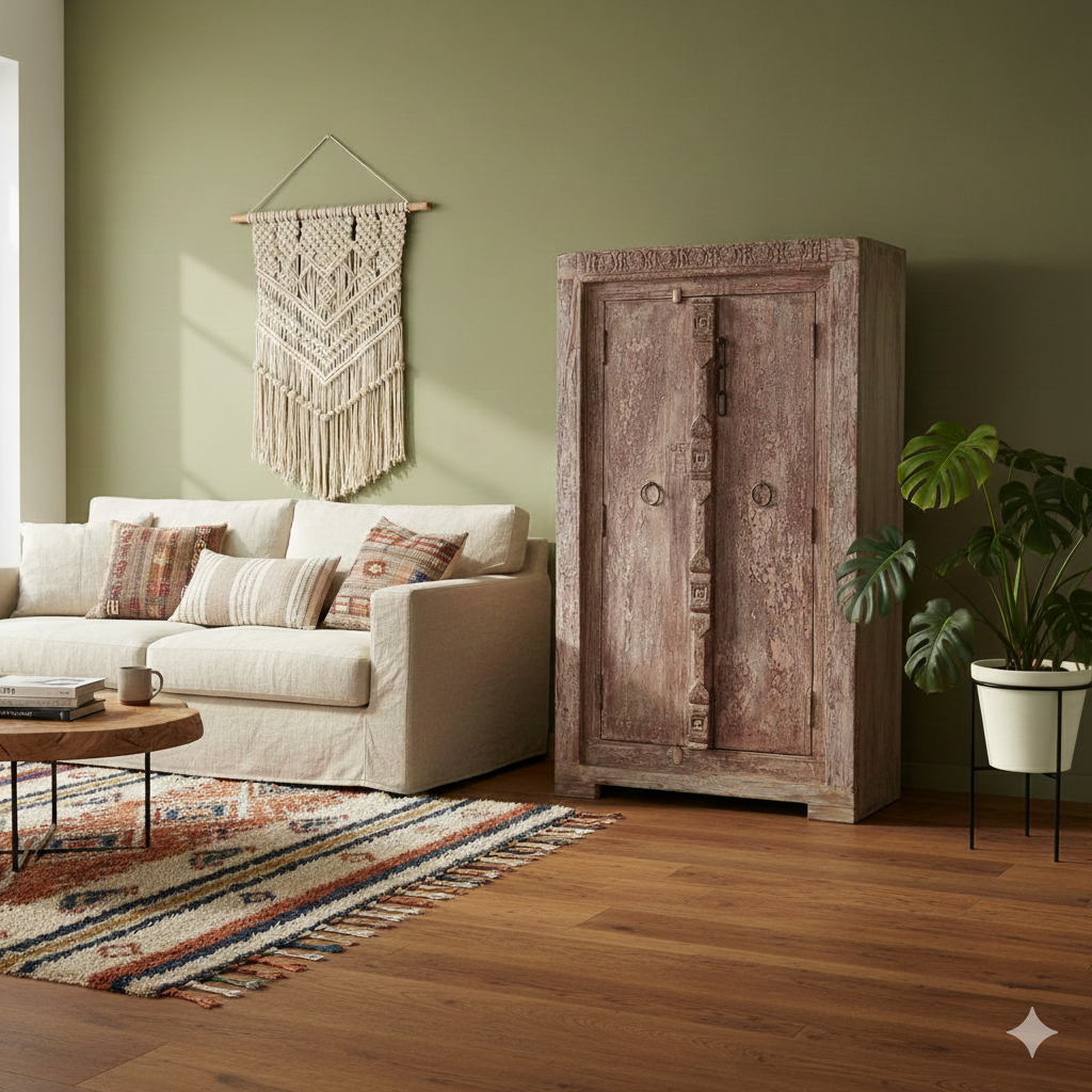 Dieser aufwendig gestaltete Schrank in Shabby Chic Optik aus massiv Teak (Hartholz) erhält seine besondere Wirkung durch minimale Unregelmäßigkeiten im Holz. Diese entstehen durch das verwendete Edelholz mit seinen verschiedenen Strukturen, welche diesem Stück einen eigentümlichen Charakter verleihen und es zu einem Unikat machen. Machart und Farbton des Holzes tragen sehr zum optischen Wert dieses Möbels bei, das sowohl dekorative Möglichkeiten als auch genügend Stauraum bietet.