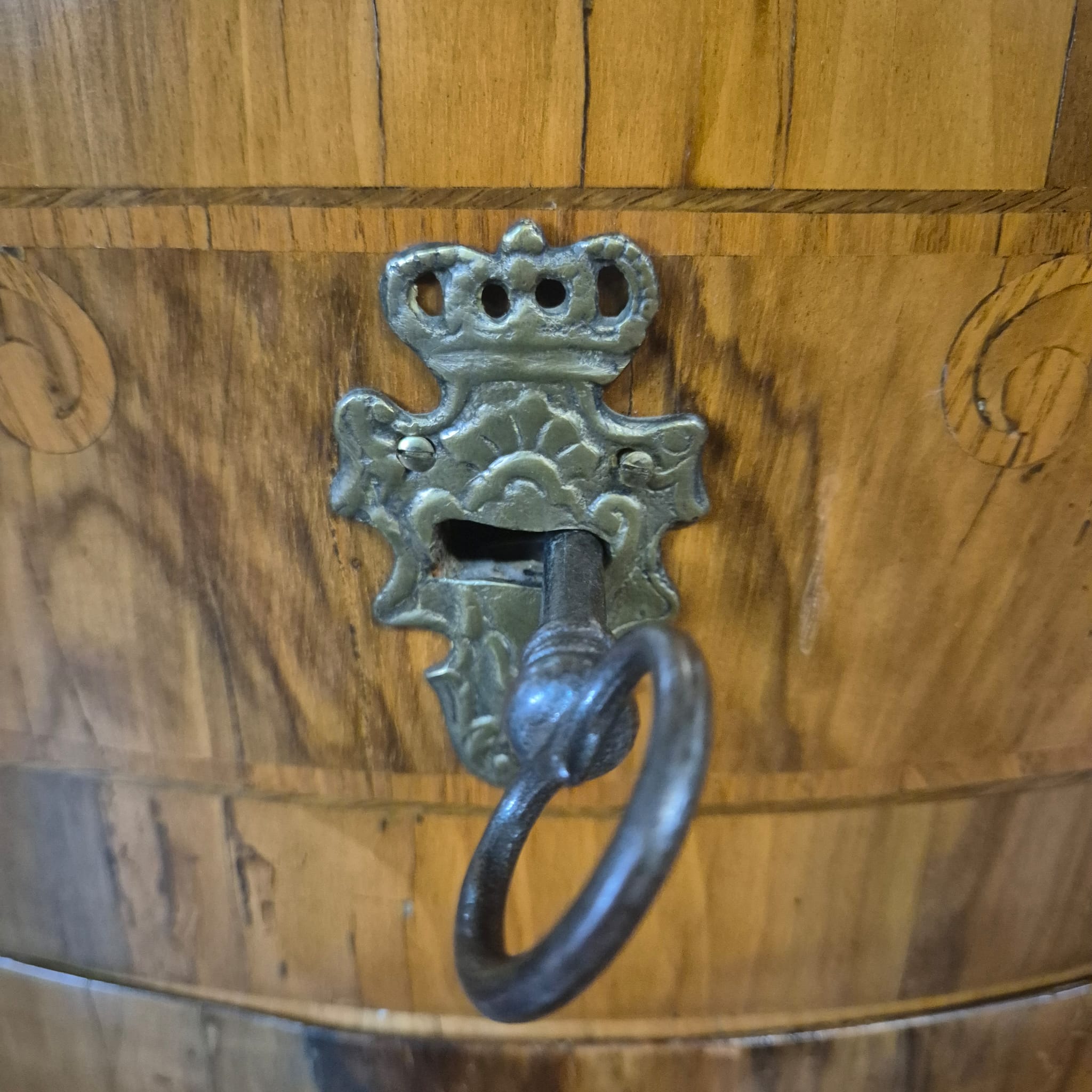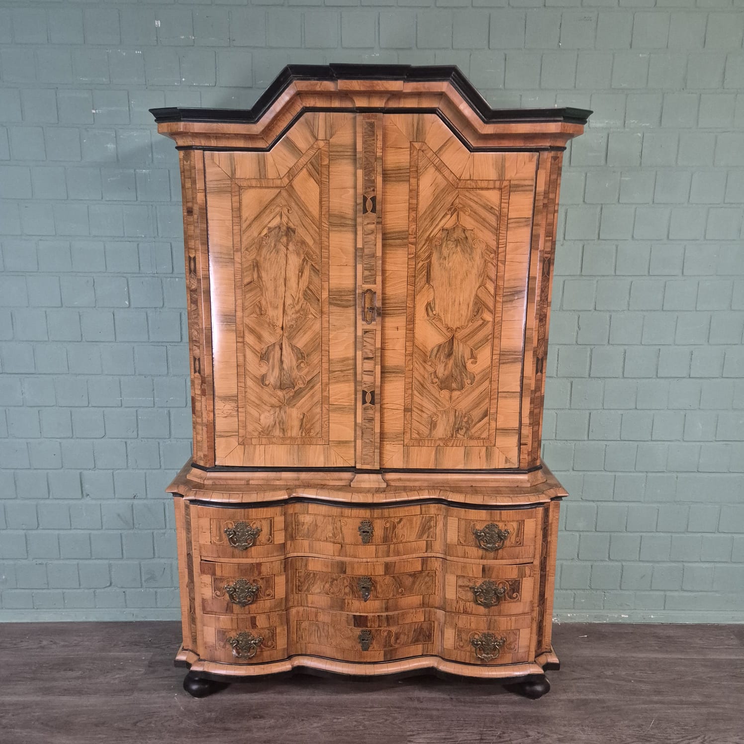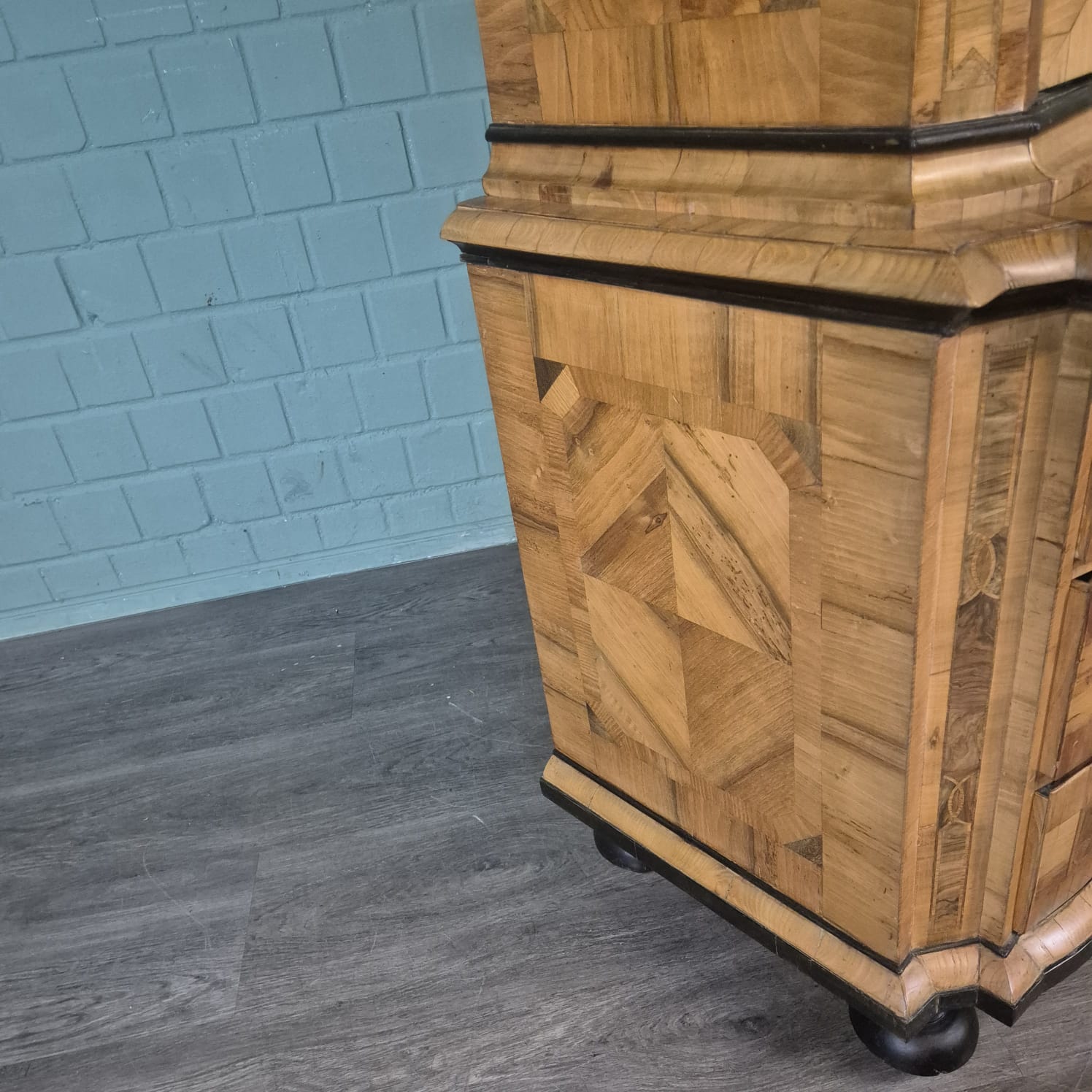 Restaurierter Barock Schreibschrank in Nussbaum furniert und gewachst von ca. 1770. Der mit der originalen Rückwand versehene Sekretär befindet sich in einem sehr guten Zustand und weist nur minimale Gebrauchsspuren auf. Zerlegbar (2-teilig).