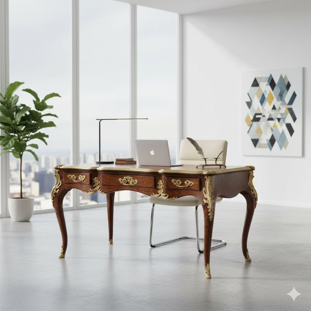 Dieser Schreibtisch ist nicht nur ein funktionales Möbelstück, sondern auch ein beeindruckendes Dekorationsstück, das jedem Arbeitszimmer oder Salon eine elegante und historische Note verleihen.