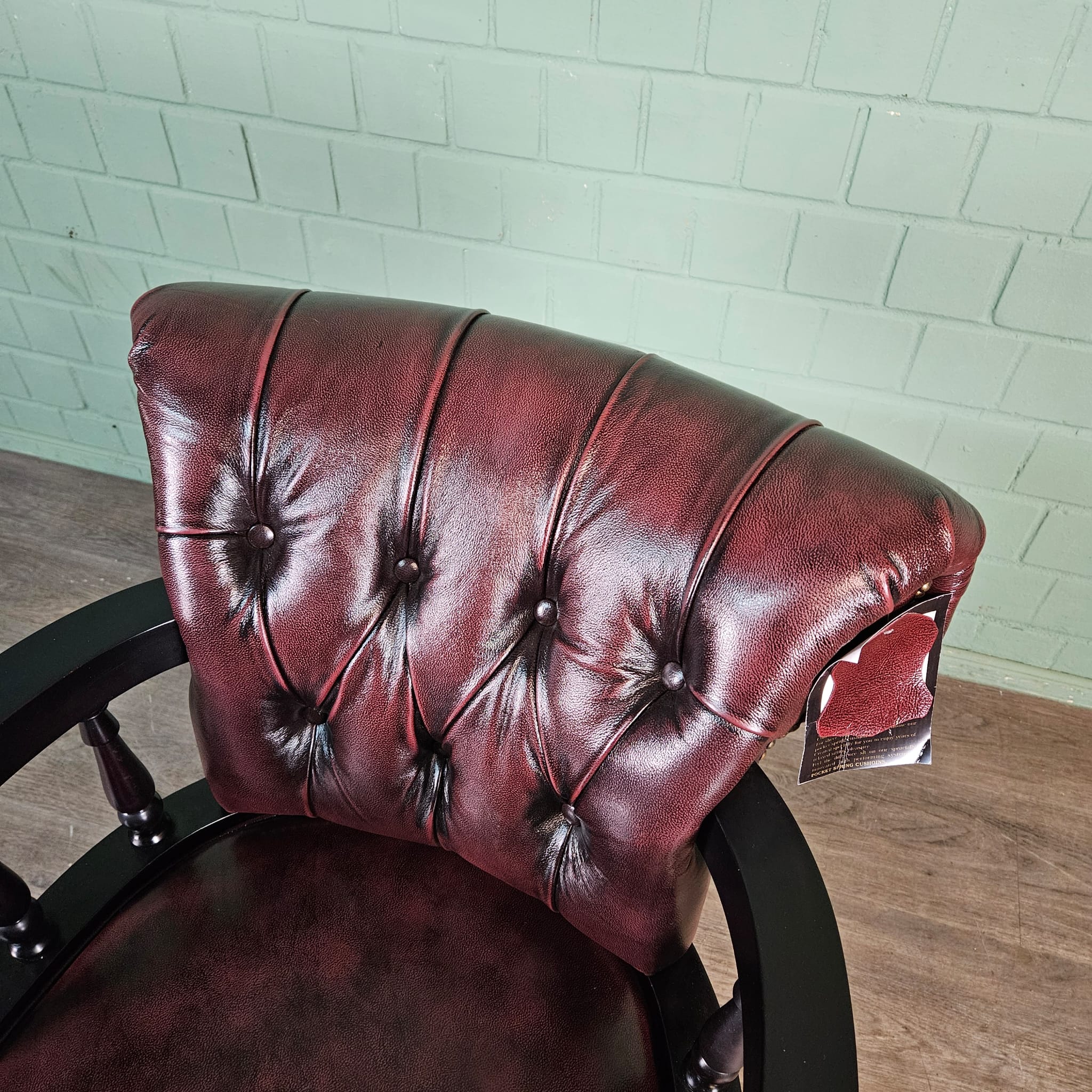 Die gedrechselten Armlehnen aus Holz sorgen für einen stilvollen Kontrast zum Leder.