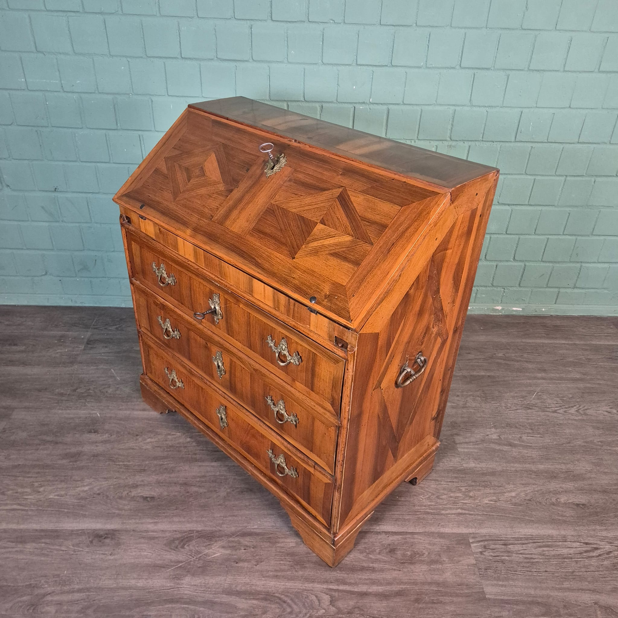 Restaurierter Barock Schrägklappen-Sekretär von ca. 1790 in Nussbaum furniert. Der Sekretär befindet sich in einem guten Zustand und weist nur geringe Gebrauchsspuren auf.