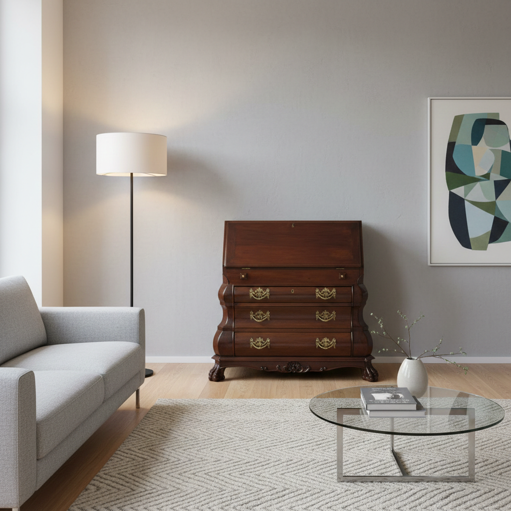 Restaurierter Neubarock Schrägklappen-Sekretär von ca. 1950 in Mahagoni furniert. Der Sekretär befindet sich in einem guten Zustand und weist nur leichte Gebrauchsspuren auf.