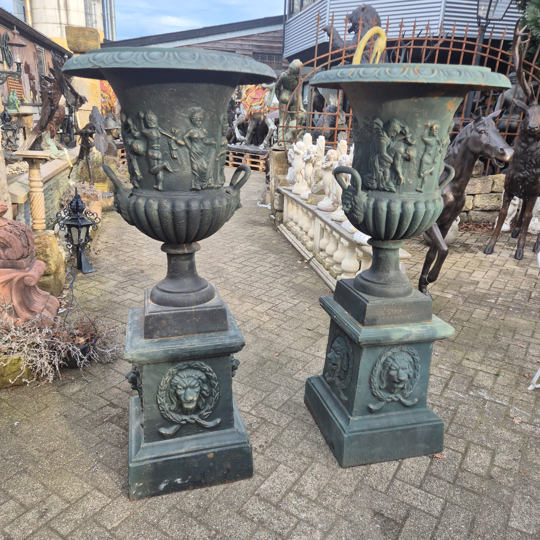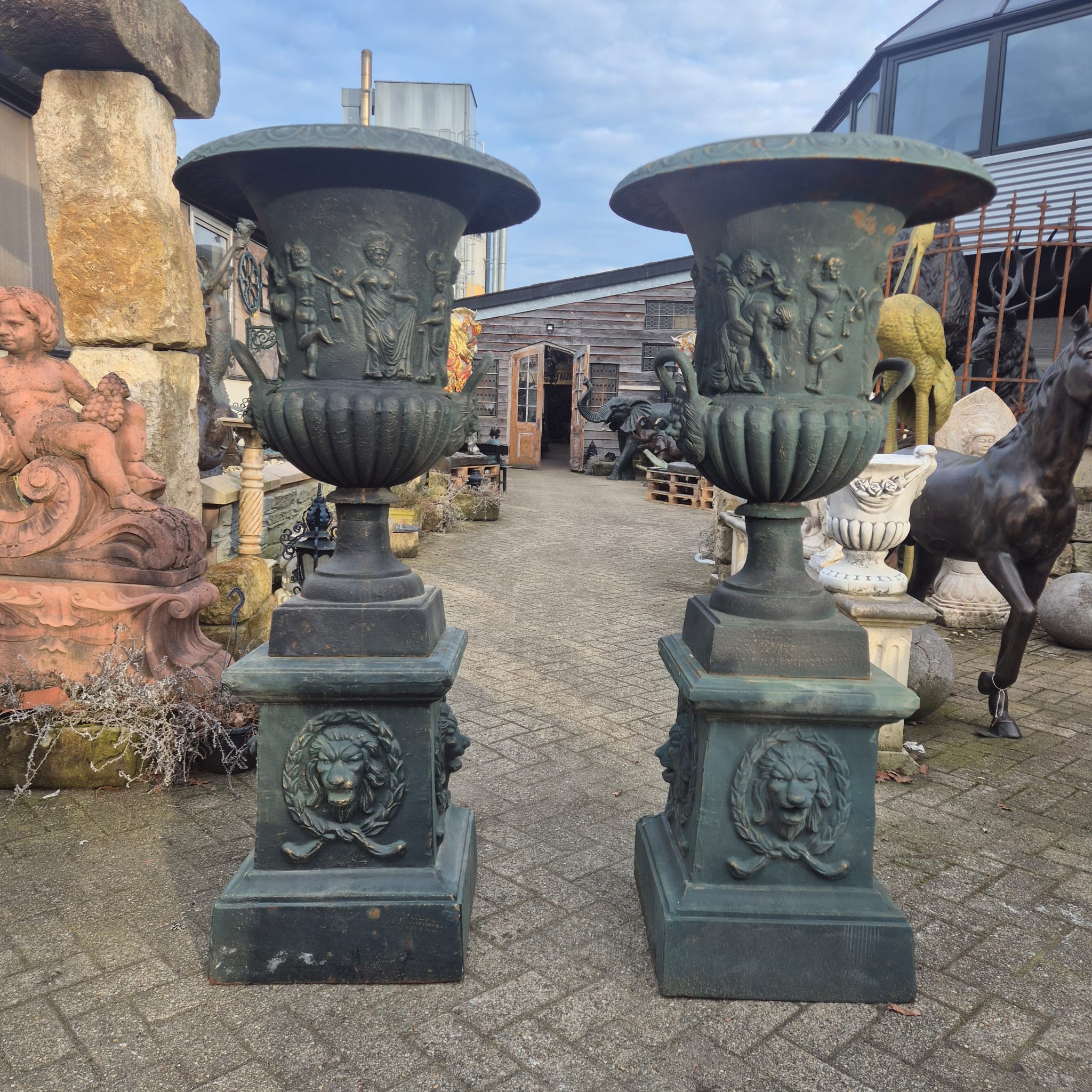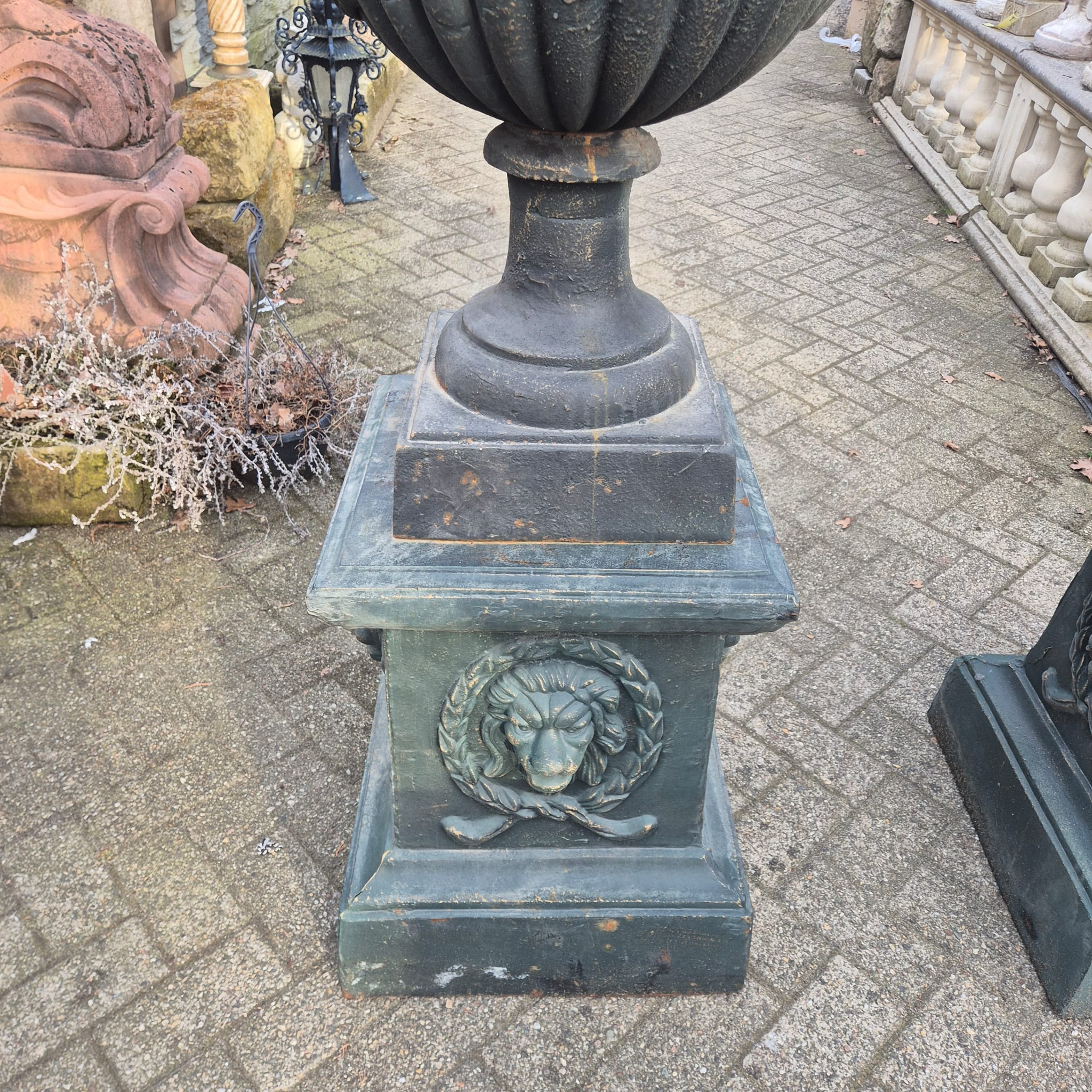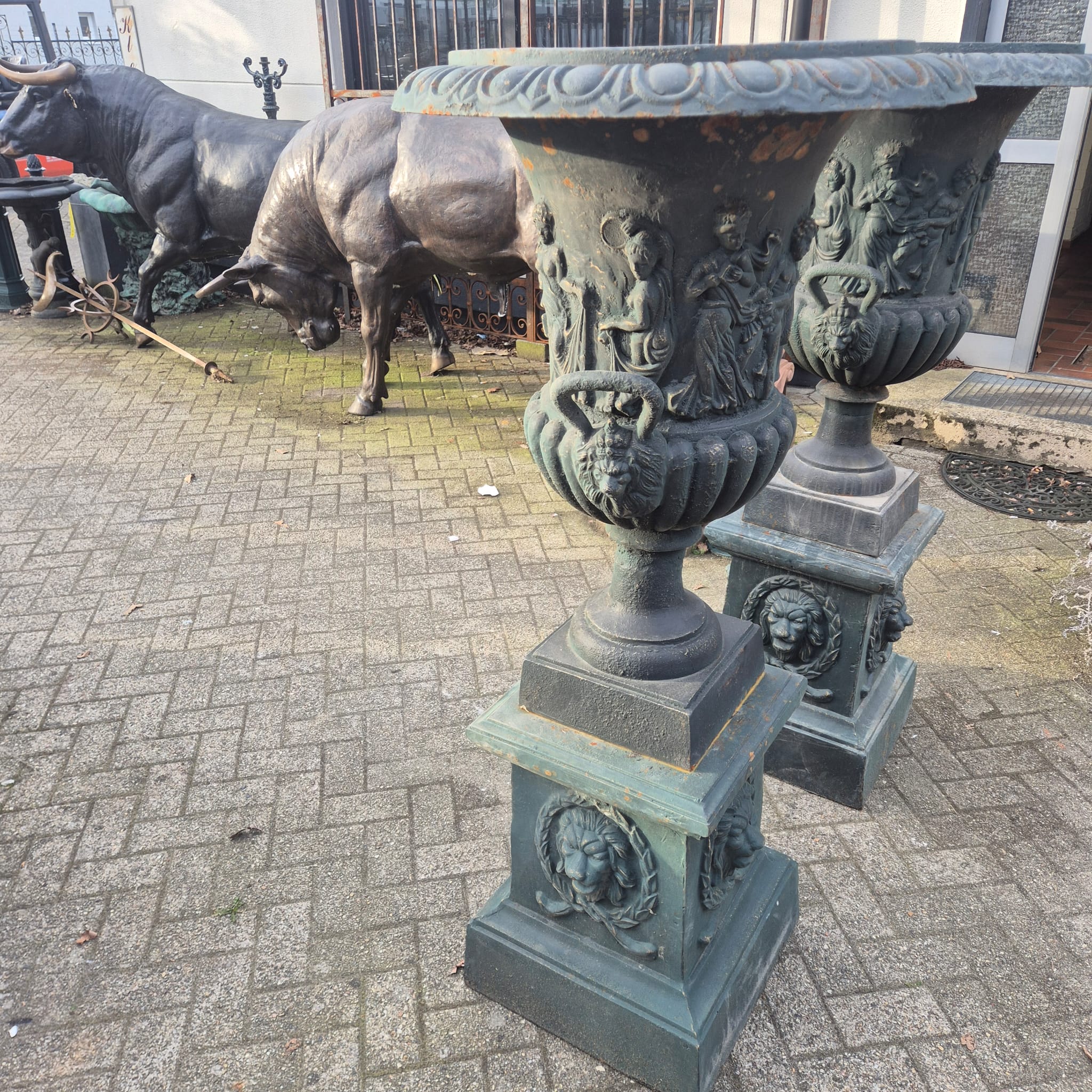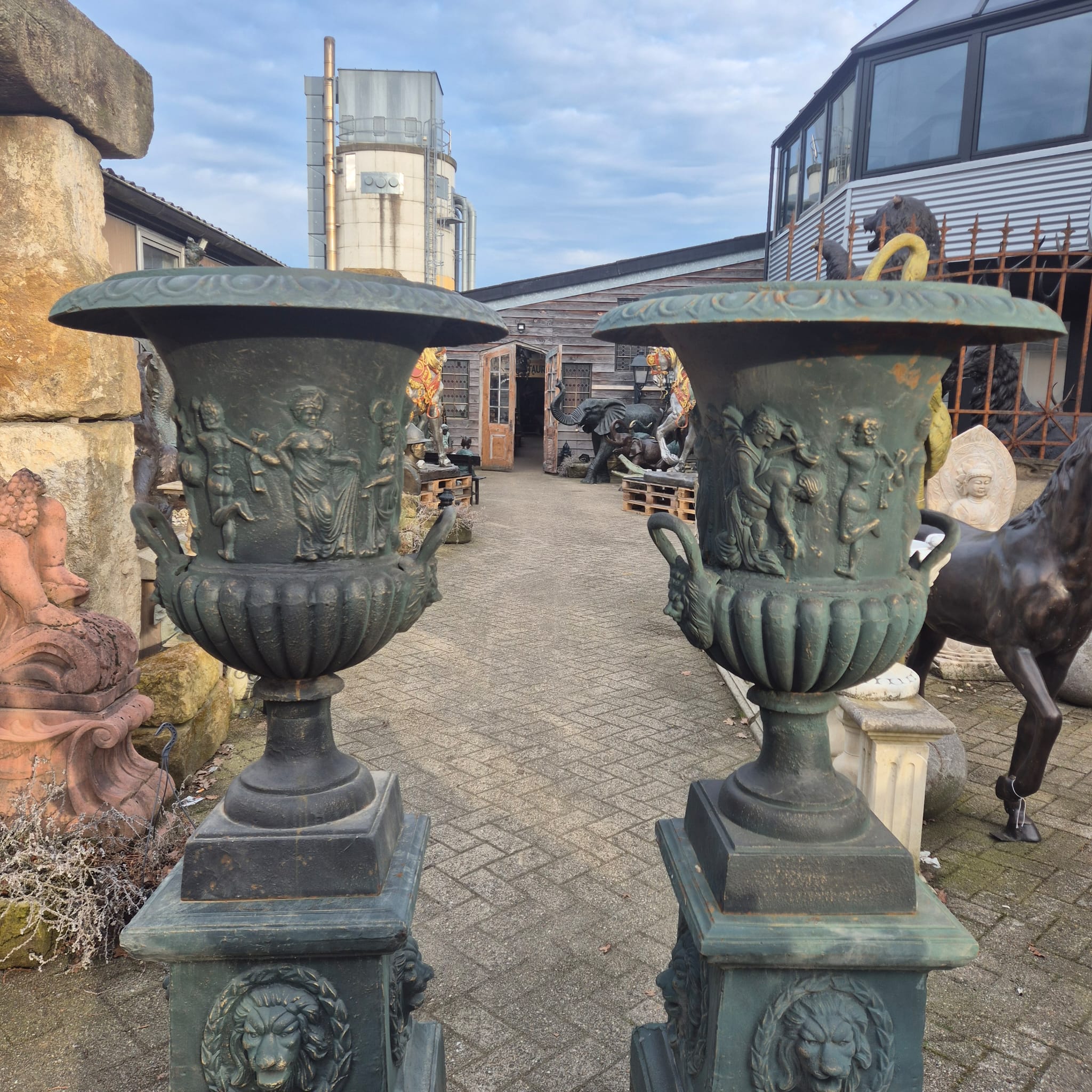 Set aus zwei imposanten, antiken Gusseisen-Gartenurnen. Dieses beeindruckende Paar, das auf monumentalen Säulensockeln ruht, ist ein absolutes Highlight für Liebhaber von klassischem Garten- und Parkdesign.