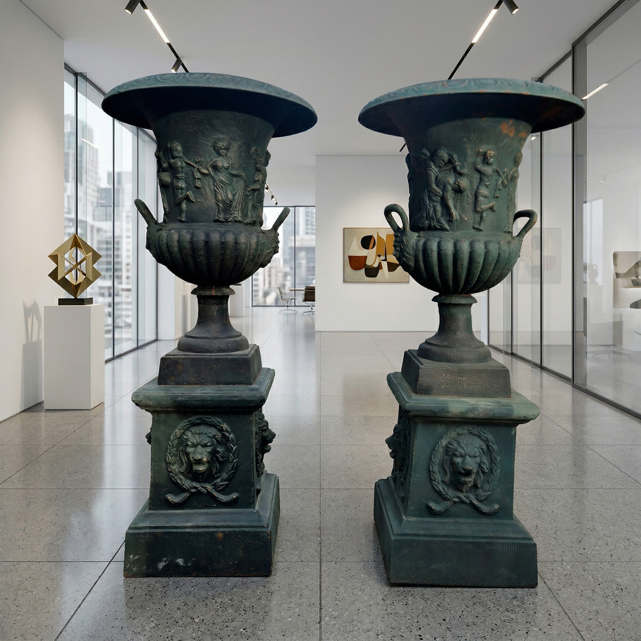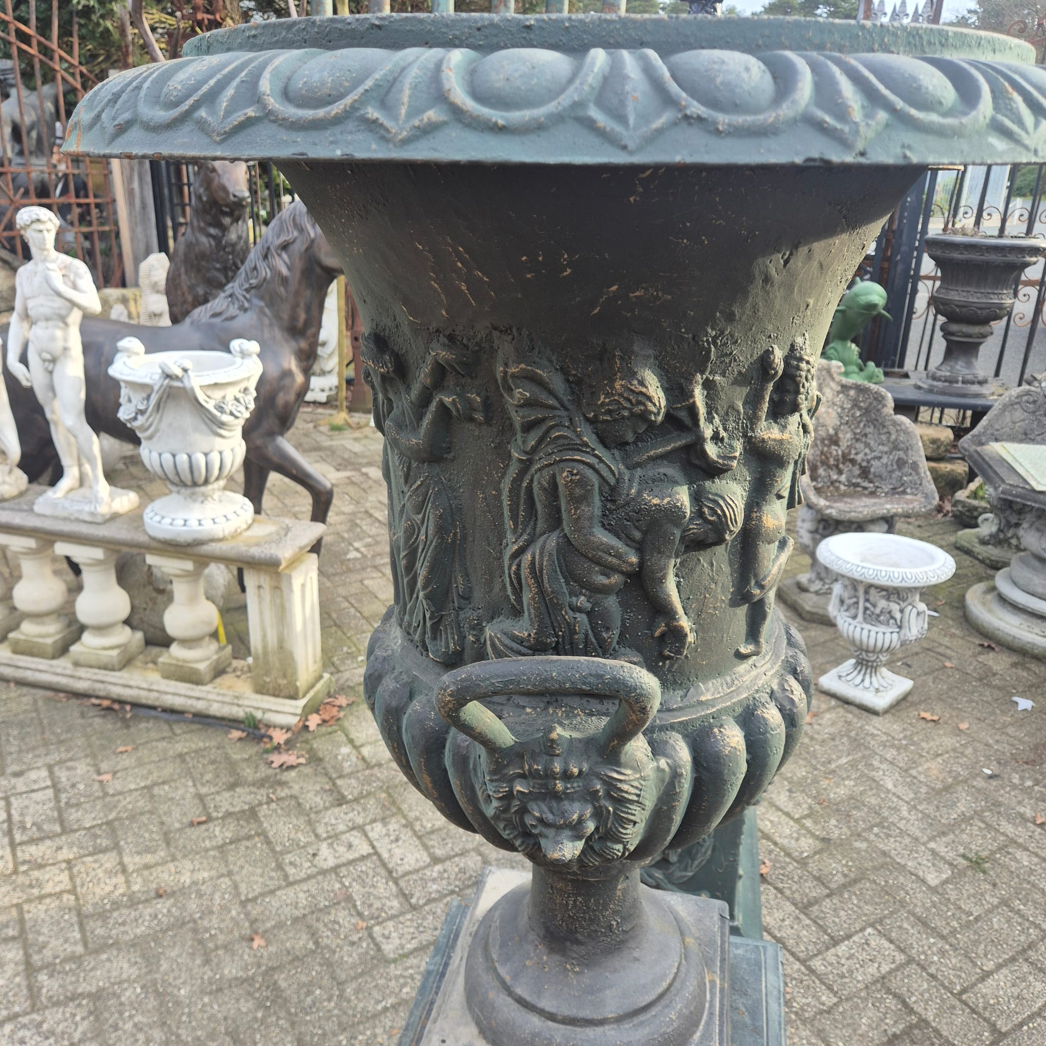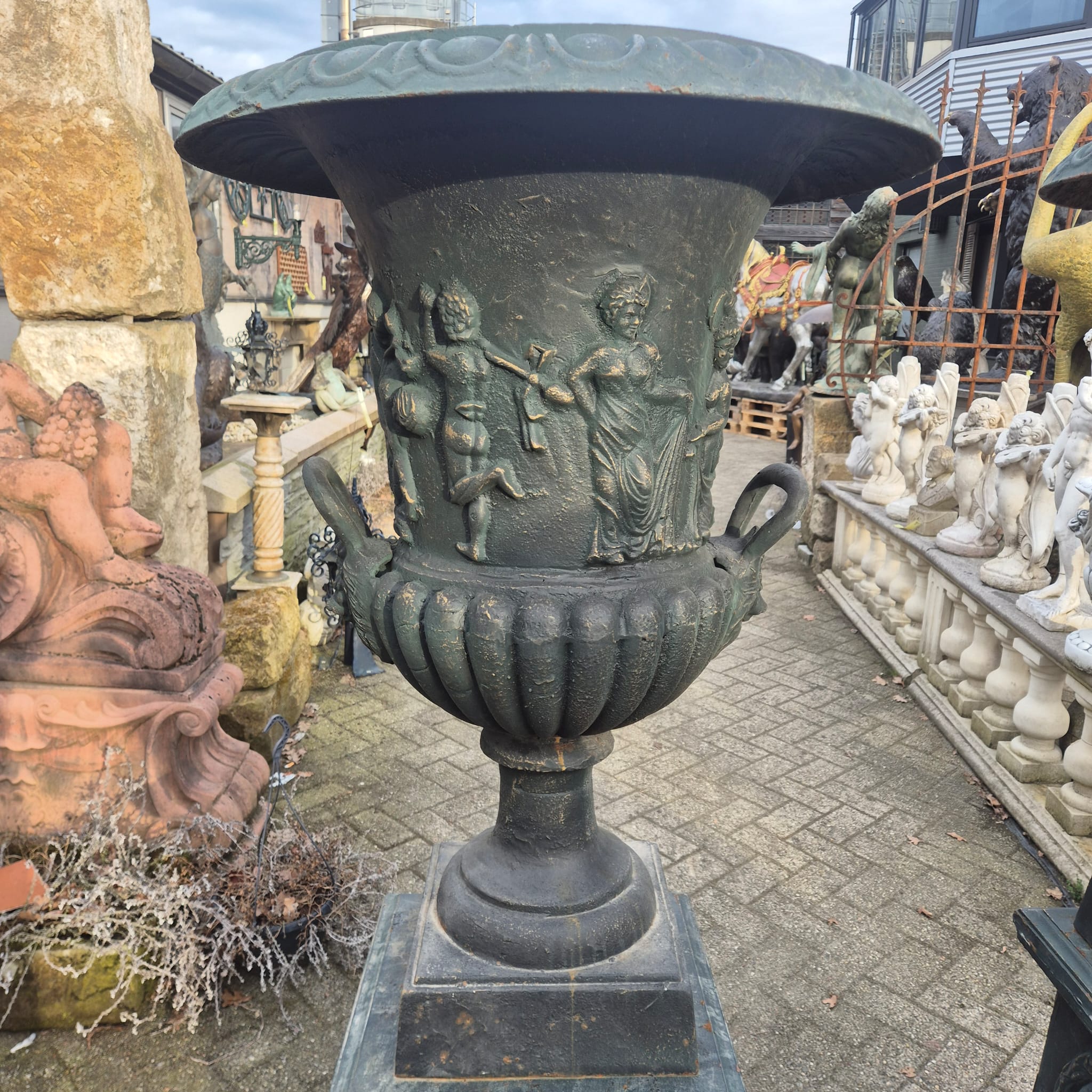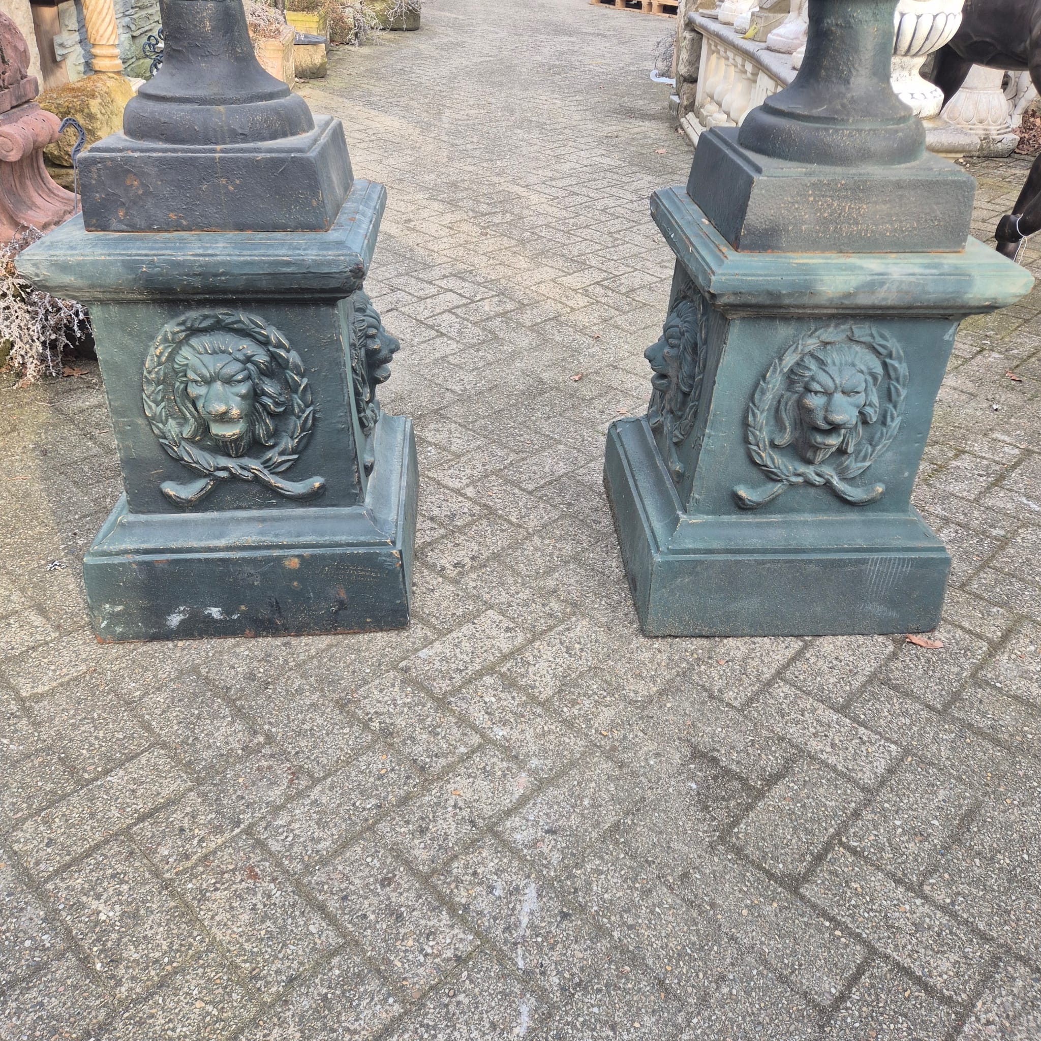 Set aus zwei imposanten, antiken Gusseisen-Gartenurnen. Dieses beeindruckende Paar, das auf monumentalen Säulensockeln ruht, ist ein absolutes Highlight für Liebhaber von klassischem Garten- und Parkdesign.