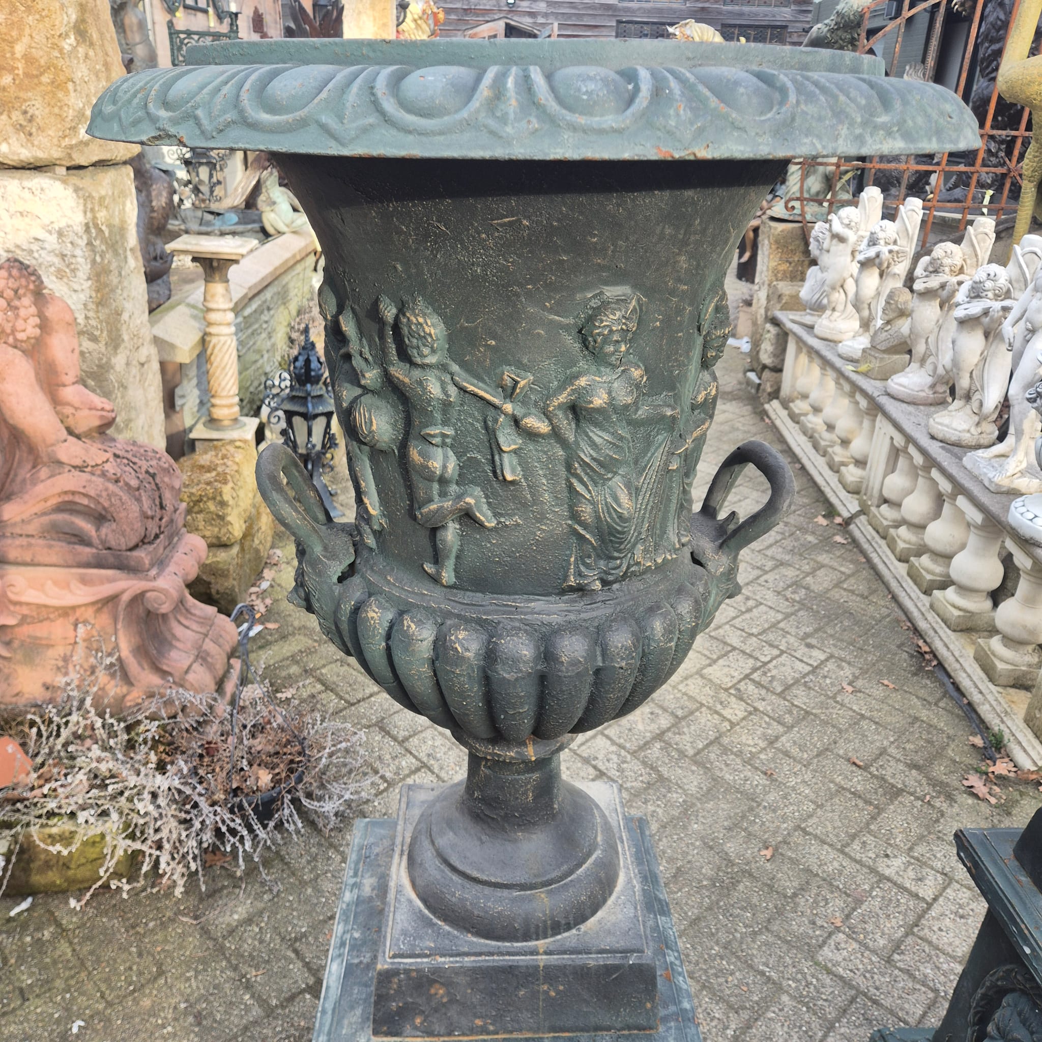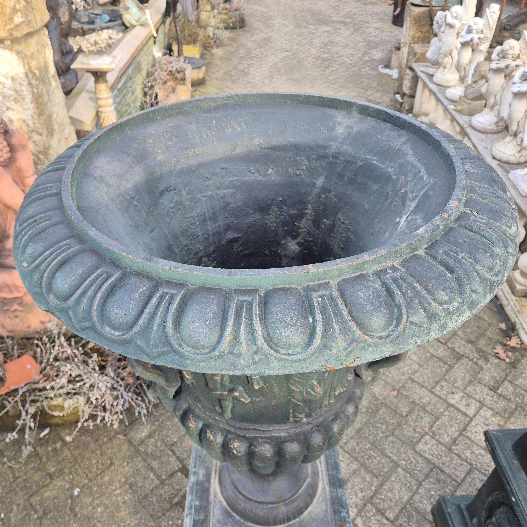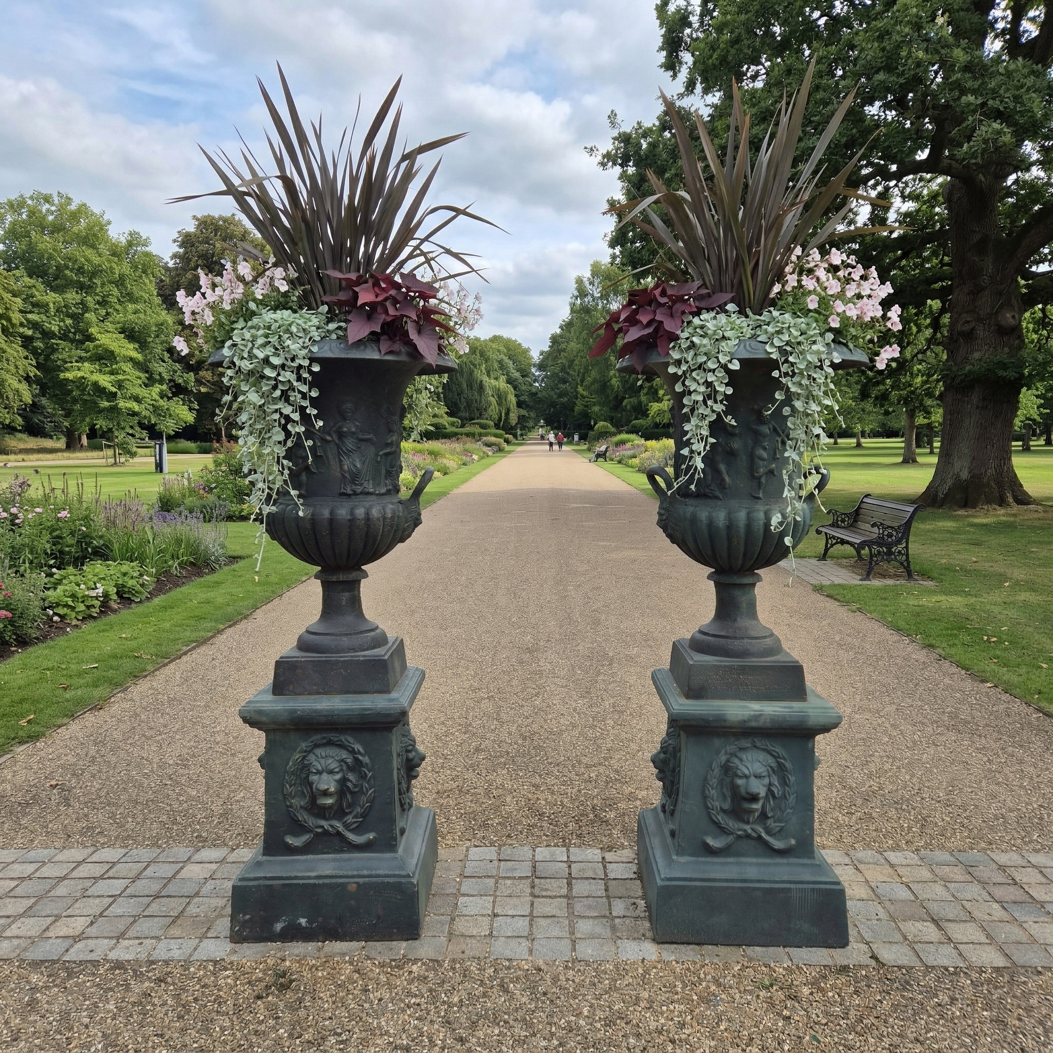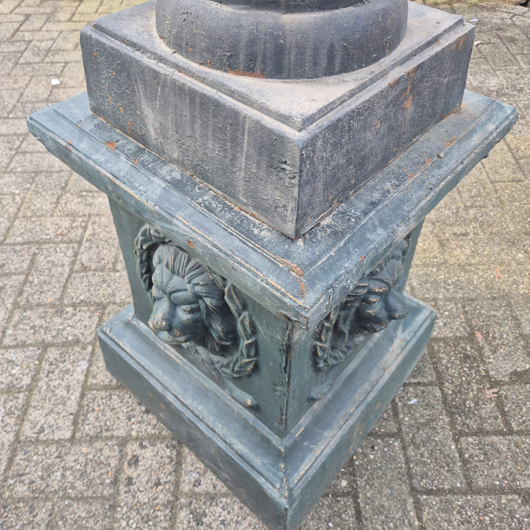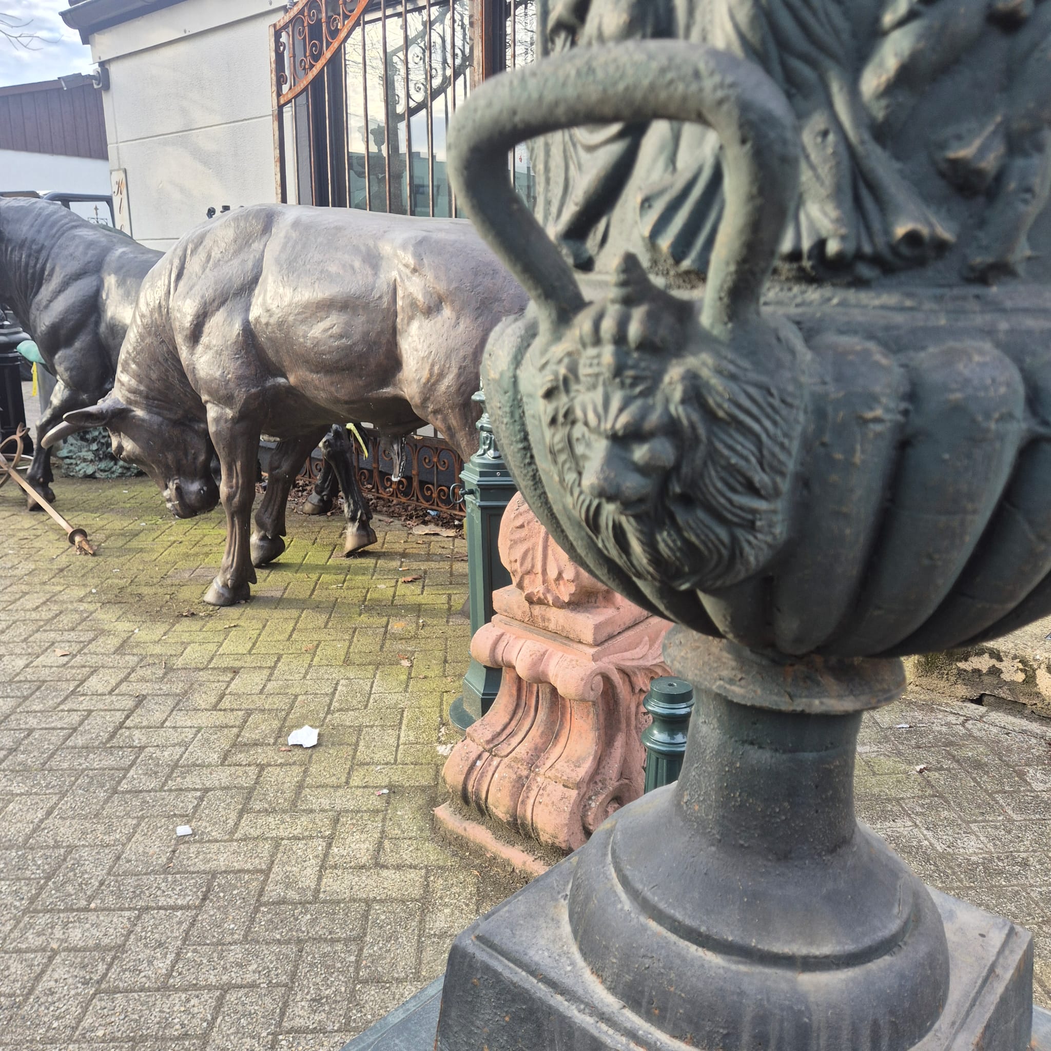 Set aus zwei imposanten, antiken Gusseisen-Gartenurnen. Dieses beeindruckende Paar, das auf monumentalen Säulensockeln ruht, ist ein absolutes Highlight für Liebhaber von klassischem Garten- und Parkdesign.