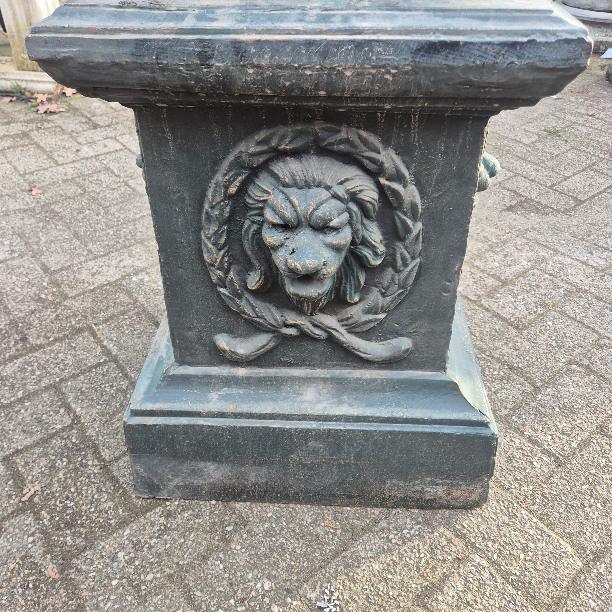 Design (Sockel): Die massiven, quadratischen Säulensockel spiegeln die Pracht der Urnen wider. Jede Seite jedes Sockels zeigt ein eindrucksvolles, tief ausgearbeitetes Relief eines brüllenden Löwenkopfes, umgeben von einem dichten Kranz aus Eichenlaub und heraldischen Elementen. Der Sockel hat eine massive, gestufte Basis und eine profilierte Deckplatte. Jede Vase ist zerlegbar (2-teilig).