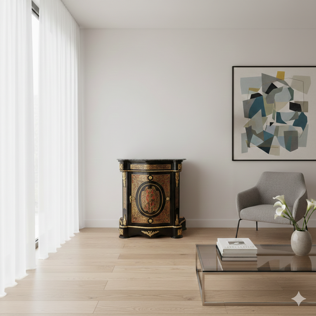- Metallapplikationen: Reich verziert mit detailreichen Applikationen aus Latoenkupfer in Goldoptik. Diese reichen von geschwungenen Leisten über Rocaillen bis hin zu figürlichen oder floralen Elementen, die die Kanten und Fronten schmücken und den luxuriösen Charakter unterstreichen. Die Beschläge wurden aus Bronze hergestellt.