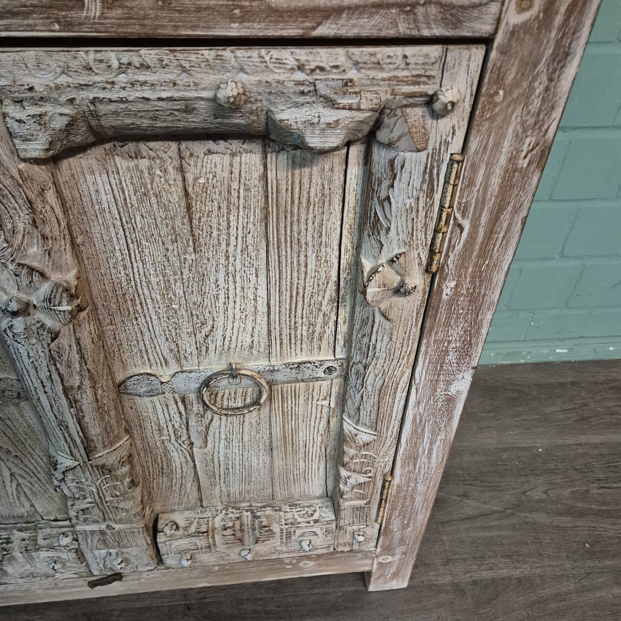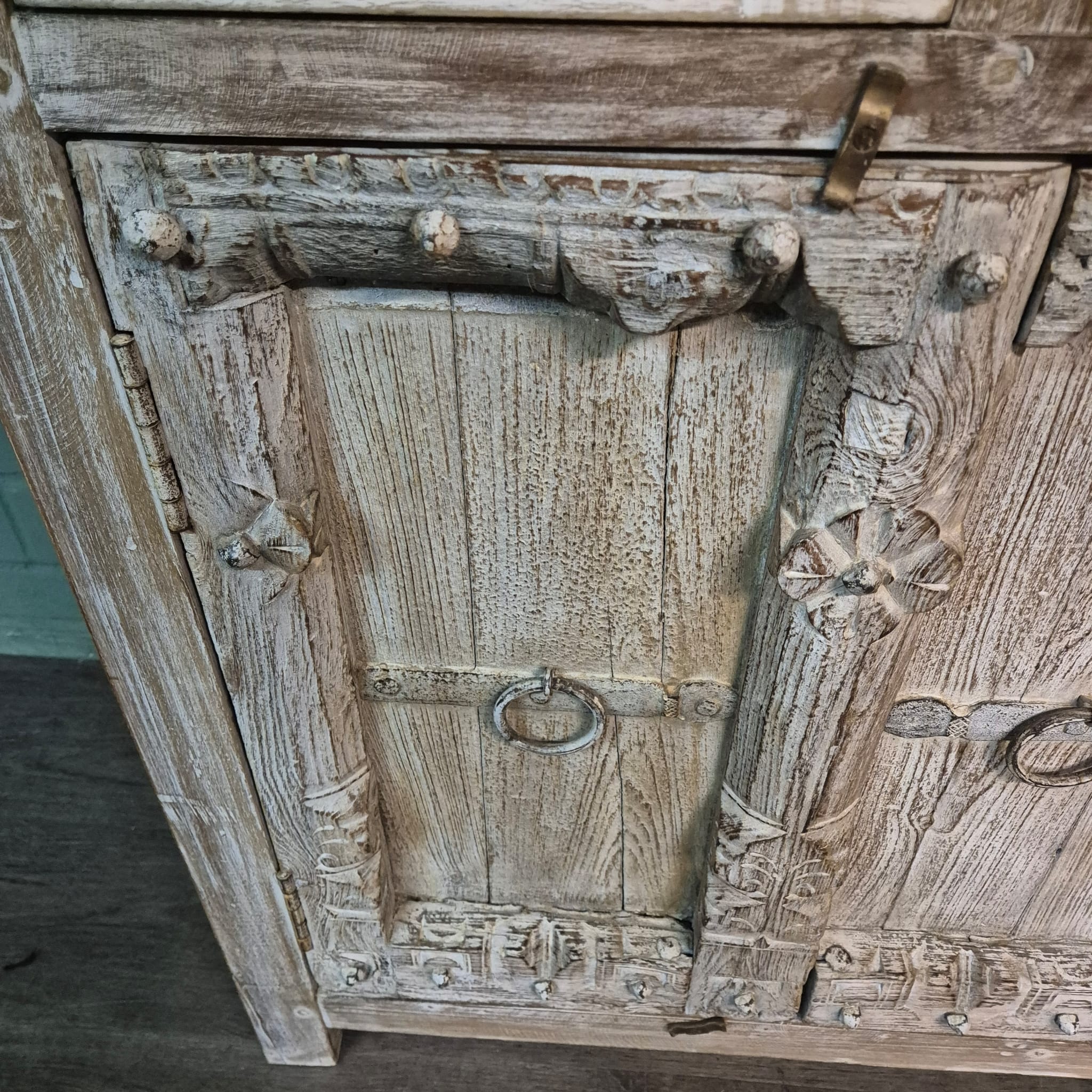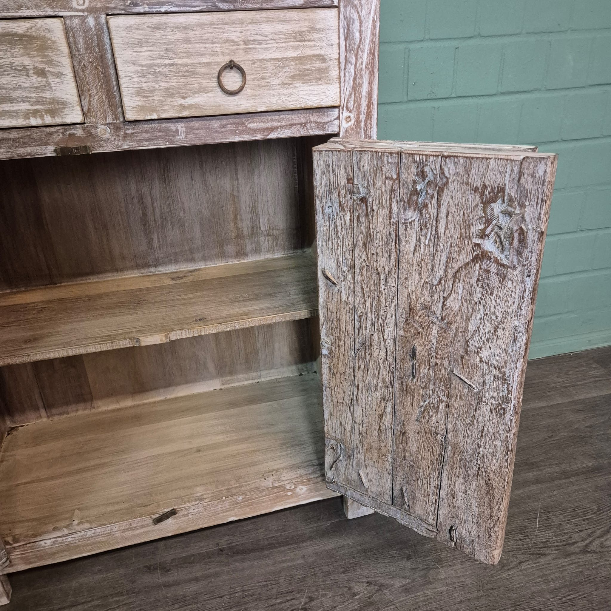 Dieses aufwendig gestaltete Sideboard aus Massivholz (Shabby-Chic Optik) erhält seine besondere Wirkung durch natürliche Unregelmäßigkeiten im Holz. Diese entstehen durch das verwendete Massivholz mit seinen verschiedenen Strukturen, welche diesem Stück einen eigentümlichen Charakter verleihen und es zu einem Unikat machen. Machart und Farbton des Holzes tragen sehr zum optischen Wert dieses Möbels bei, das sowohl dekorative Möglichkeiten als auch genügend Stauraum bietet.