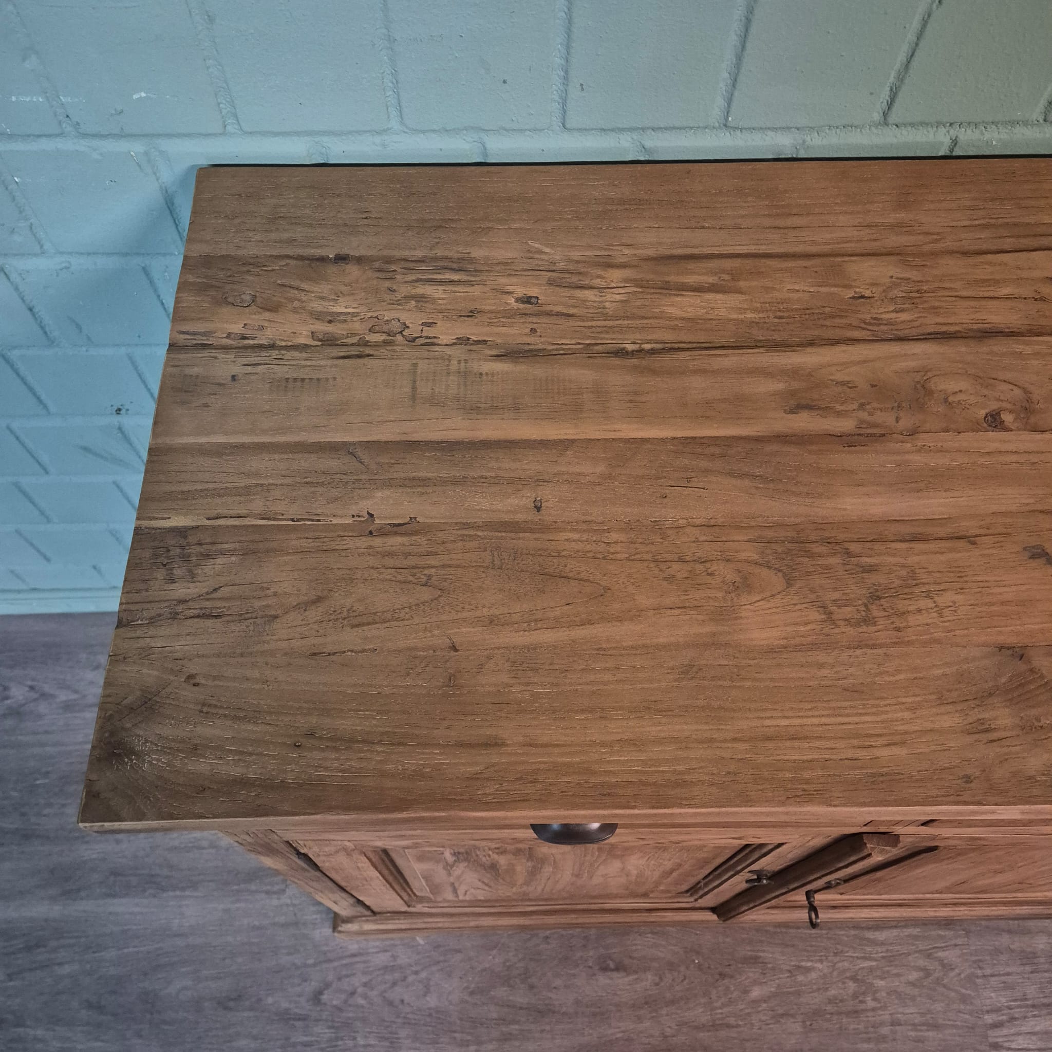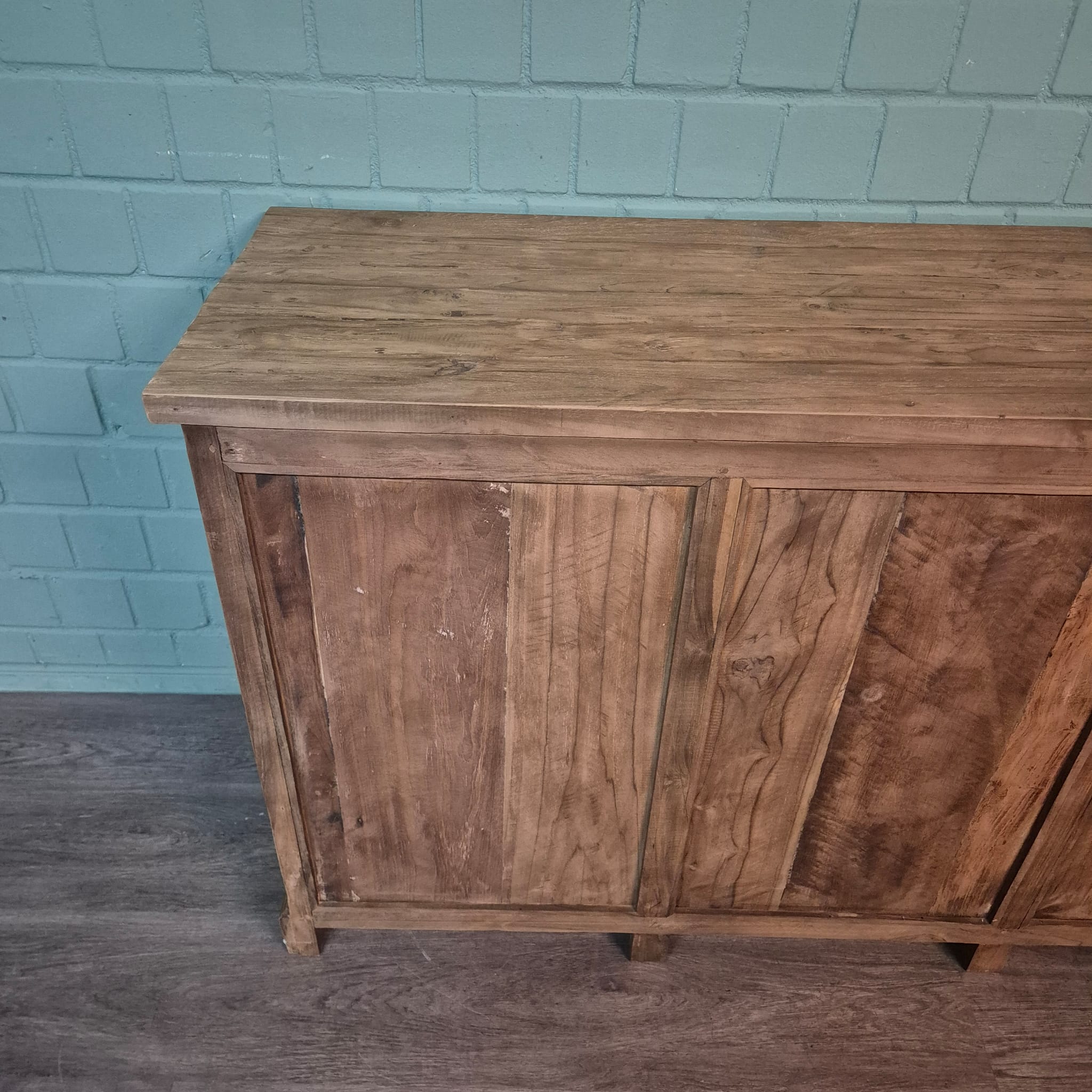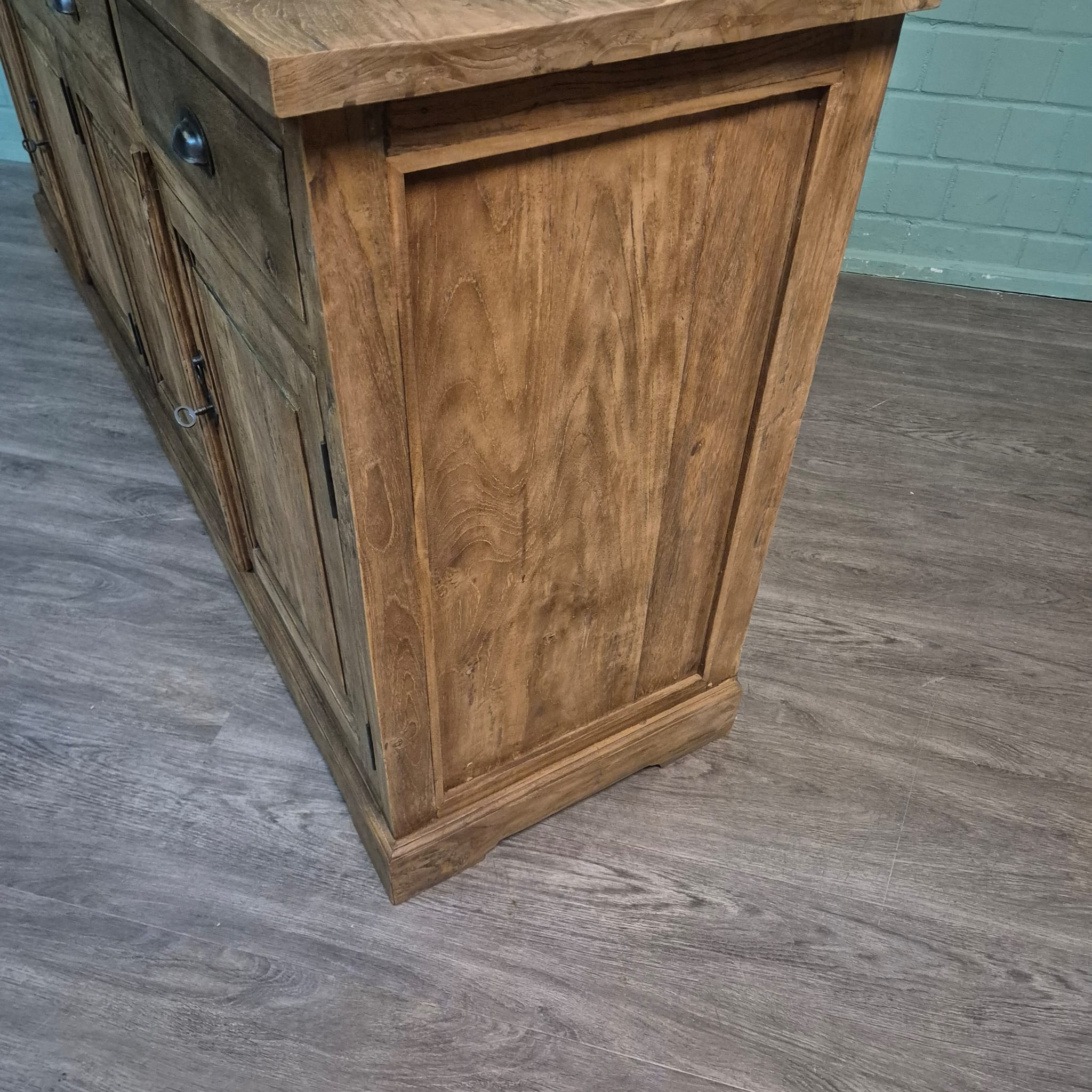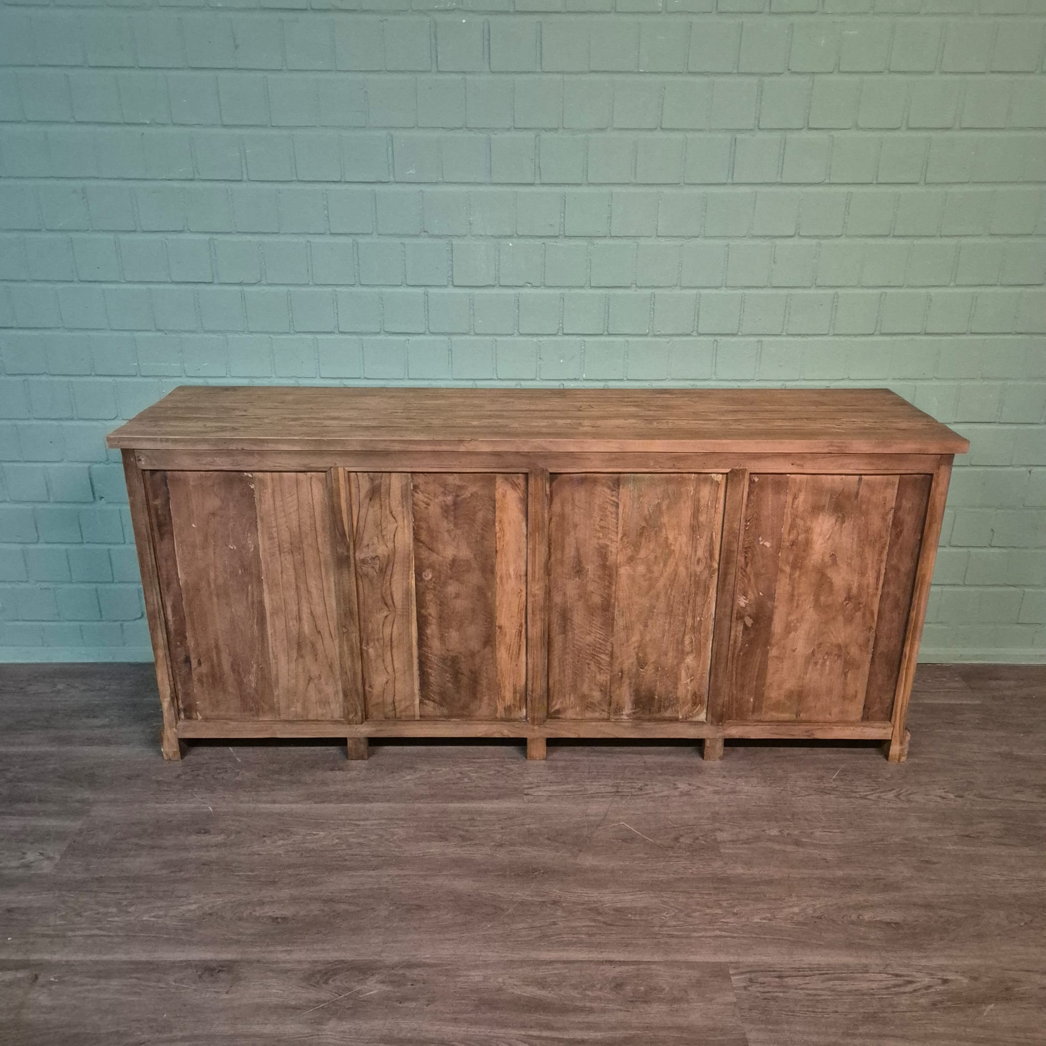 Dieses aufwendig gestaltete Sideboard aus massiv Teakholz (recycelt) erhält seine besondere Wirkung durch natürliche Unregelmäßigkeiten im Holz. Diese entstehen durch das verwendete Edelholz mit seinen verschiedenen Strukturen, welche diesem Stück einen eigentümlichen Charakter verleihen und es zu einem Unikat machen. Machart und Farbton des Holzes tragen sehr zum optischen Wert dieses Möbels bei, das sowohl dekorative Möglichkeiten als auch genügend Stauraum bietet.