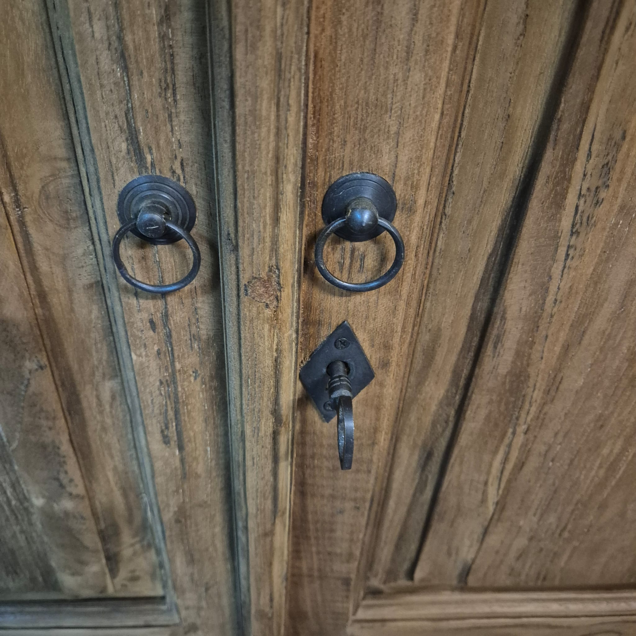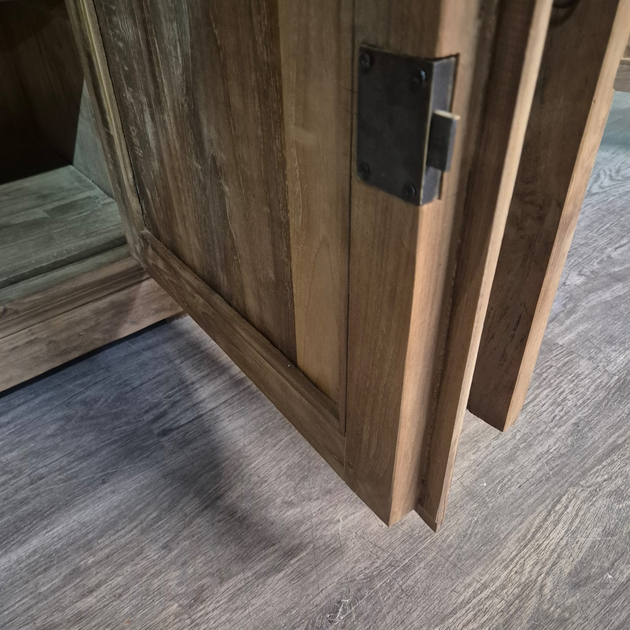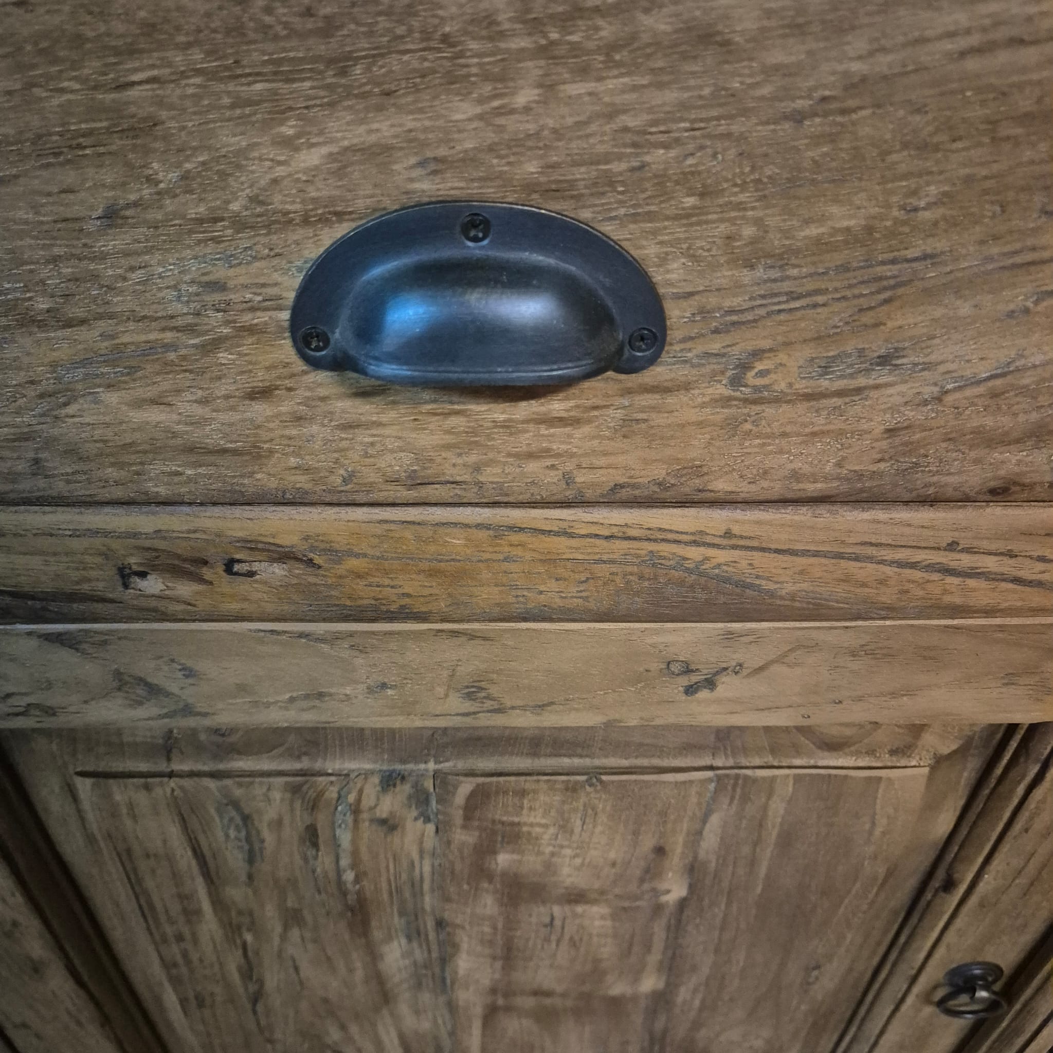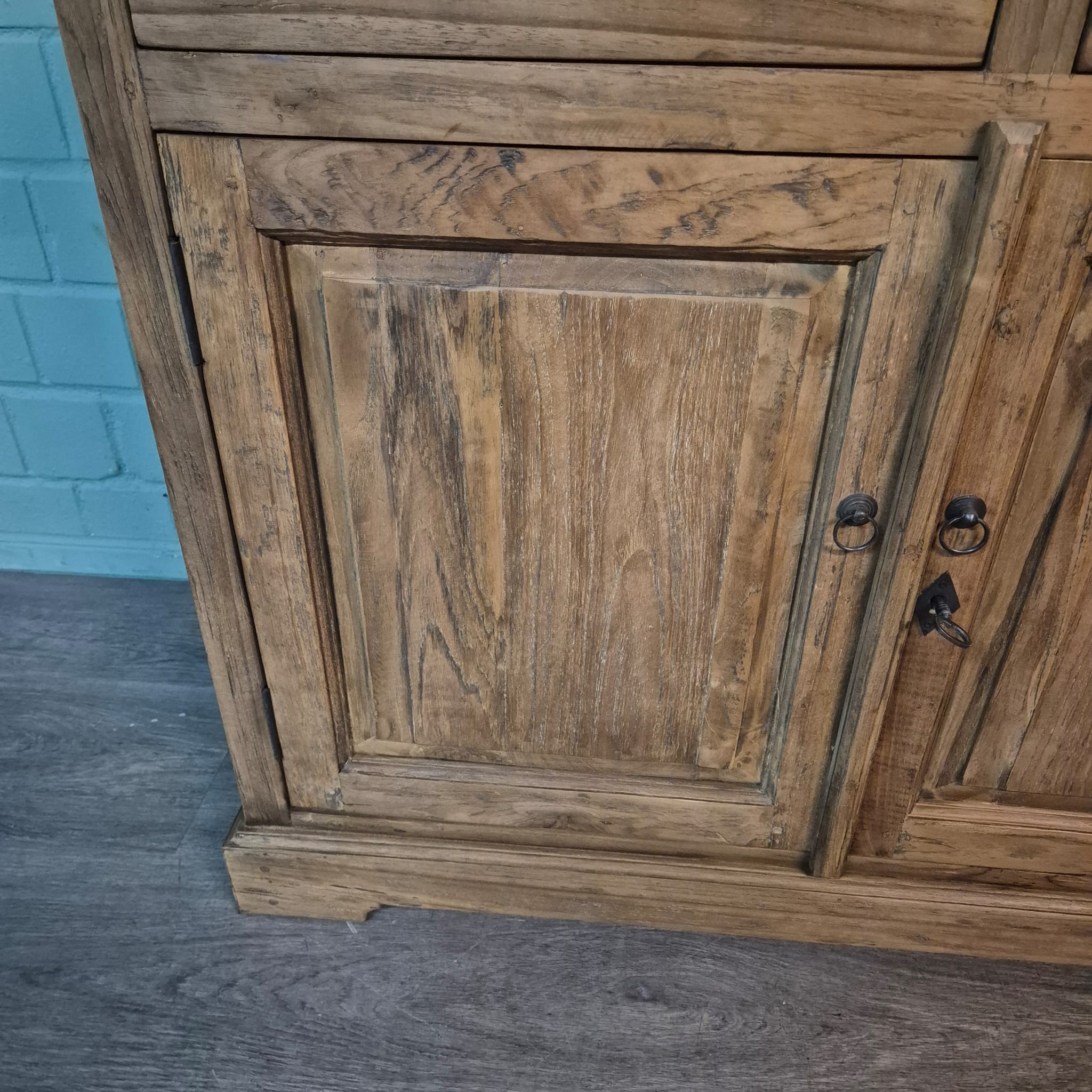 Dieses aufwendig gestaltete Sideboard aus massiv Teakholz (recycelt) erhält seine besondere Wirkung durch natürliche Unregelmäßigkeiten im Holz. Diese entstehen durch das verwendete Edelholz mit seinen verschiedenen Strukturen, welche diesem Stück einen eigentümlichen Charakter verleihen und es zu einem Unikat machen. Machart und Farbton des Holzes tragen sehr zum optischen Wert dieses Möbels bei, das sowohl dekorative Möglichkeiten als auch genügend Stauraum bietet.