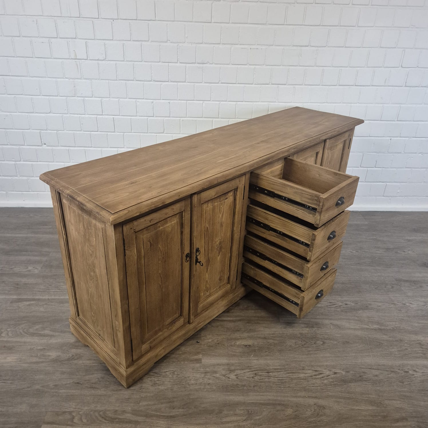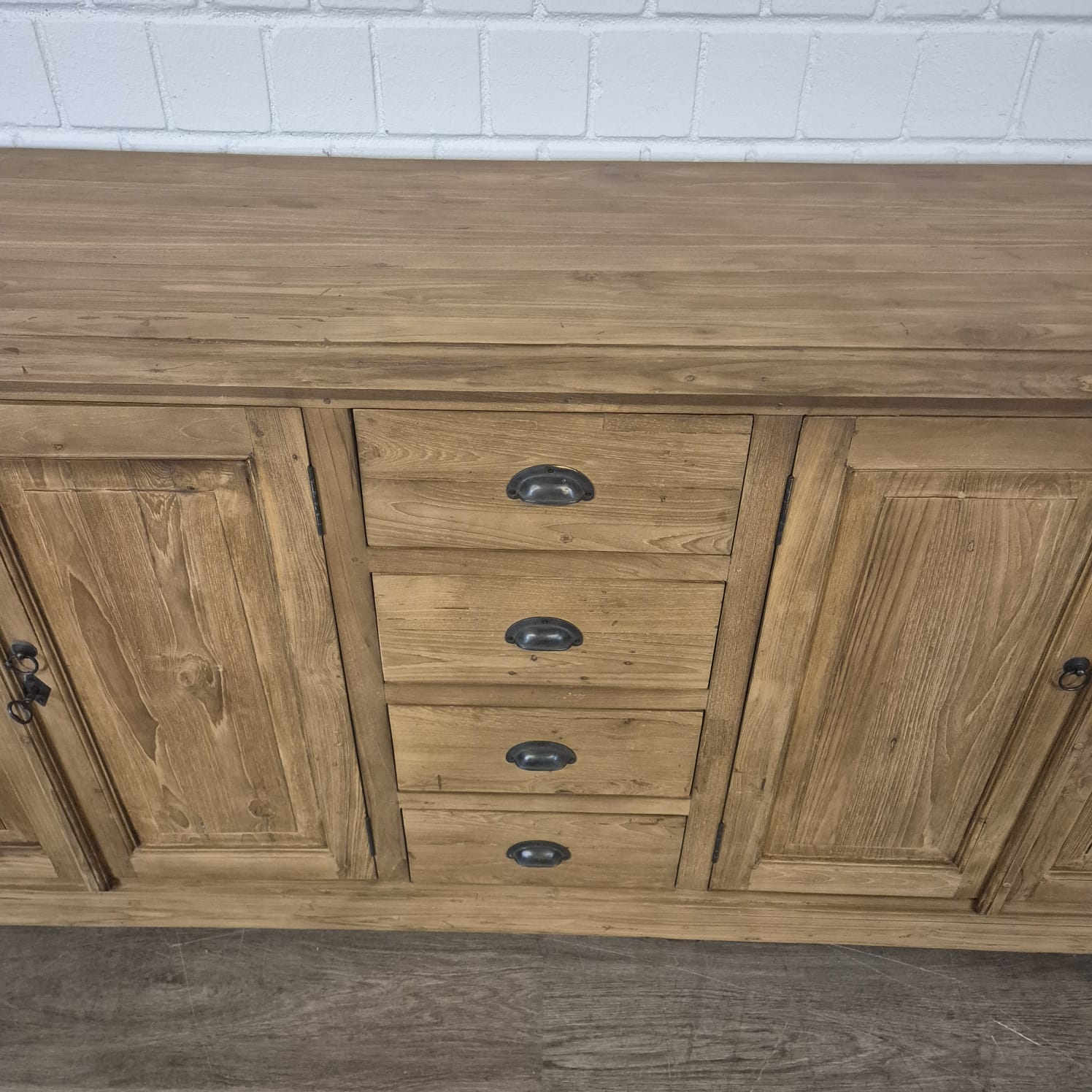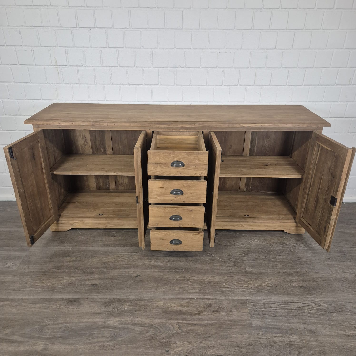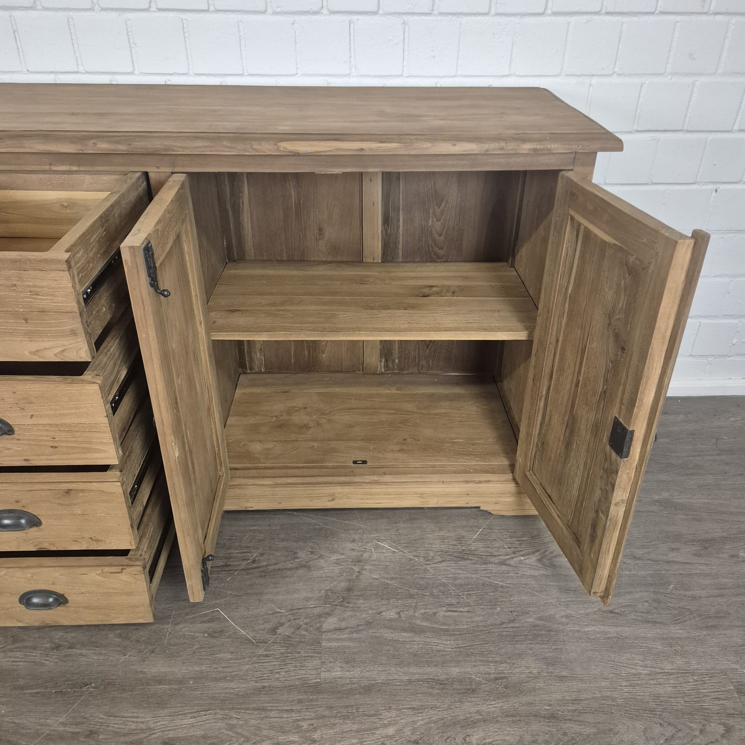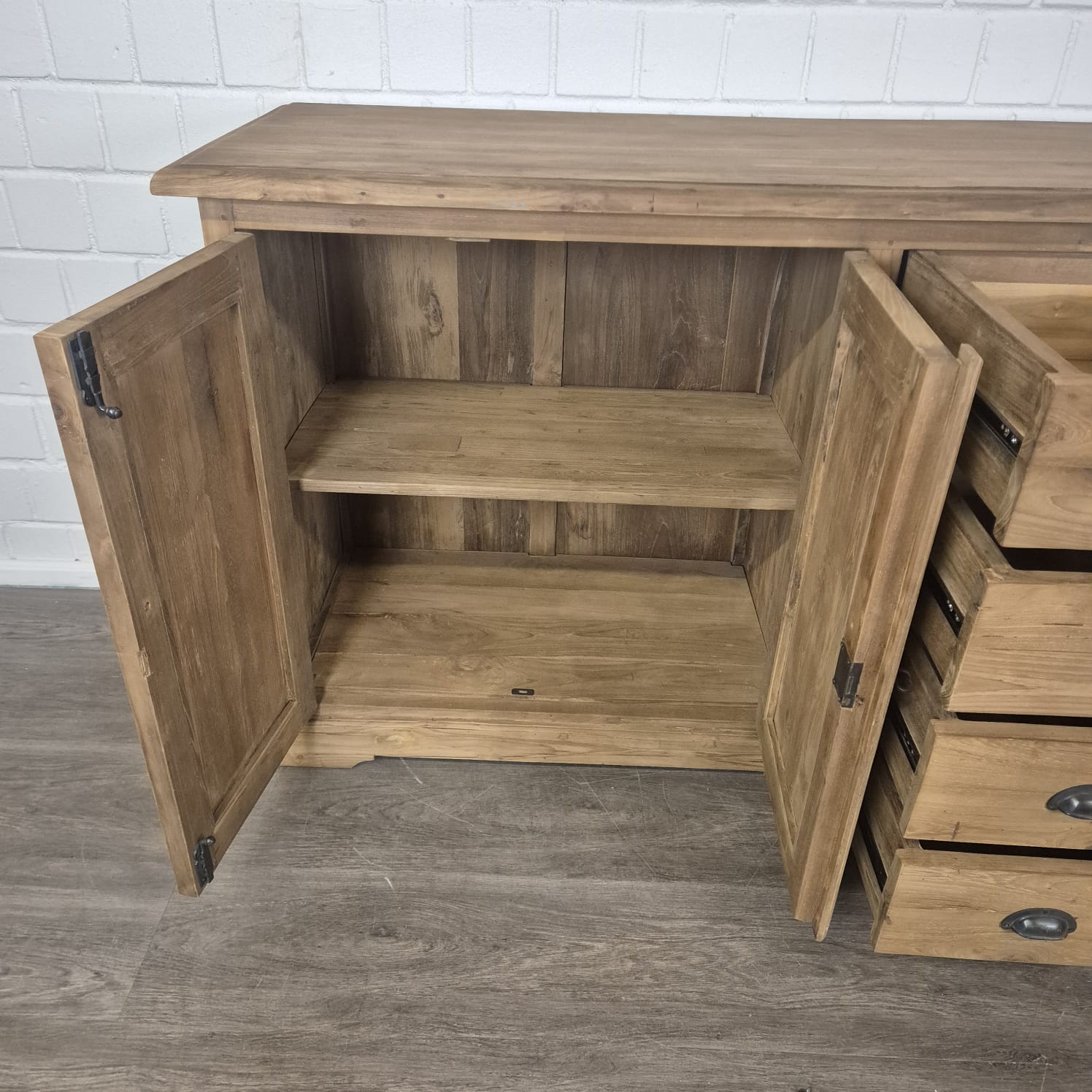 Dieses modern gestaltete Sideboard aus massiv Teakholz (recycelt) erhält seine besondere Wirkung durch natürliche Unregelmäßigkeiten im Holz. Diese entstehen durch das verwendete Edelholz mit seinen verschiedenen Strukturen, welche diesem Stück einen eigentümlichen Charakter verleihen und es zu einem Unikat machen. Machart und Farbton des Holzes tragen sehr zum optischen Wert dieses Möbels bei, das sowohl dekorative Möglichkeiten als auch genügend Stauraum bietet.