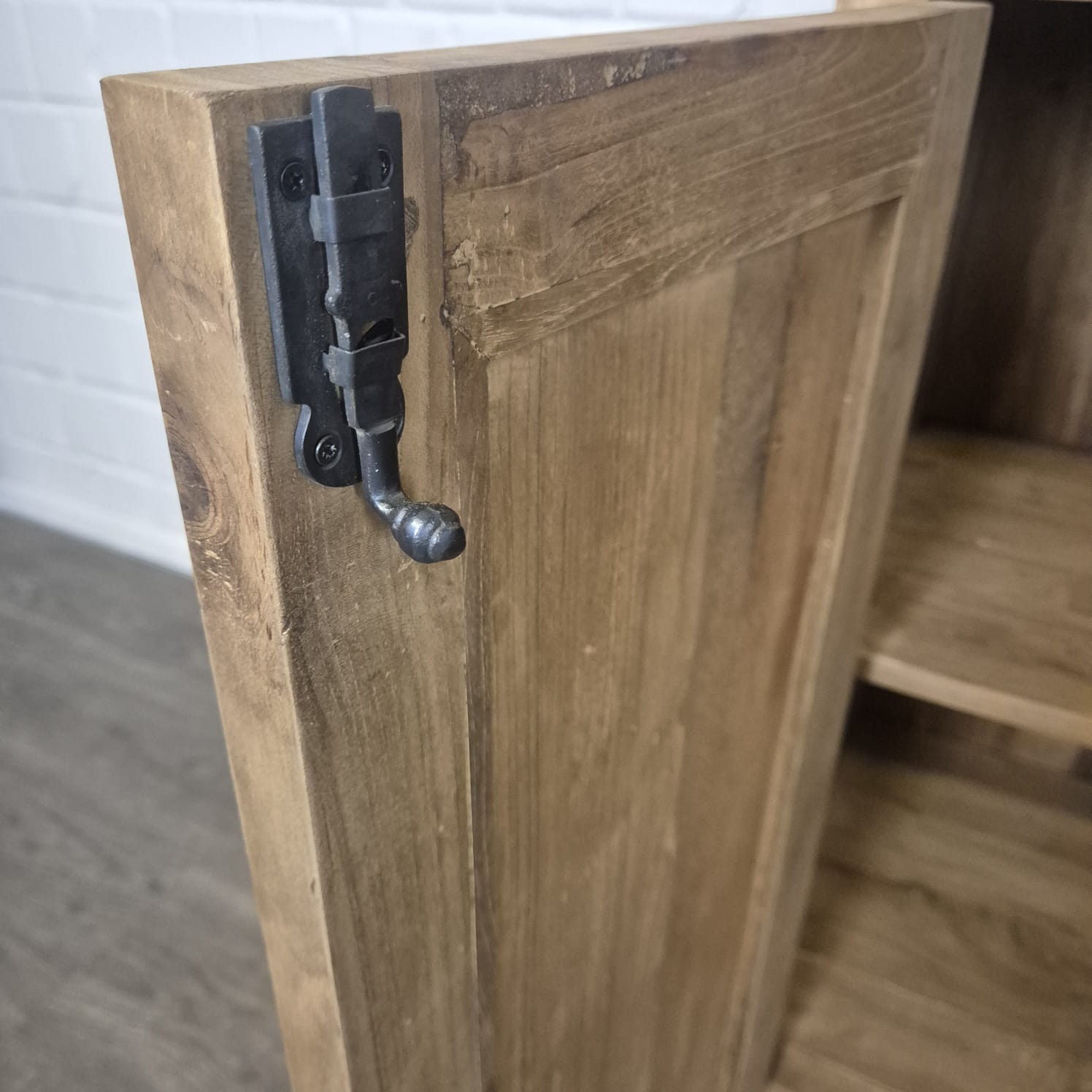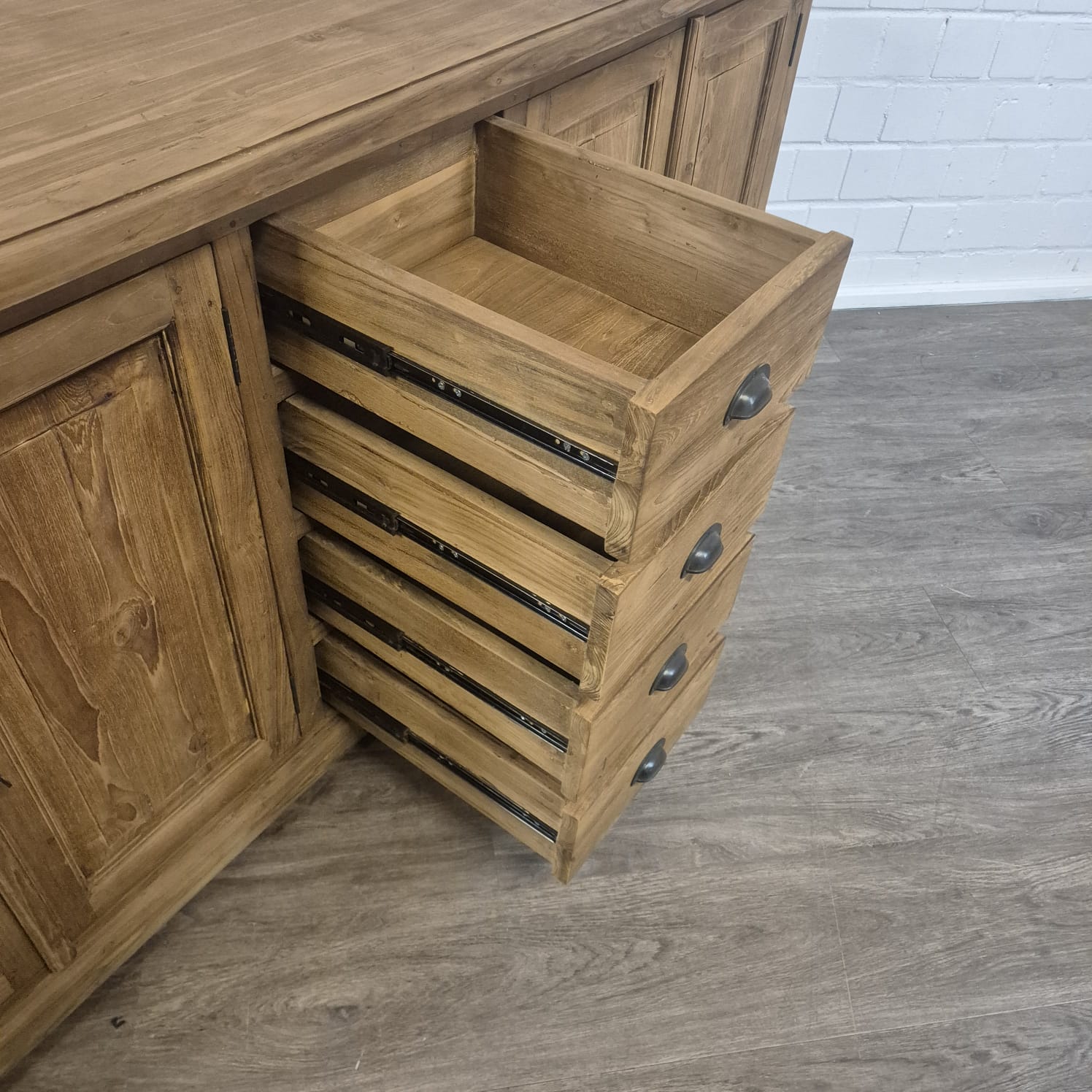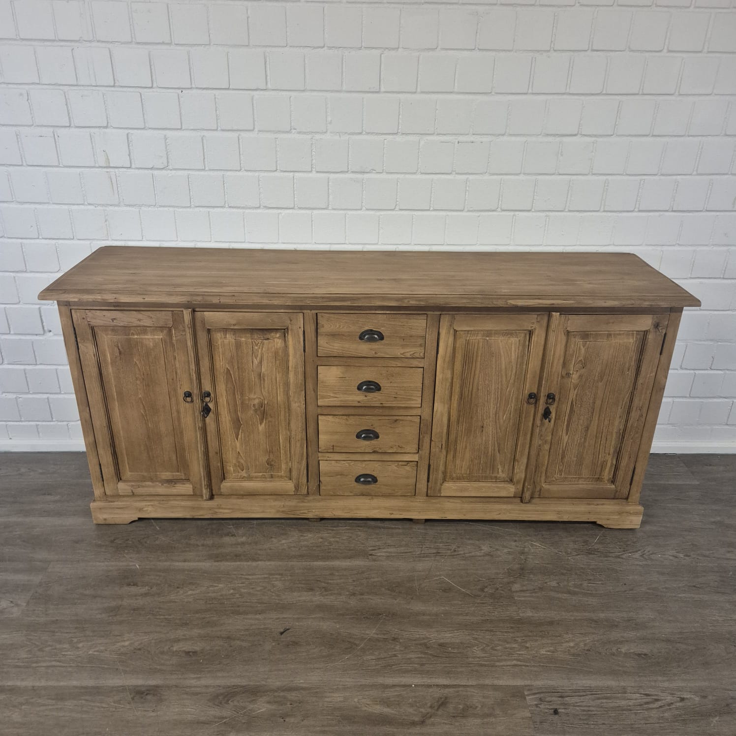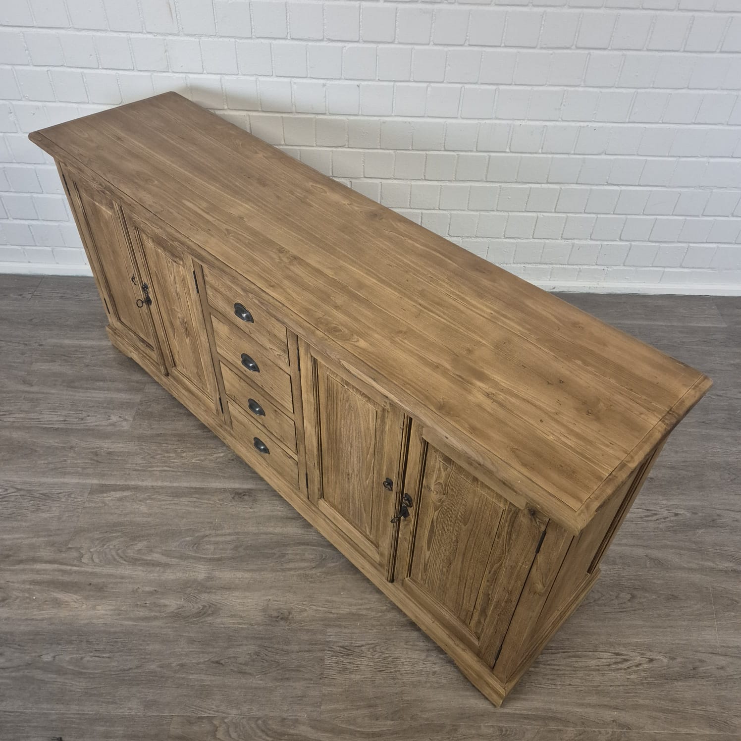 Dieses modern gestaltete Sideboard aus massiv Teakholz (recycelt) erhält seine besondere Wirkung durch natürliche Unregelmäßigkeiten im Holz. Diese entstehen durch das verwendete Edelholz mit seinen verschiedenen Strukturen, welche diesem Stück einen eigentümlichen Charakter verleihen und es zu einem Unikat machen. Machart und Farbton des Holzes tragen sehr zum optischen Wert dieses Möbels bei, das sowohl dekorative Möglichkeiten als auch genügend Stauraum bietet.