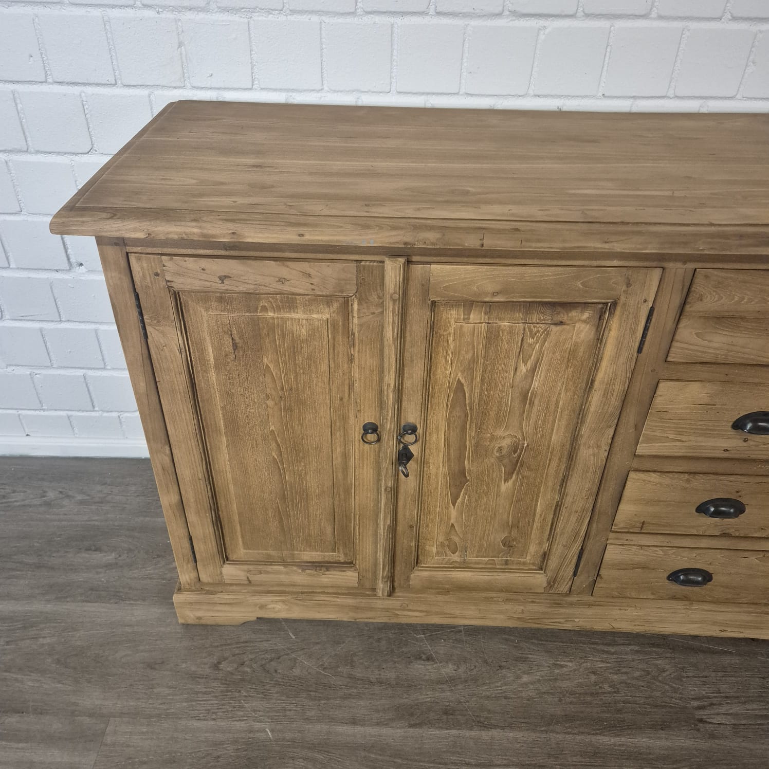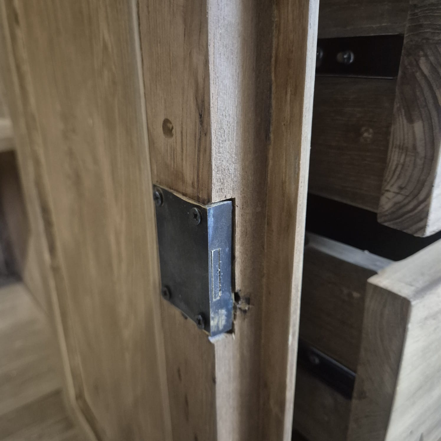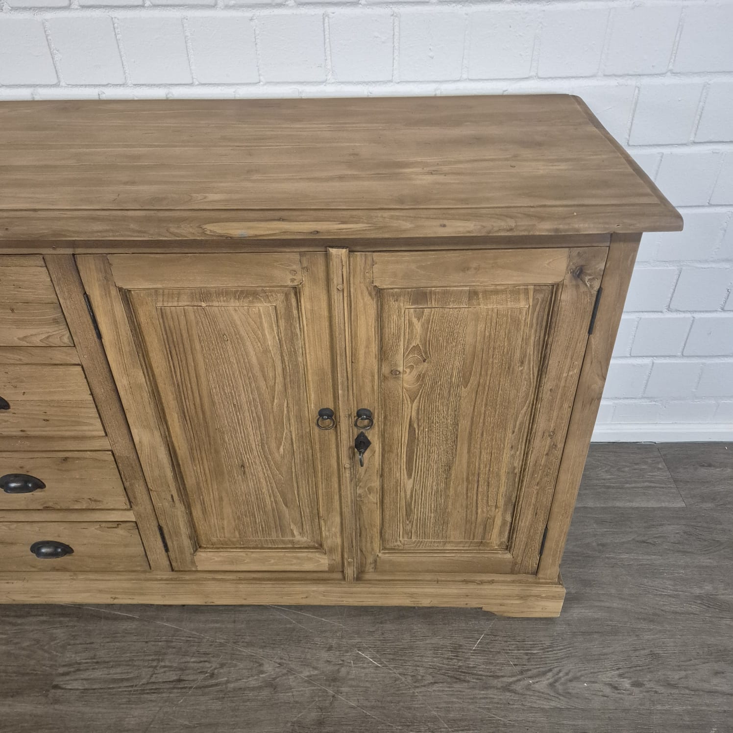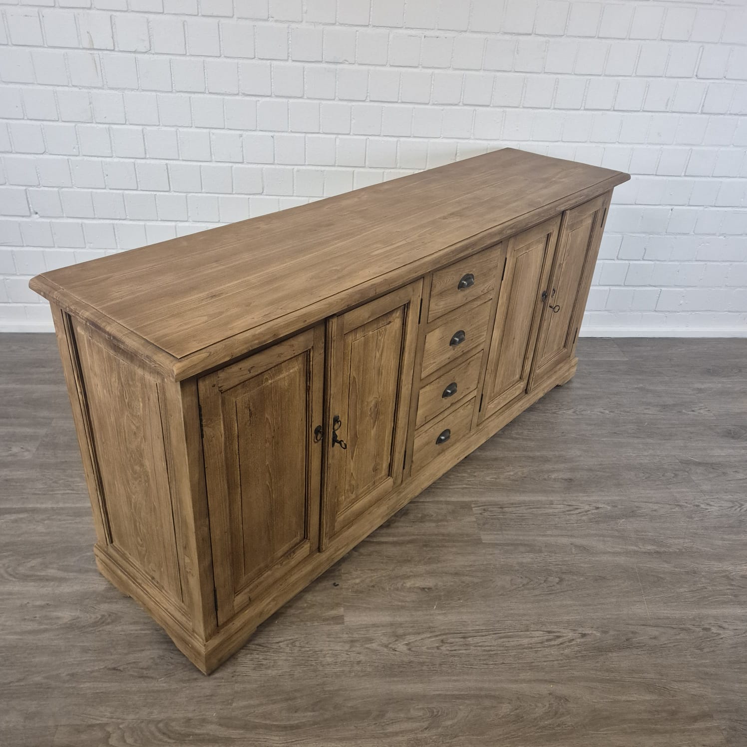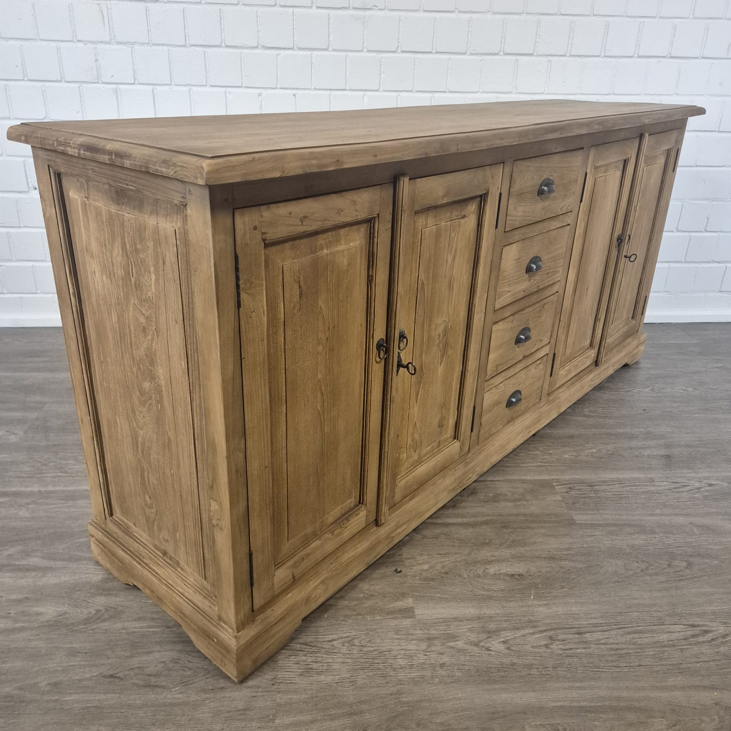 Dieses modern gestaltete Sideboard aus massiv Teakholz (recycelt) erhält seine besondere Wirkung durch natürliche Unregelmäßigkeiten im Holz. Diese entstehen durch das verwendete Edelholz mit seinen verschiedenen Strukturen, welche diesem Stück einen eigentümlichen Charakter verleihen und es zu einem Unikat machen. Machart und Farbton des Holzes tragen sehr zum optischen Wert dieses Möbels bei, das sowohl dekorative Möglichkeiten als auch genügend Stauraum bietet.