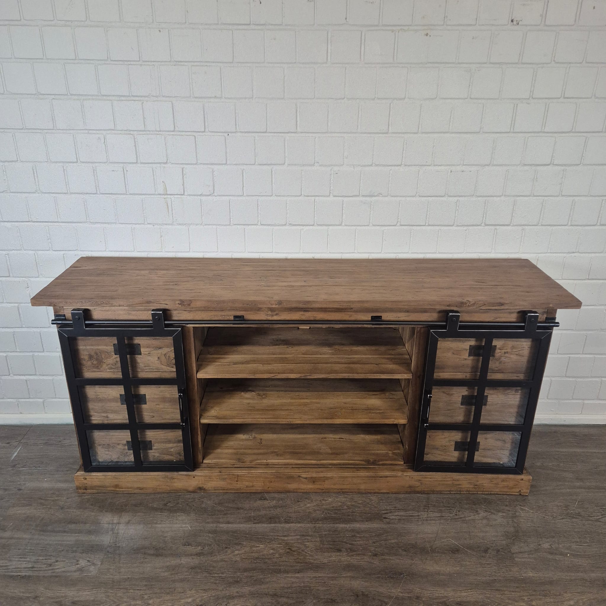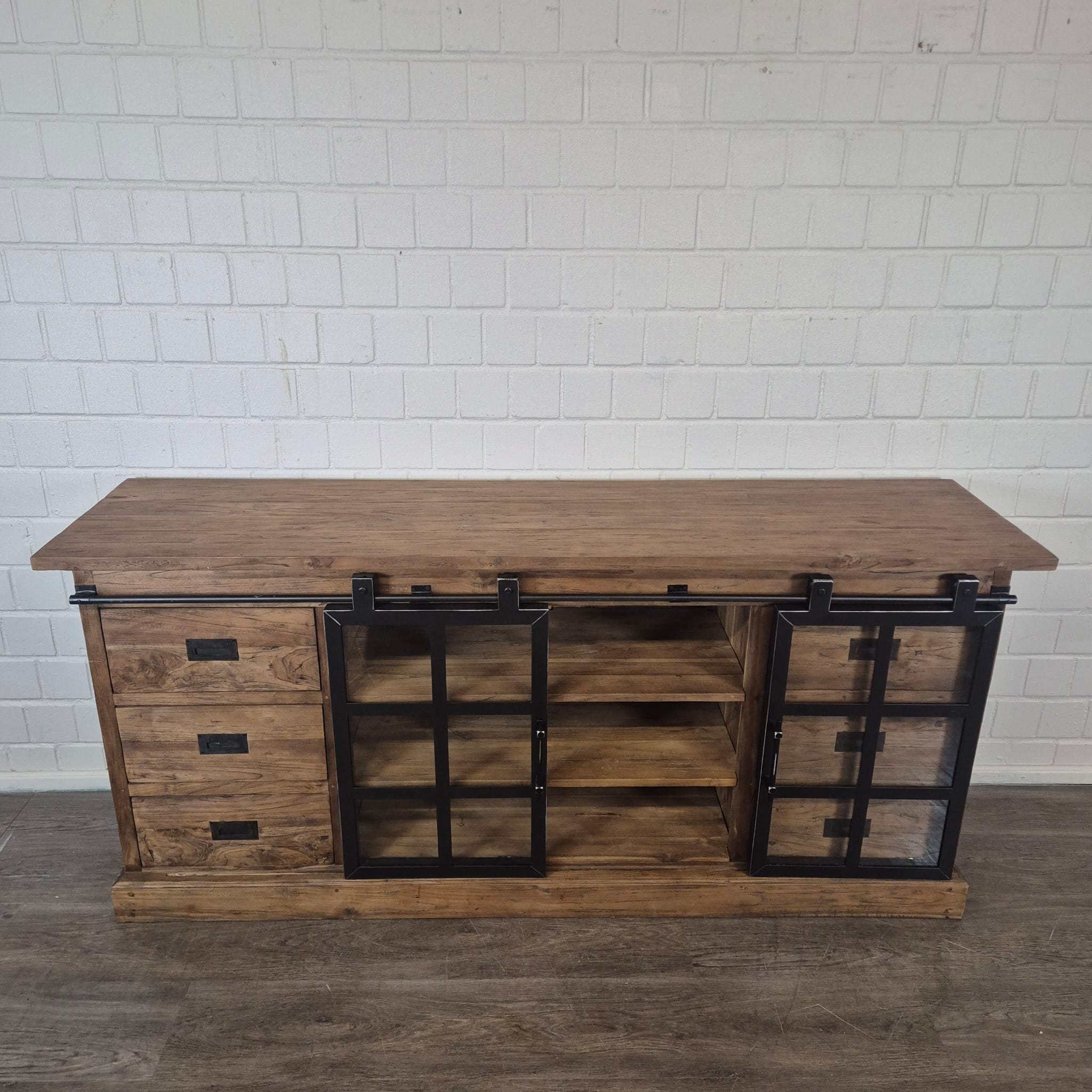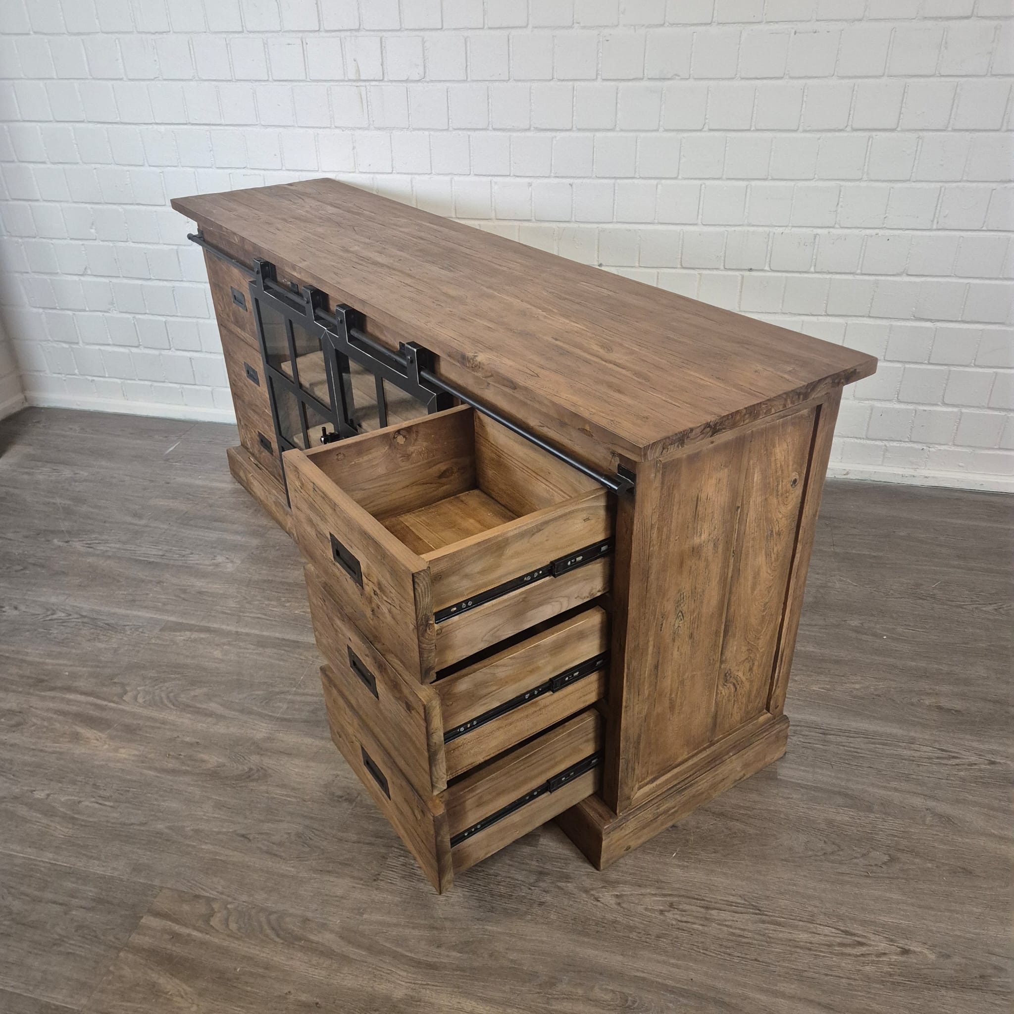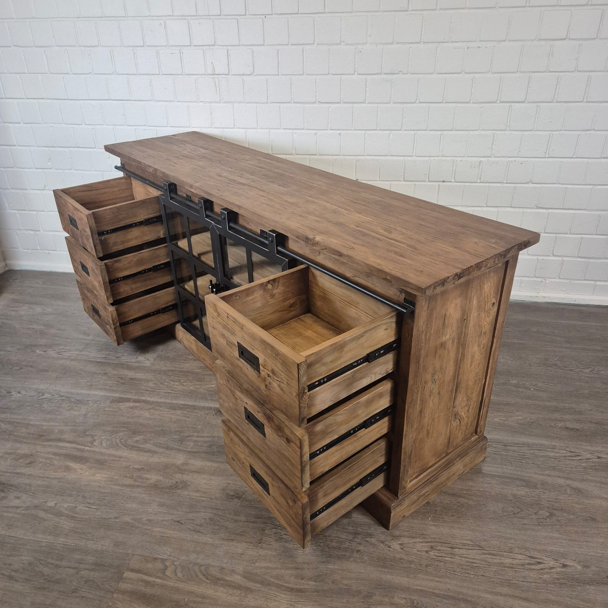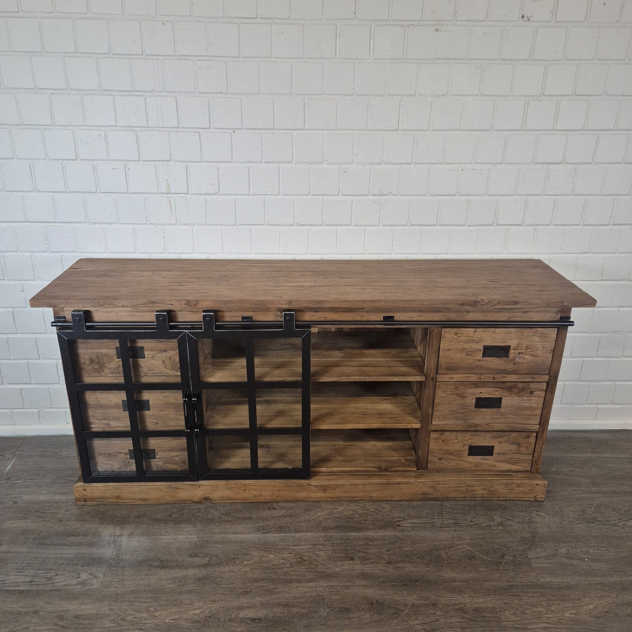 Dieses einzigartig gestaltete Sideboard aus massiv Teakholz (recycelt) und Metall erhält seine besondere Wirkung durch natürliche Unregelmäßigkeiten im Holz. Diese entstehen durch das verwendete Edelholz mit seinen verschiedenen Strukturen, welche diesem Stück einen eigentümlichen Charakter verleihen und es zu einem Unikat machen. Machart und Farbton des Holzes tragen sehr zum optischen Wert dieses Möbels bei, das sowohl dekorative Möglichkeiten als auch genügend Stauraum bietet.