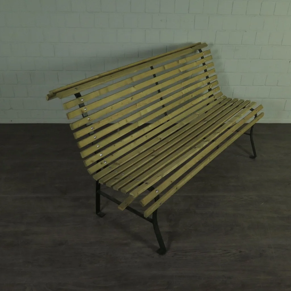 Km klassischen Design hergestellte Parkbank aus massiv Kiefer (imprägniert) und Stahl.