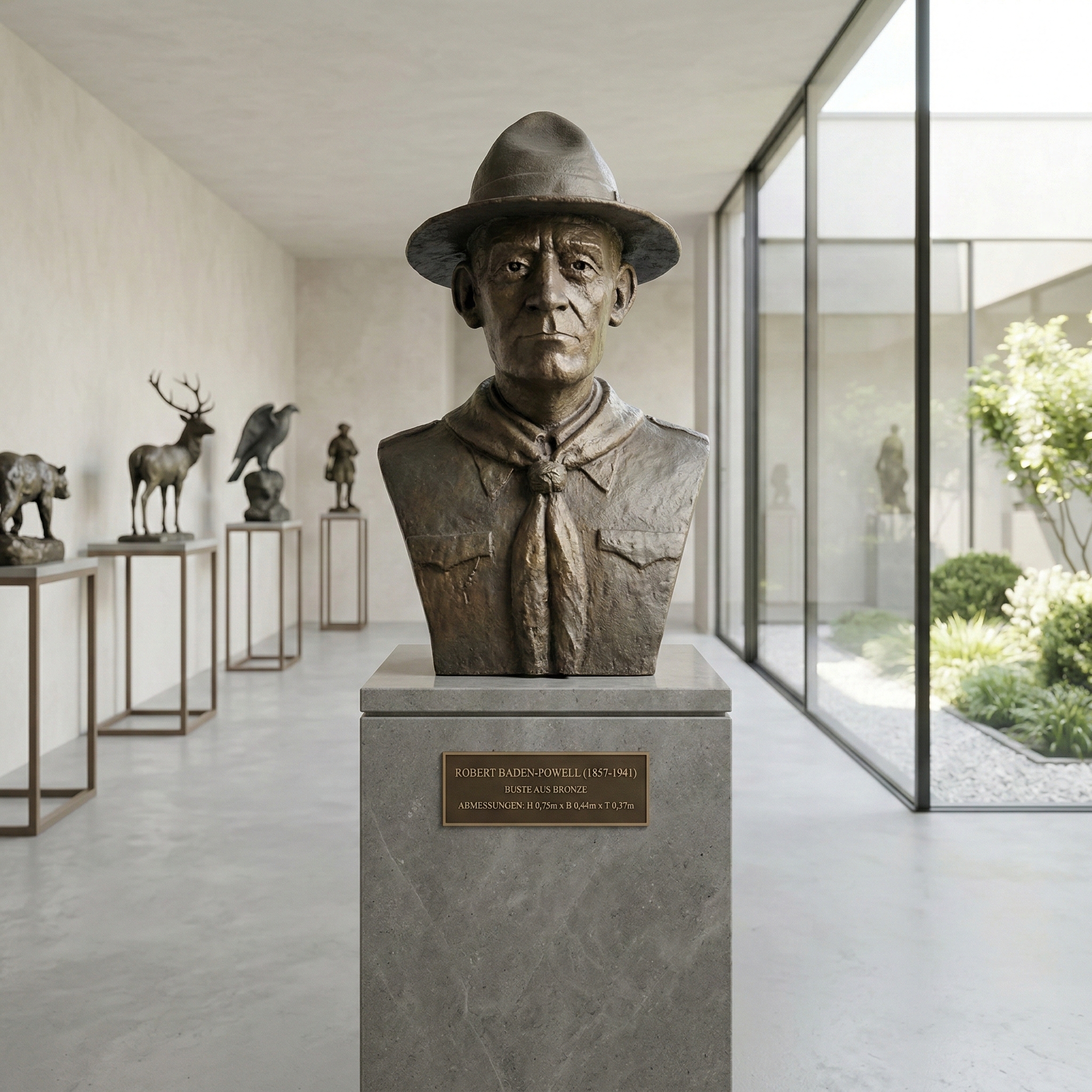 Diese individuelle Bronze-Büste fängt den Geist der Pfadfinderbewegung ein. Die detailreiche Darstellung zeigt einen jungen Mann mit charakteristischen Hut und Halstuch. Die Skulptur steht auf einem Steinsockel, was ihre Individualität betont. Gefertigt aus massiver Bronze, strahlt sie Beständigkeit und Verbundenheit aus – Werte, die in der Pfadfinderei hochgehalten werden. Ein besonderes Dekorationsstück für jeden, der sich mit den Idealen der Pfadfinder identifiziert. Stückpreis.