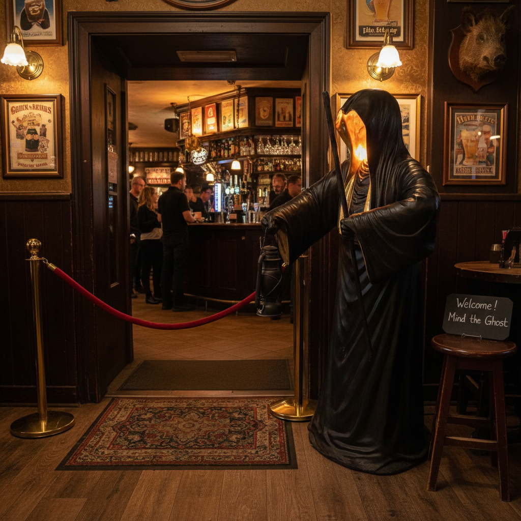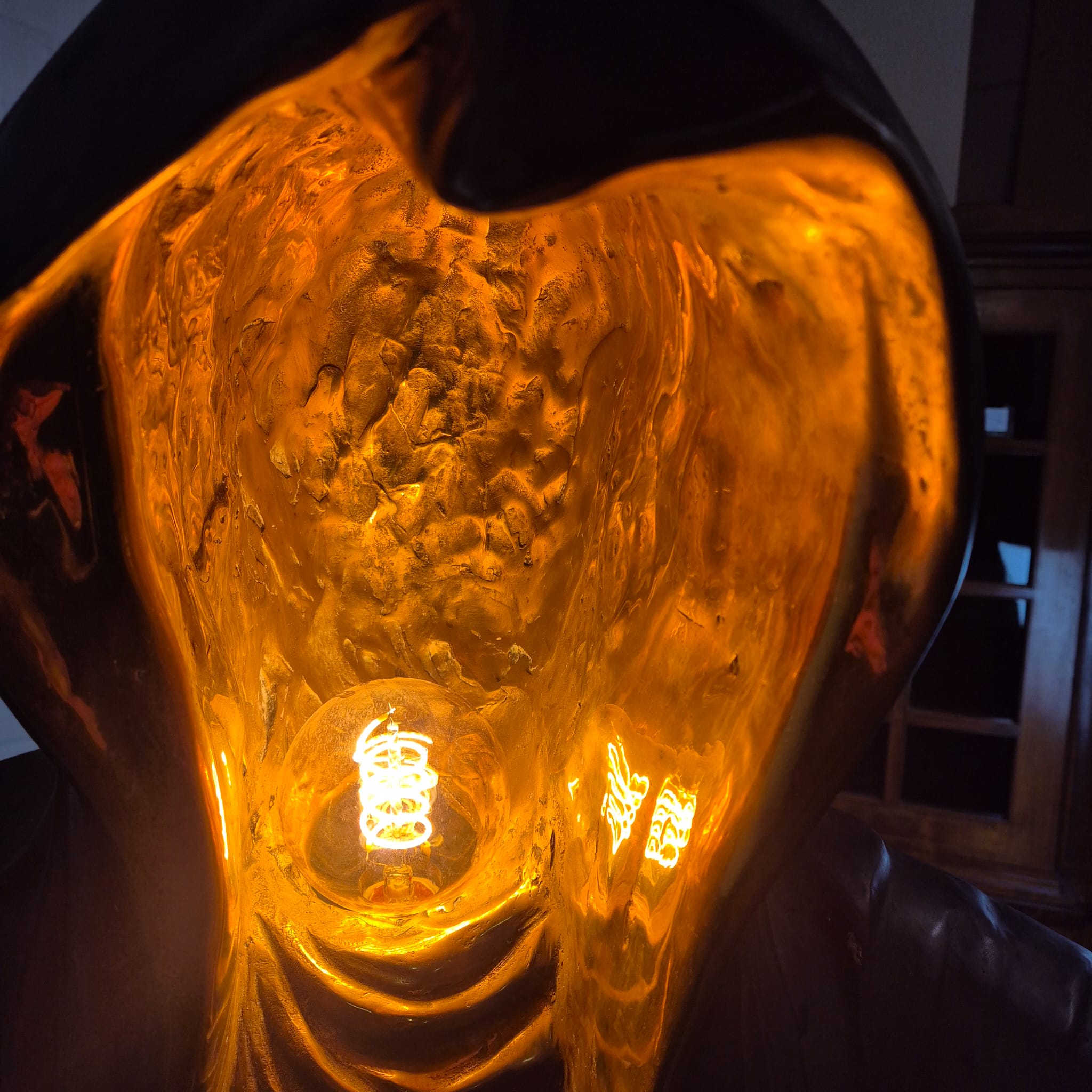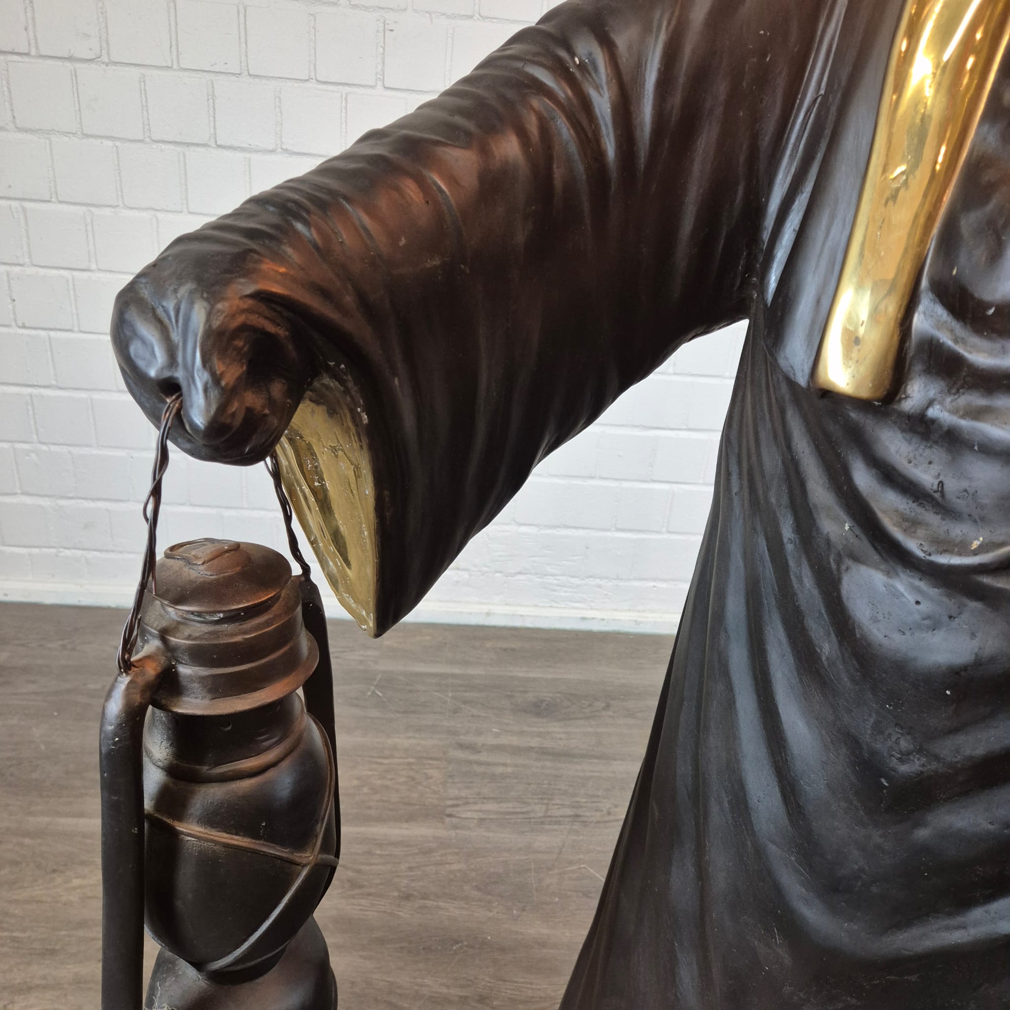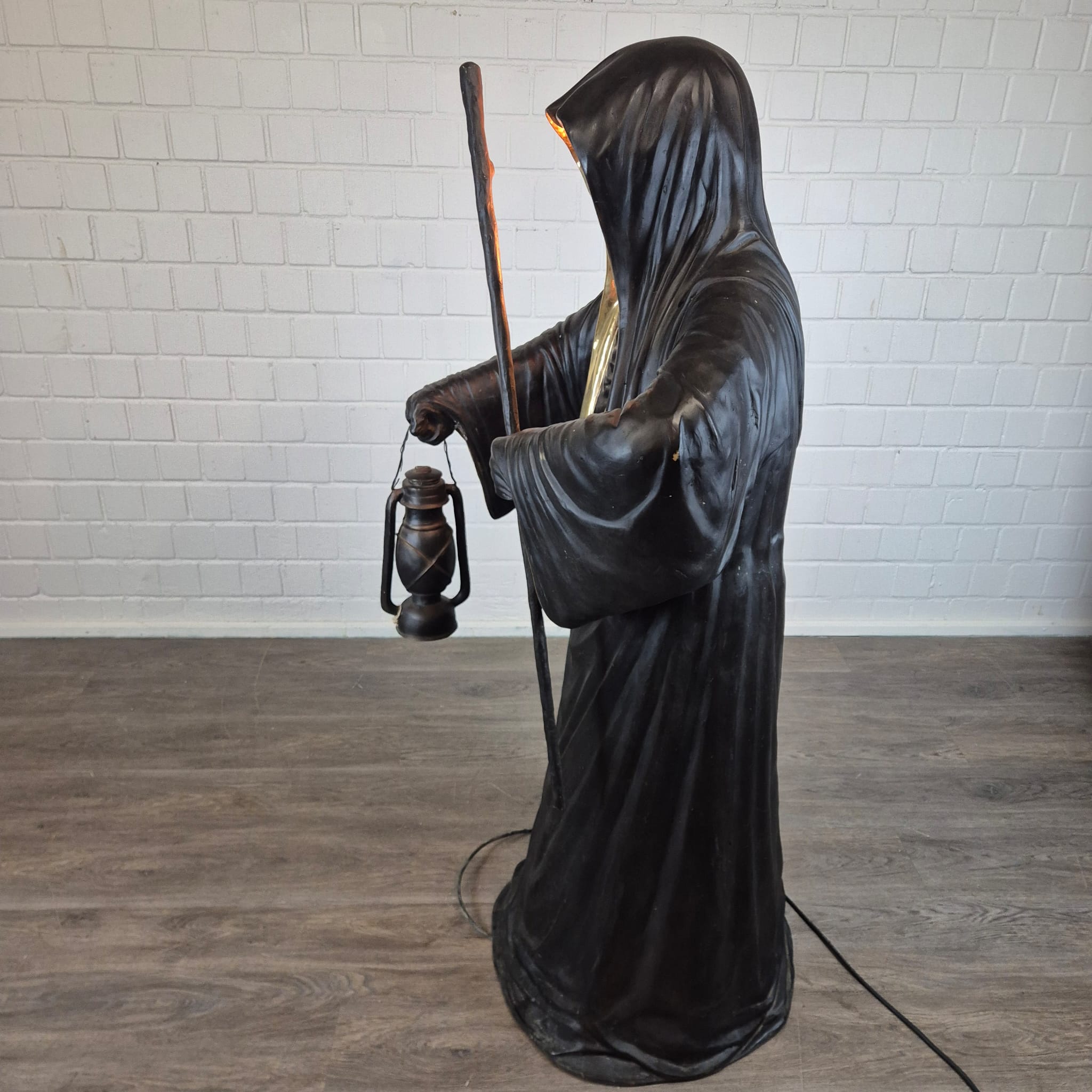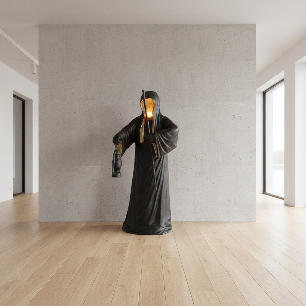 Die Skulptur zeigt eine verhüllte Gestalt in fließender Robe, die in der einen Hand einen Wanderstab und in der anderen eine klassische Laterne hält. Das absolute Highlight ist die integrierte Beleuchtung im Inneren der Kapuze: Durch die goldfarbene Innenbeschichtung entsteht ein warmer, fast überirdischer Schein, der das „Gesicht“ der Figur im Verborgenen lässt und die Umgebung in ein sanftes Licht taucht.