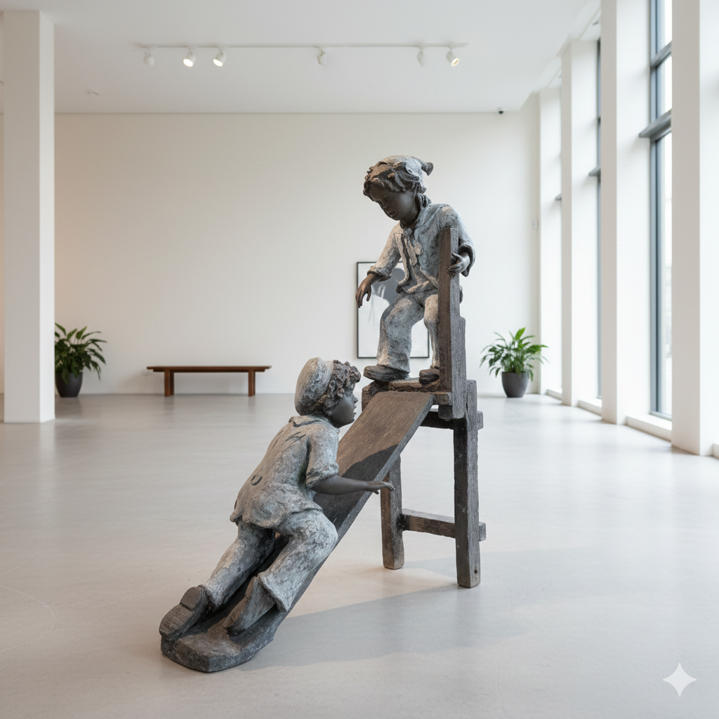 Detailgetreue und formschöne Darstellung von zwei mit einer selbstgebauten Rutsche spielenden Kindern aus Bronze. Die ca. 80 Jahre alte Skulptur befindet sich in einem sehr guten Zustand und weist nur minimale Gebrauchsspuren auf.
