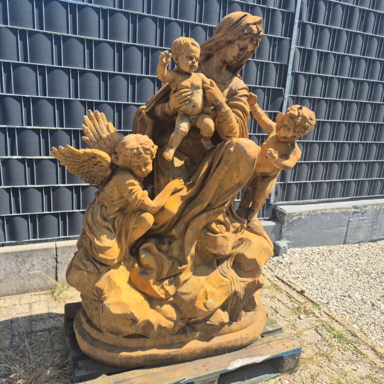 Verleihen Sie Ihrem Garten, Hof oder einem repräsentativen Innenbereich eine Aura der Erhabenheit und zeitlosen Schönheit mit dieser beeindruckenden Sakral-Skulptur. Dieses kunstvolle Werk, das eine Madonna mit Kind und Putten/Engeln darstellt, ist ein wahrer Blickfang und strahlt eine tiefe spirituelle Ruhe aus.