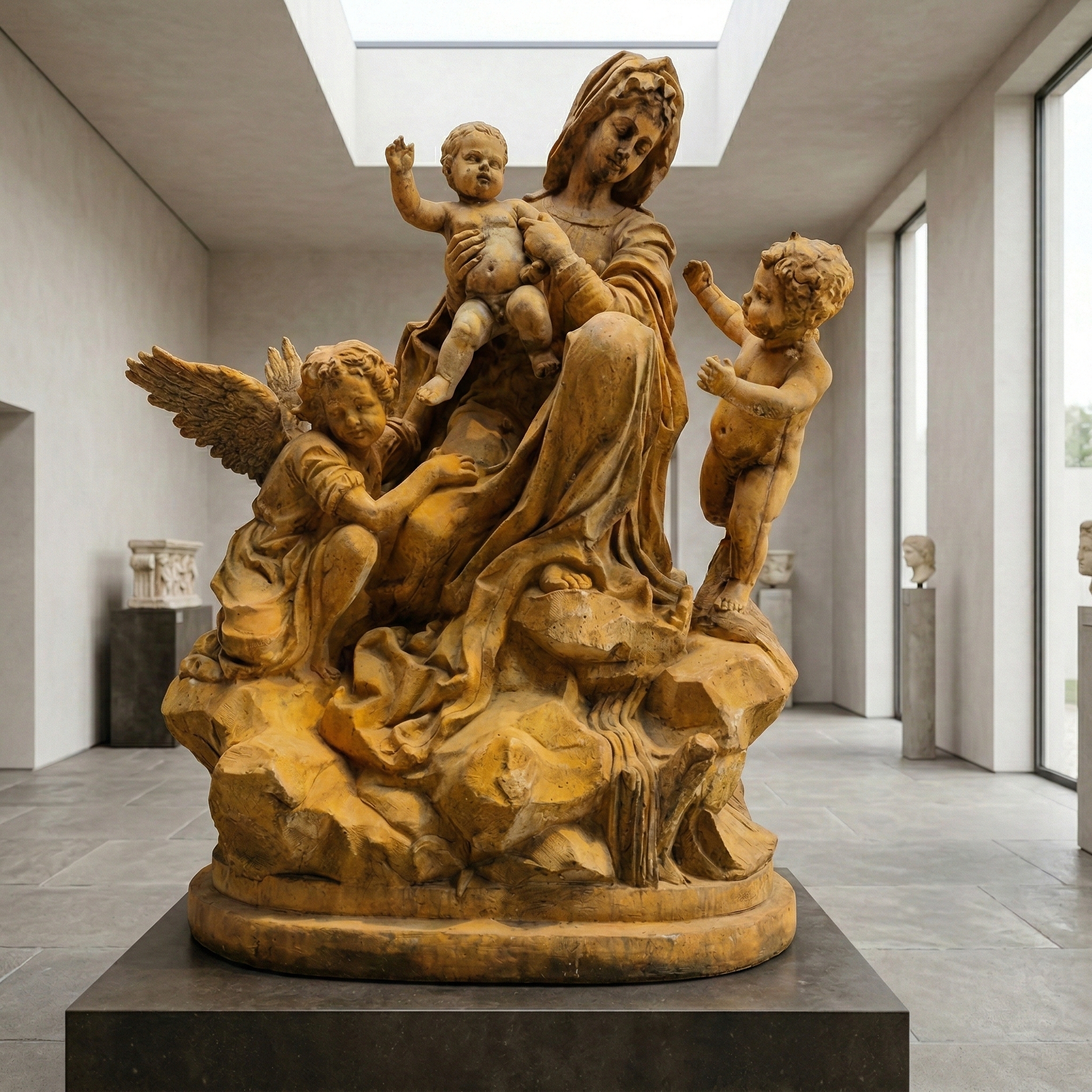 - Detaillierte Handwerkskunst: Die Darstellung der Figuren ist meisterhaft ausgeführt. Die fließenden Gewänder der Madonna, die kindlichen Gesichtszüge und die filigranen Flügel der Putten/Engel zeugen von hohem künstlerischem Können.