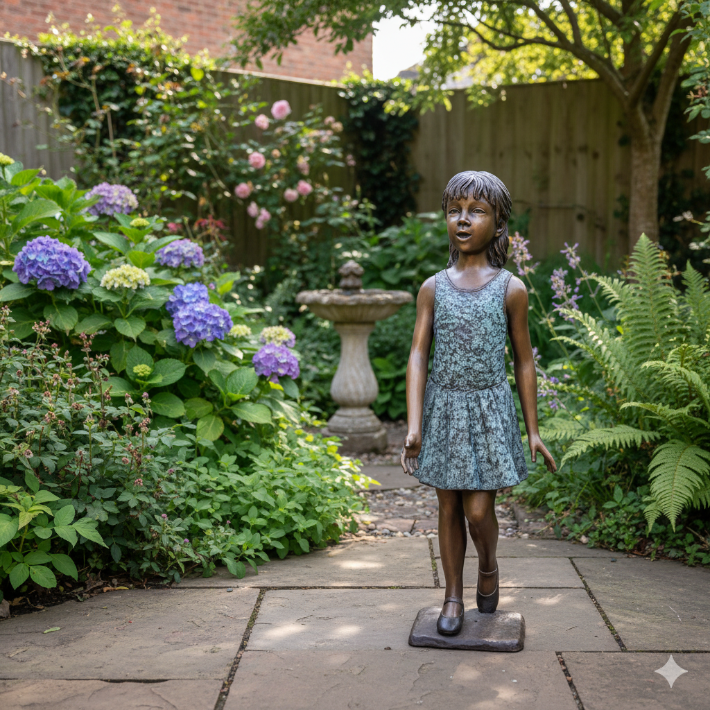 Verleihen Sie Ihrem Garten, Ihrer Terrasse oder Ihrem Innenbereich einen Hauch von Anmut und kindlicher Unschuld mit dieser bezaubernden Bronzeskulptur eines Mädchens. Dieses Kunstwerk fängt die verspielte und verträumte Haltung eines jungen Mädchens auf wunderbare Weise ein und wird garantiert zum Blickfang.