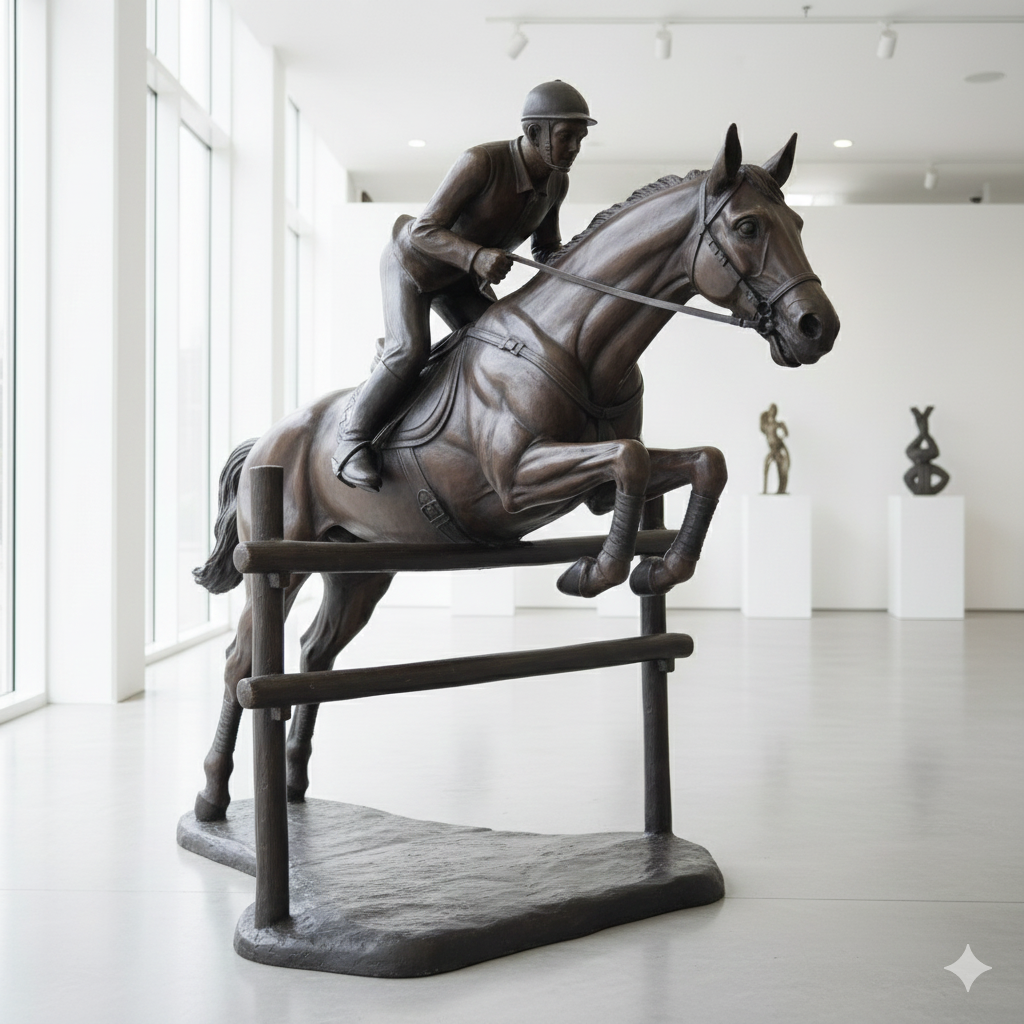 Detailgetreue und formschöne Darstellung von einem Springreiter mit Pferd, hergestellt aus Bronze.