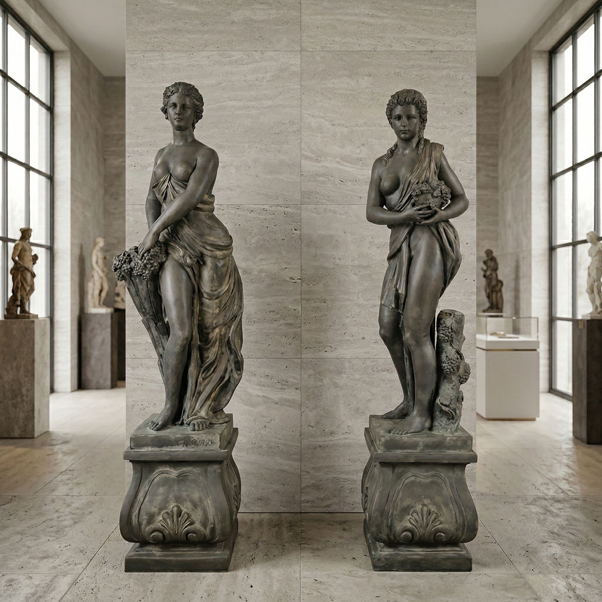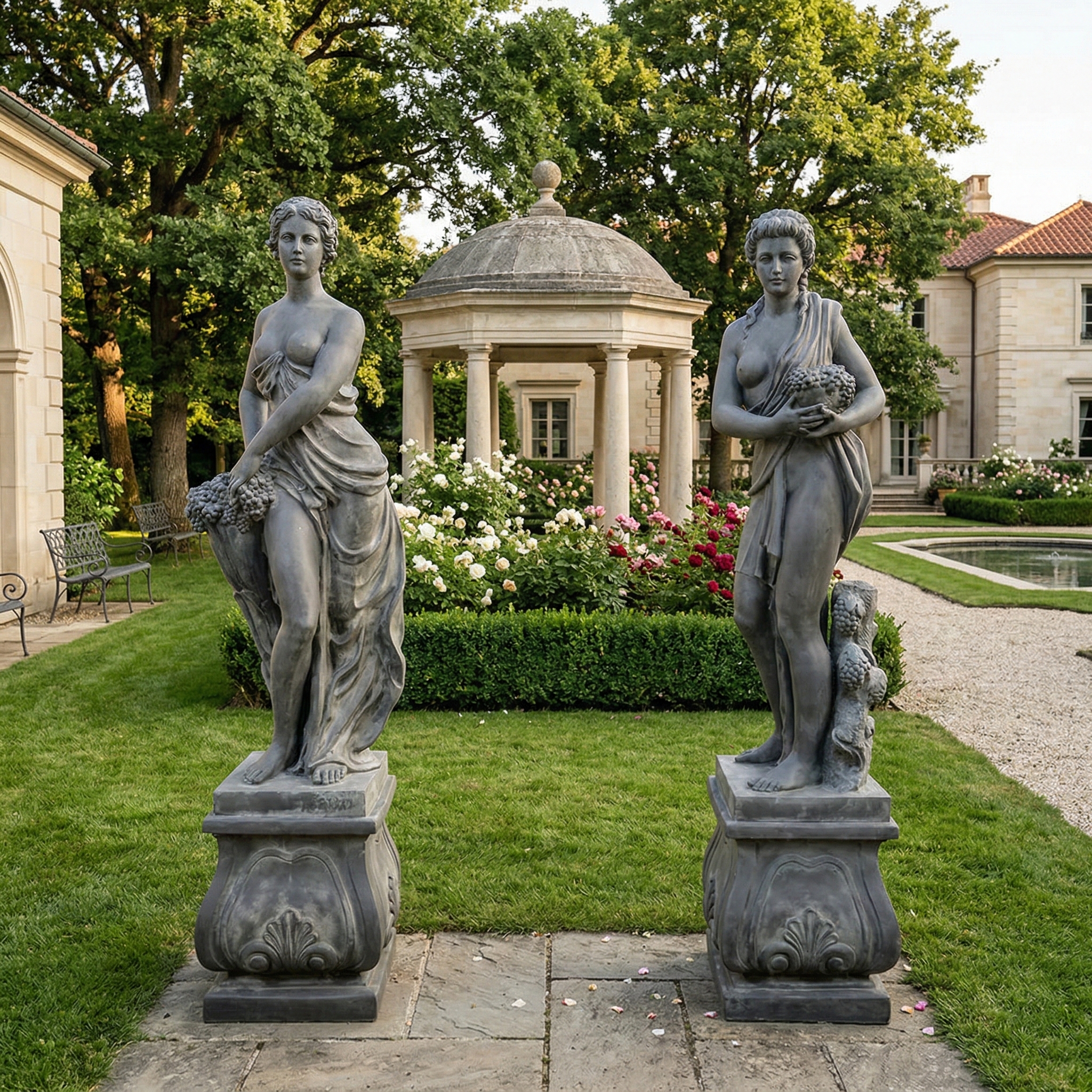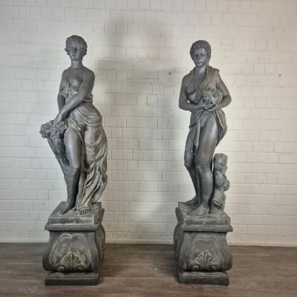 Die Statuen zeigen würdevolle weibliche Figuren in fließenden Gewändern. In ihren Händen halten sie eine Fülle von Früchten oder Blumen, was möglicherweise auf eine Allegorie der Fülle, des Sommers oder einer mythologischen Figur hindeutet. Die sanften Konturen und die detaillierte Ausarbeitung der Gewande und der Haare zeugen von der Kunstfertigkeit des Bildhauers.