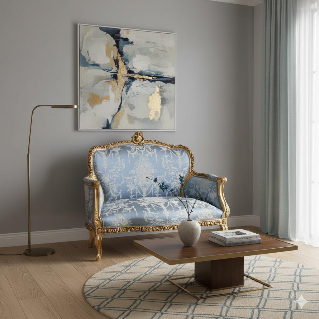 Majestätisches Barock-Sofa – Goldrahmen & Geblümter Satinstoff