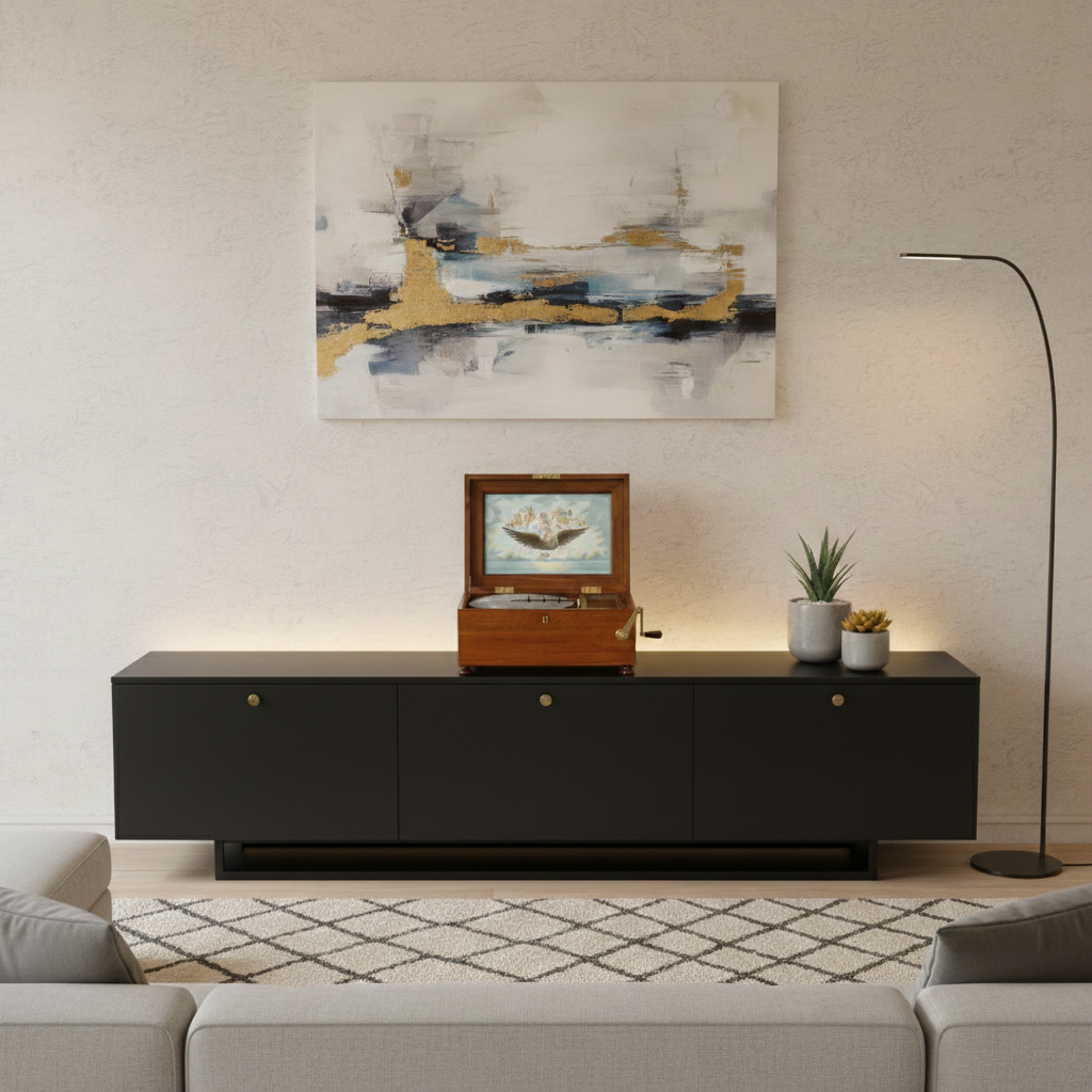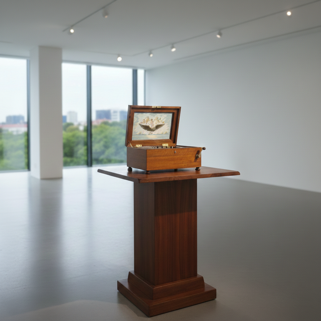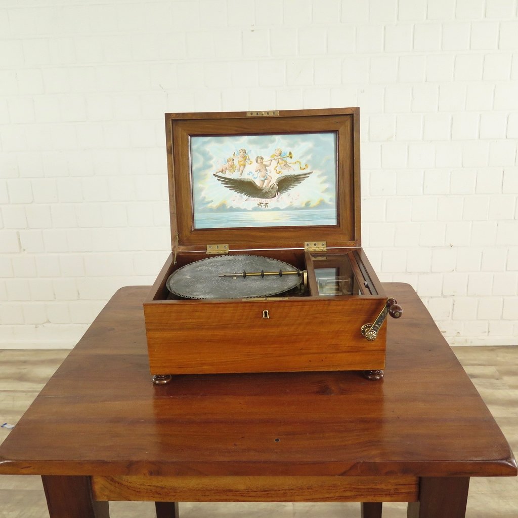 1.259,66€ Exkl. MwSt.Restaurierte Gründerzeit Spieluhr in Nussbaum furniert von ca. 1870. Die funktionstüchtige Spieluhr befindet sich in einem guten Zustand und weist nur leichte Gebrauchsspuren auf. Der Kasten ist frei von Wurmbefall und befindet sich ebenfalls in einem guten Zustand.