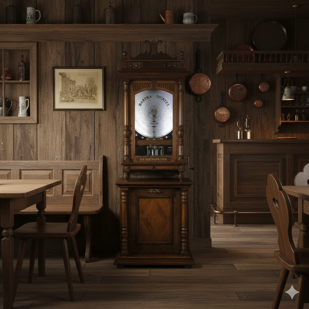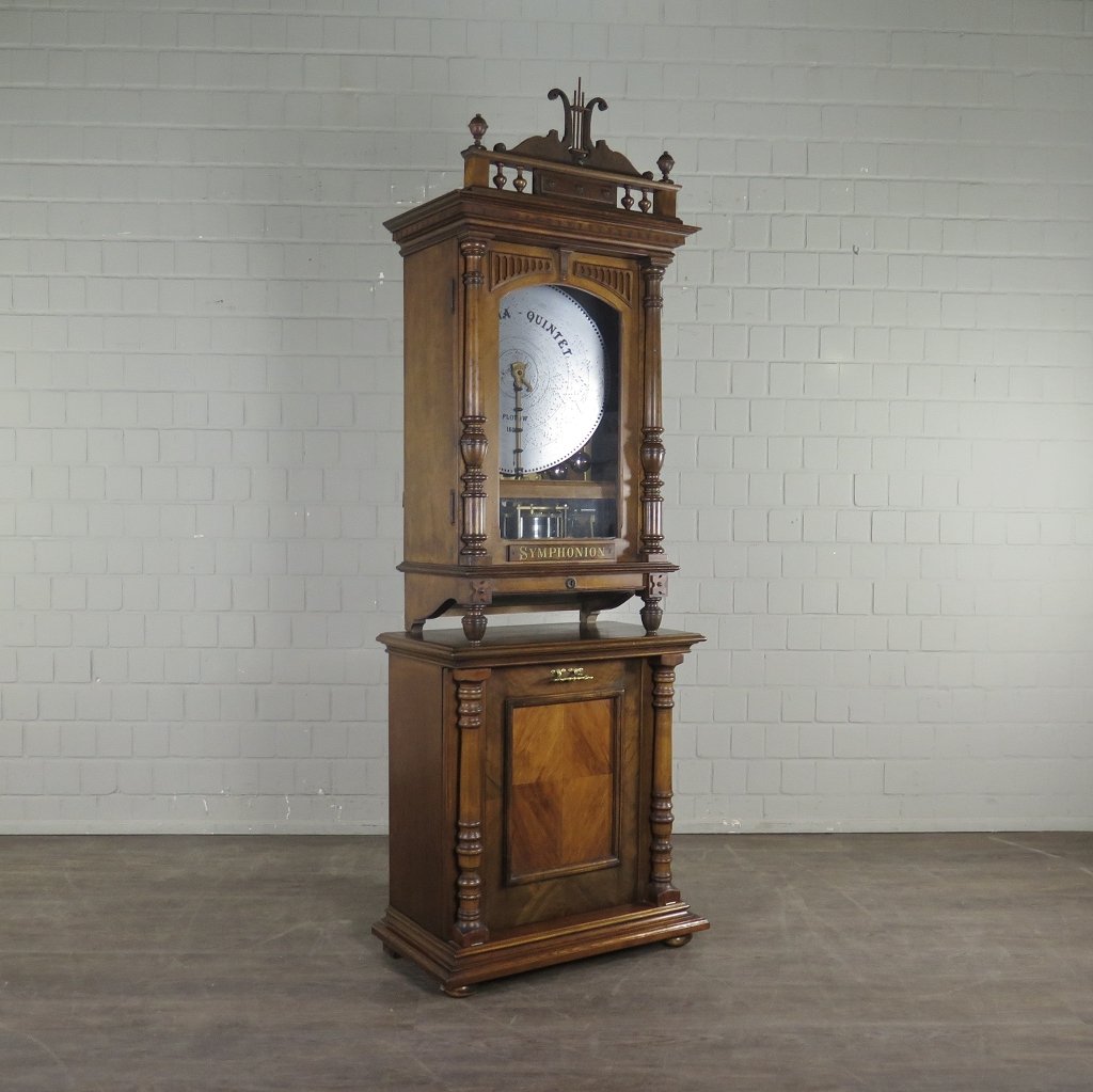 11.449,00€ Exkl. MwSt.Im Originalzustand stehende Gründerzeit Symphonion Spieluhr von ca. 1880. Die funktionstüchtige Spieluhr befindet sich in einem sehr guten Zustand und weist nur minimale Gebrauchsspuren auf. Der restaurierte in Nussbaum furnierte Schrank befindet sich ebenfalls in einem sehr guten Zustand. Zerlegbar (2-teilig).
