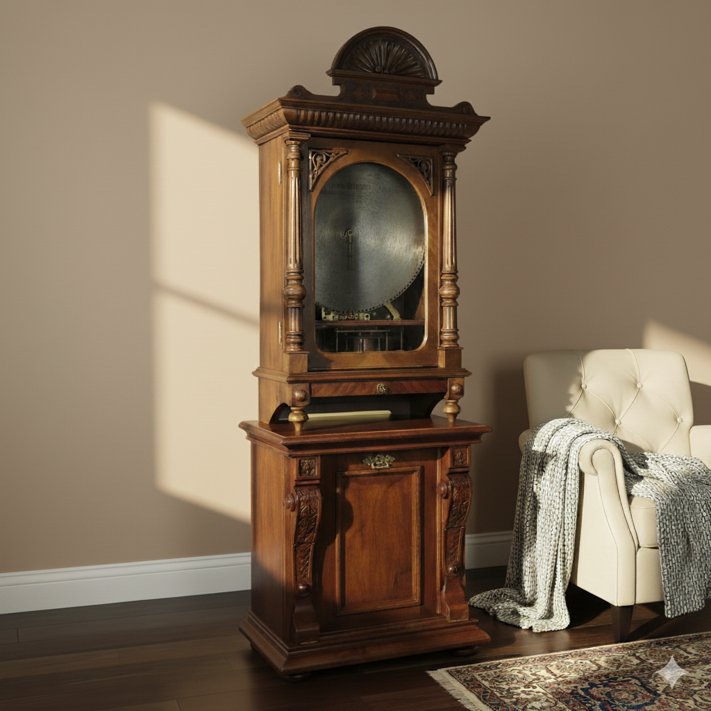 8.749,00€ Exkl. MwSt.Im Originalzustand stehende Gründerzeit Symphonion Spieluhr von ca. 1880. Die funktionstüchtige Spieluhr befindet sich in einem sehr guten Zustand und weist nur minimale Gebrauchsspuren auf. Der restaurierte aus Nussbaum Furnier (gewachst) hergestellte Schrank ist frei von Wurmbefall und befindet sich ebenfalls in einem guten Zustand. Zerlegbar (2-teilig).