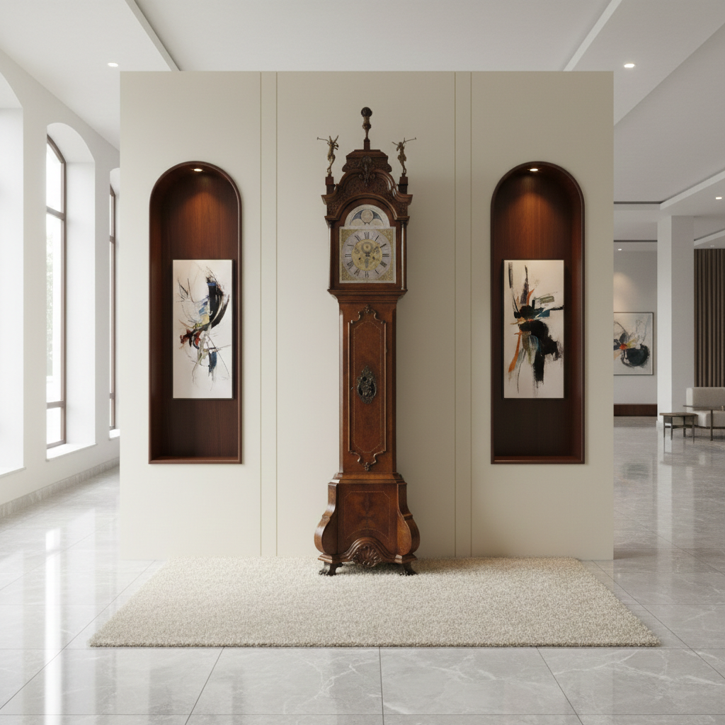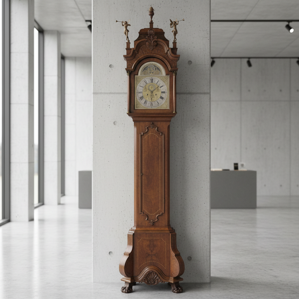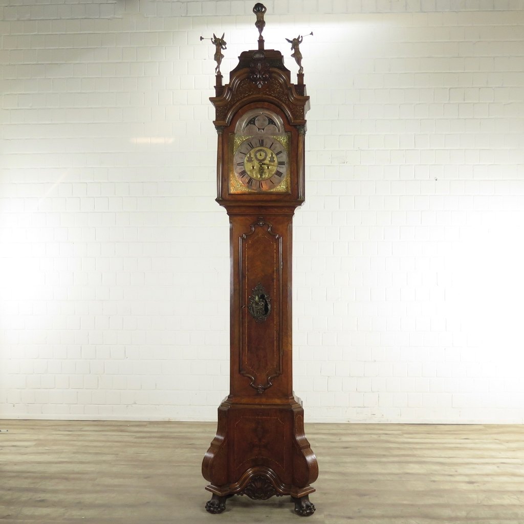 10.995,00€ Exkl. MwSt.Im Originalzustand stehende Standuhr aus Amsterdam von ca. 1790. Die mit Kalender und Mondphase versehene Uhr ist zusätzlich mit einem Sekundenzeiger ausgestattet. Das Uhrwerk befindet sich in einem stilvoll verzierten Korpus welcher in Nussbaum furniert wurde.