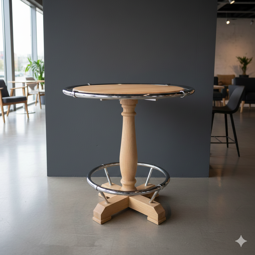 Klassischer Stehtisch, hergestellt aus massiv Teakholz mit verchromtem Fuß- und Handlauf.
