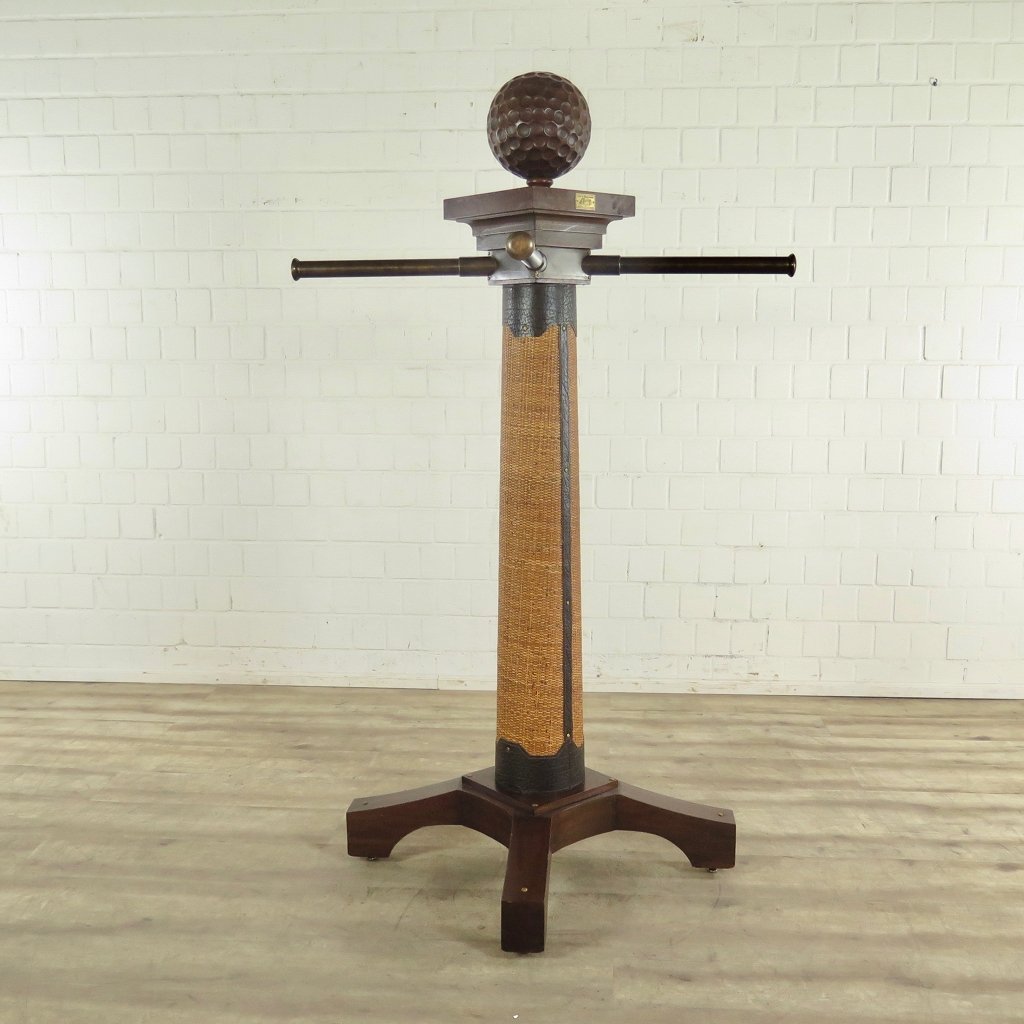 Dieser formschön gestaltete Kleiderständer von Stiles Brothers aus massiv Mahagoni, Rattan und Messing hergestellt erhält seine besondere Wirkung durch die einzigartige Verarbeitung der verschiedenen Materialien. Der mit Golfball verzierte Ständer ist mit vier Armen aus Messing ausgestattet die (je nach Produkt) etwa 8 bis 12 Kleidungsstücke halten können.