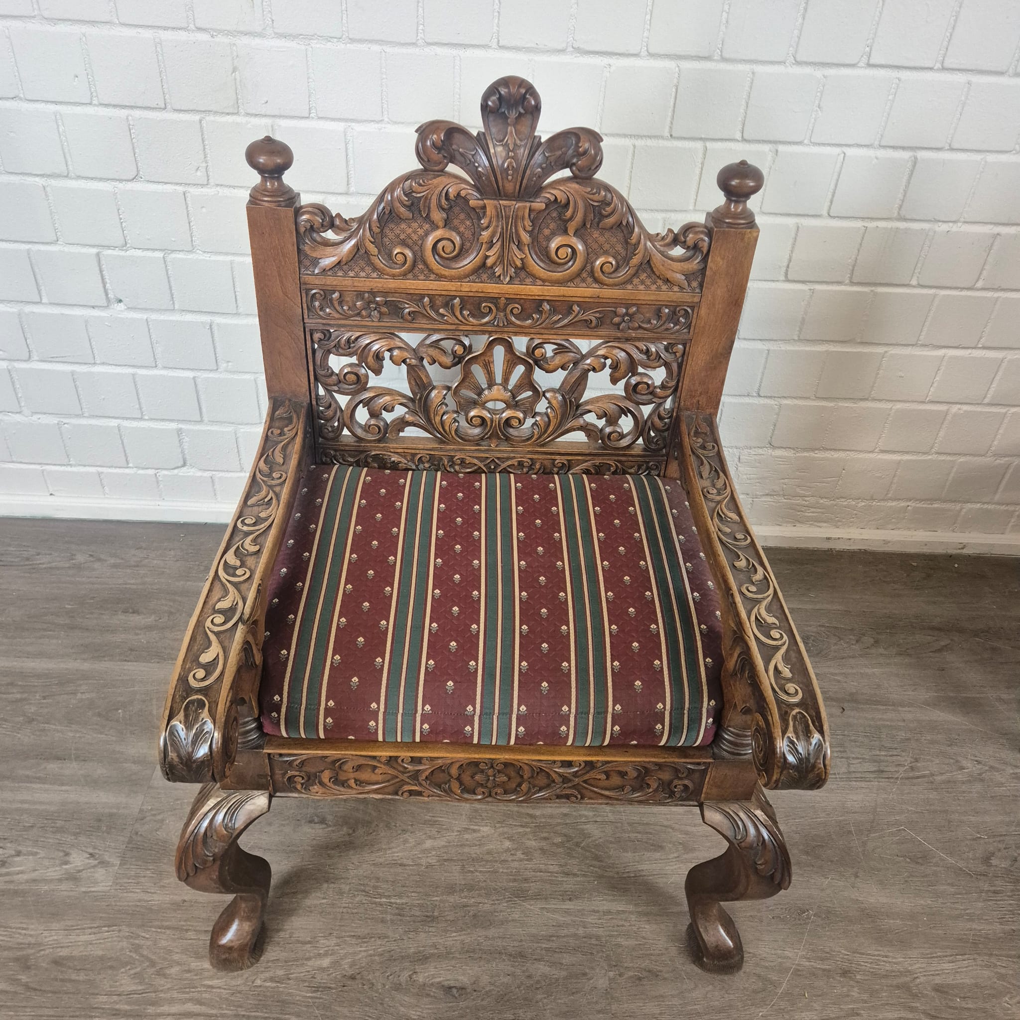 Dieses exquisite Set von zwei antiken Stühlen aus der Gründerzeit (ca. 1880) ist ein Zeugnis meisterhafter Handwerkskunst. Gefertigt aus massivem Nussbaum, bestechen die Stühle durch ihre aufwendigen, handgeschnitzten Verzierungen, die typisch für diese historische Epoche sind. Die gedrechselten Beine und Streben sowie die detailreichen Ornamente an der Rückenlehne verleihen jedem Stuhl eine beeindruckende, skulpturale Qualität.