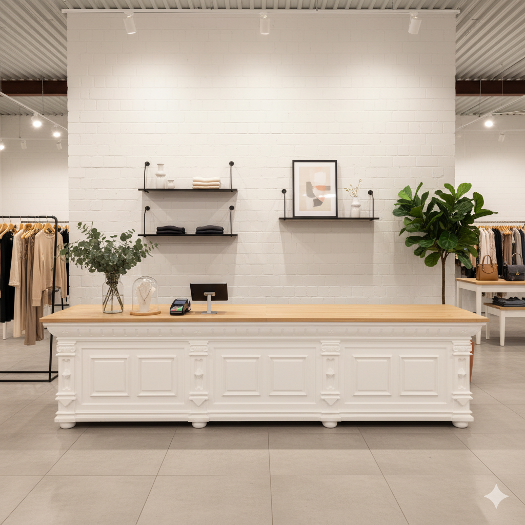 Der Tresen Modell Bella aus Massivholz besticht durch seine stilvolle Eleganz und der aufwendigen Verarbeitung. Die Kombination von nostalgischer Optik und moderner Funktionalität ist für alle Ladeneinrichtungen sowie vielen weiteren Einsatzgebieten geeignet. Der Tresen wird komplett fertig montiert geliefert und ist somit sofort einsatzbereit.