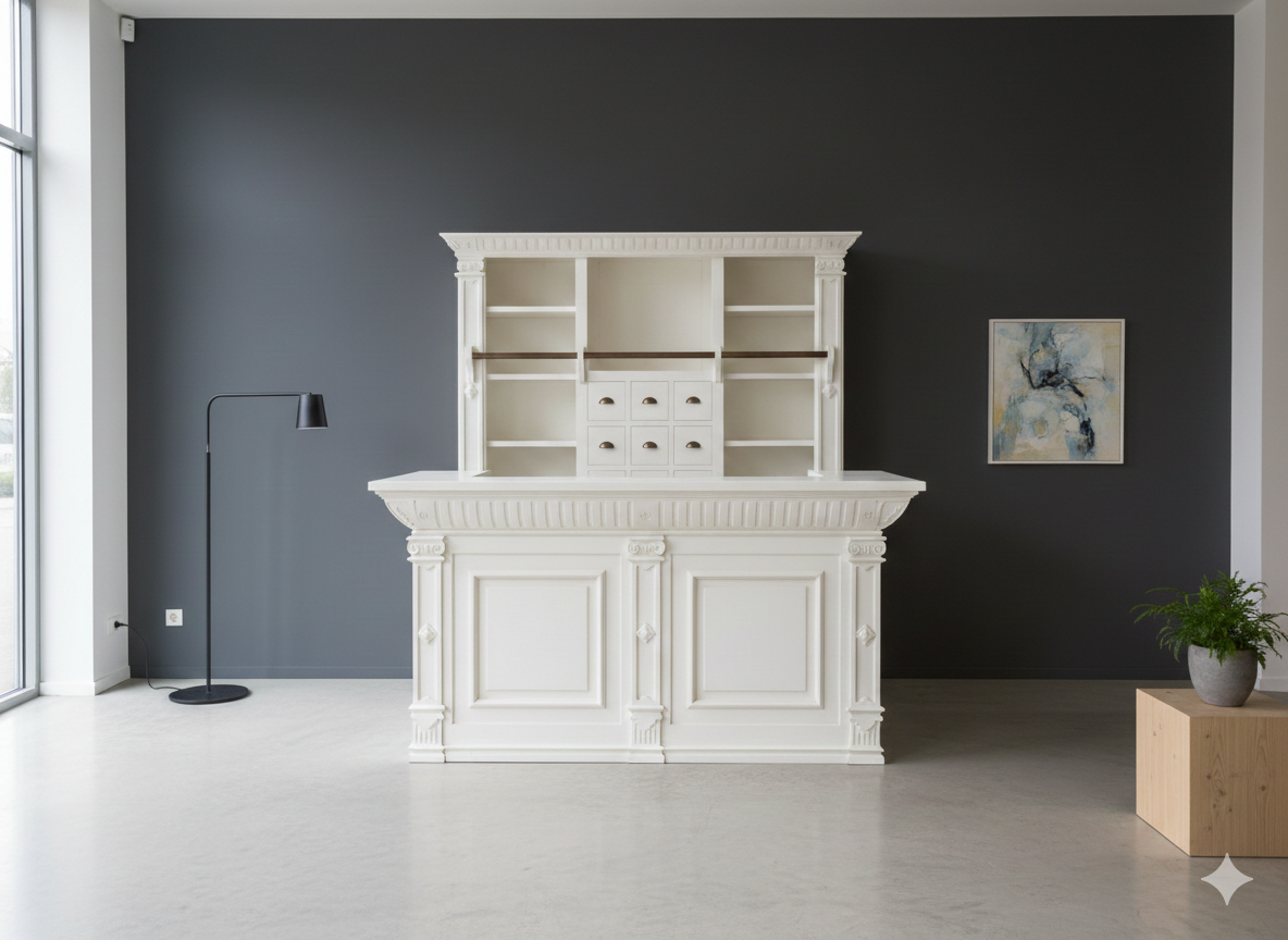 Die Kombination aus Tresen und Schrank Modell Bella aus Massivholz besticht durch ihre stilvolle Eleganz und der aufwendigen Verarbeitung. Die Kombination von nostalgischer Optik und moderner Funktionalität ist für alle Ladeneinrichtungen sowie vielen weiteren Einsatzgebieten geeignet. Die Möbel werden komplett fertig montiert geliefert und sind somit sofort einsatzbereit.