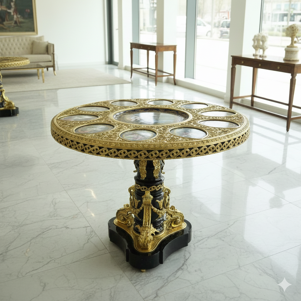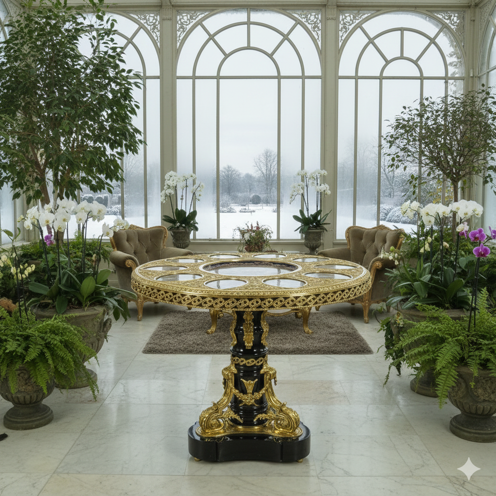 Dieser stilvoll gestaltete Tisch aus Messing in barocker Optik erhält seine besondere Wirkung durch die aufwendige Verarbeitung und den stilvollen Verzierungen.