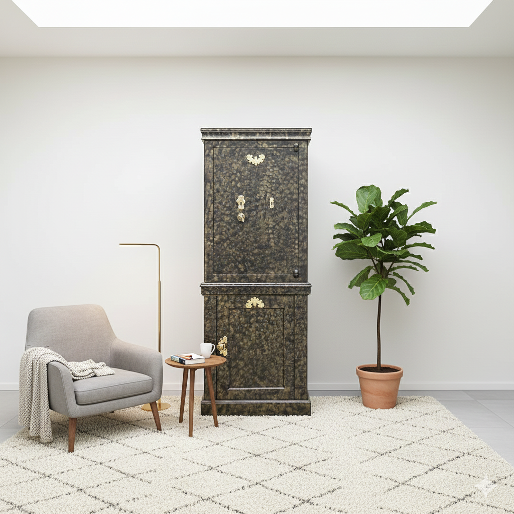 2.299,00€ Exkl. MwSt.Aufwendig gestalteter Gründerzeit Tresor von ca. 1880. Der mit Unterschrank aus massiv Holz hergestellte Panzerschrank befindet sich in einem sehr guten Zustand und weist nur minimale Gebrauchsspuren auf. Der Unterschrank ist etwas wurmstichig was aber inzwischen entsprechend behandelt wurde. Zerlegbar (2-teilig). Gewicht ca. 350 Kilogramm.