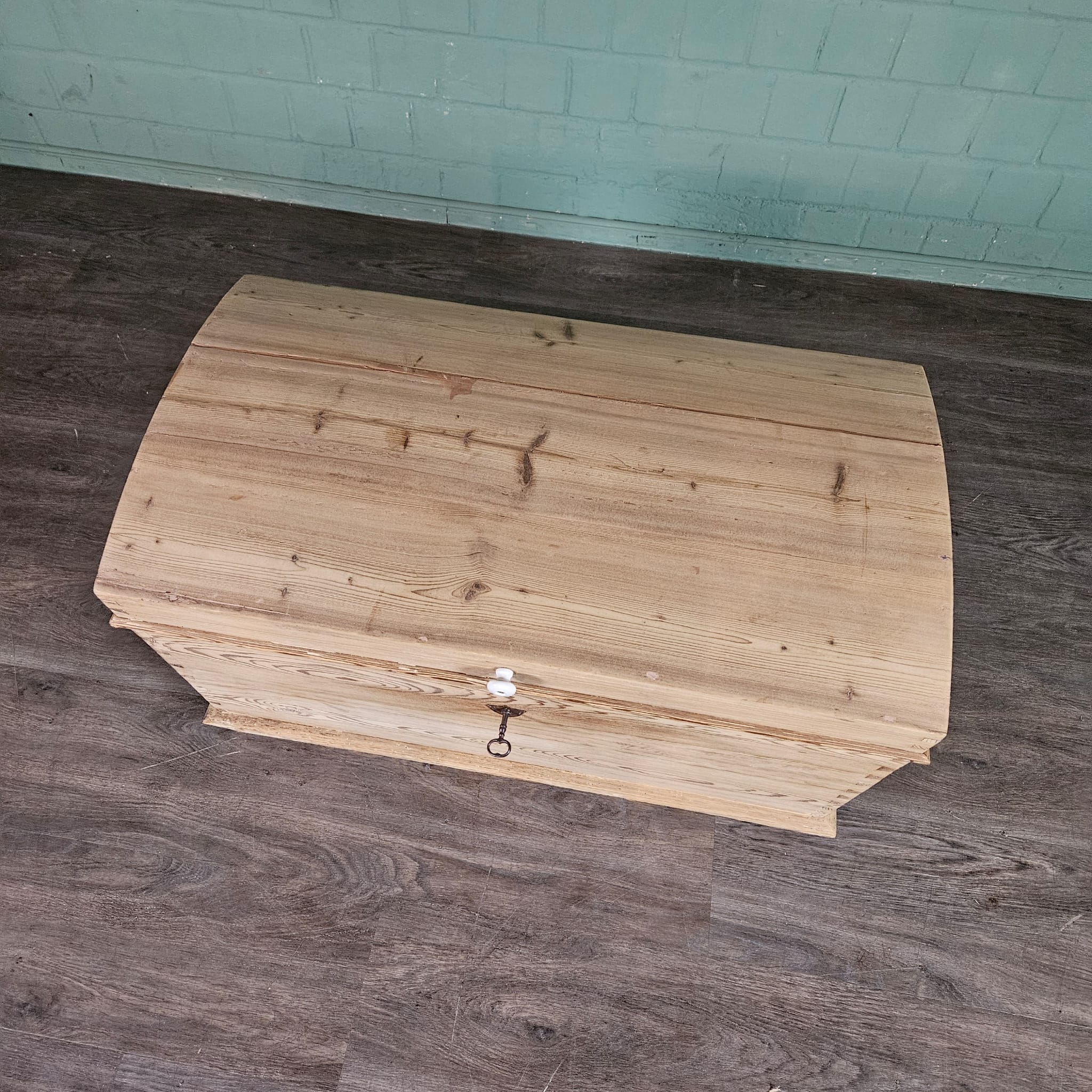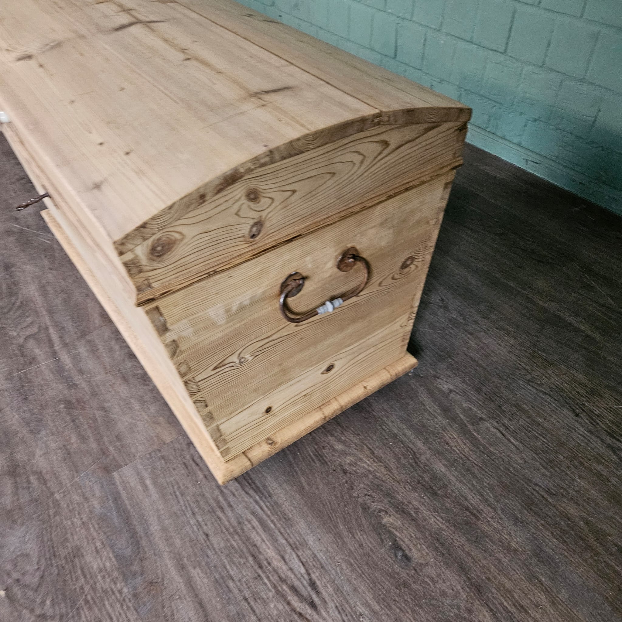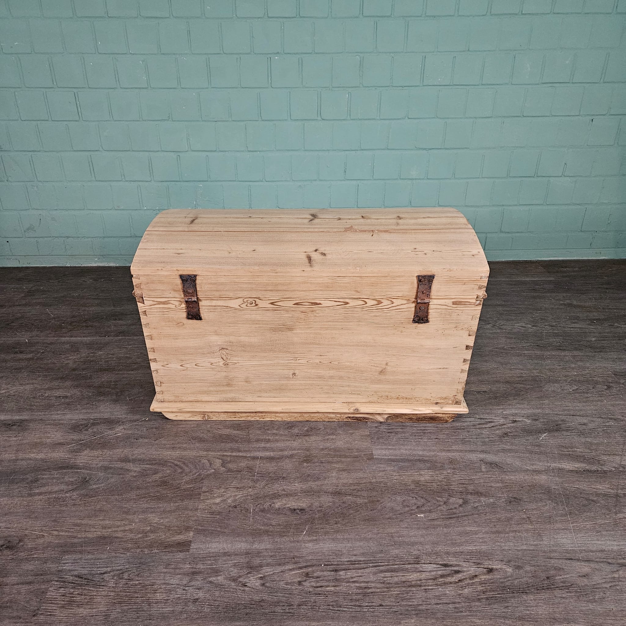 209,24€ Exkl. MwSt.Restaurierte Jugendstil Truhe aus massiv Kiefer (unbehandelt) von ca. 1910. Die Runddeckel-Truhe befindet sich in einem sehr guten Zustand und weist nur minimale Gebrauchsspuren auf.