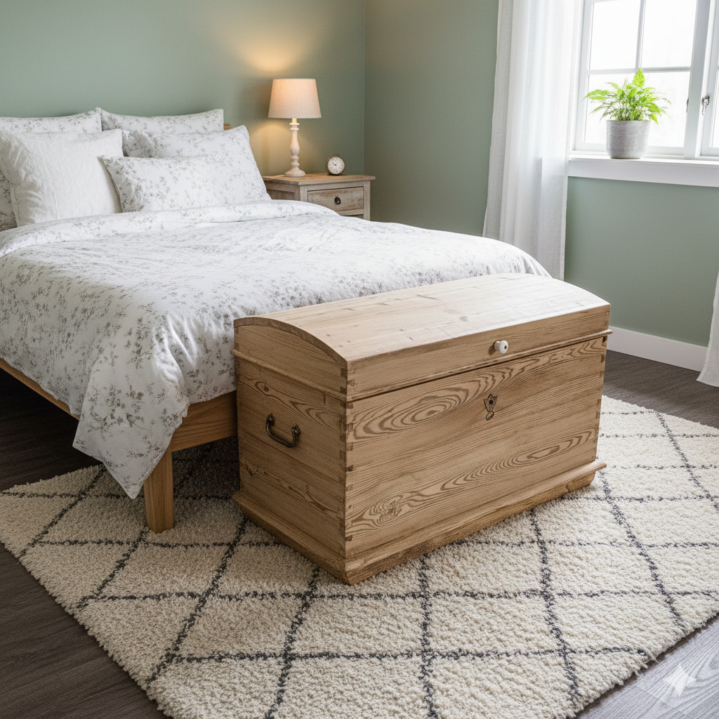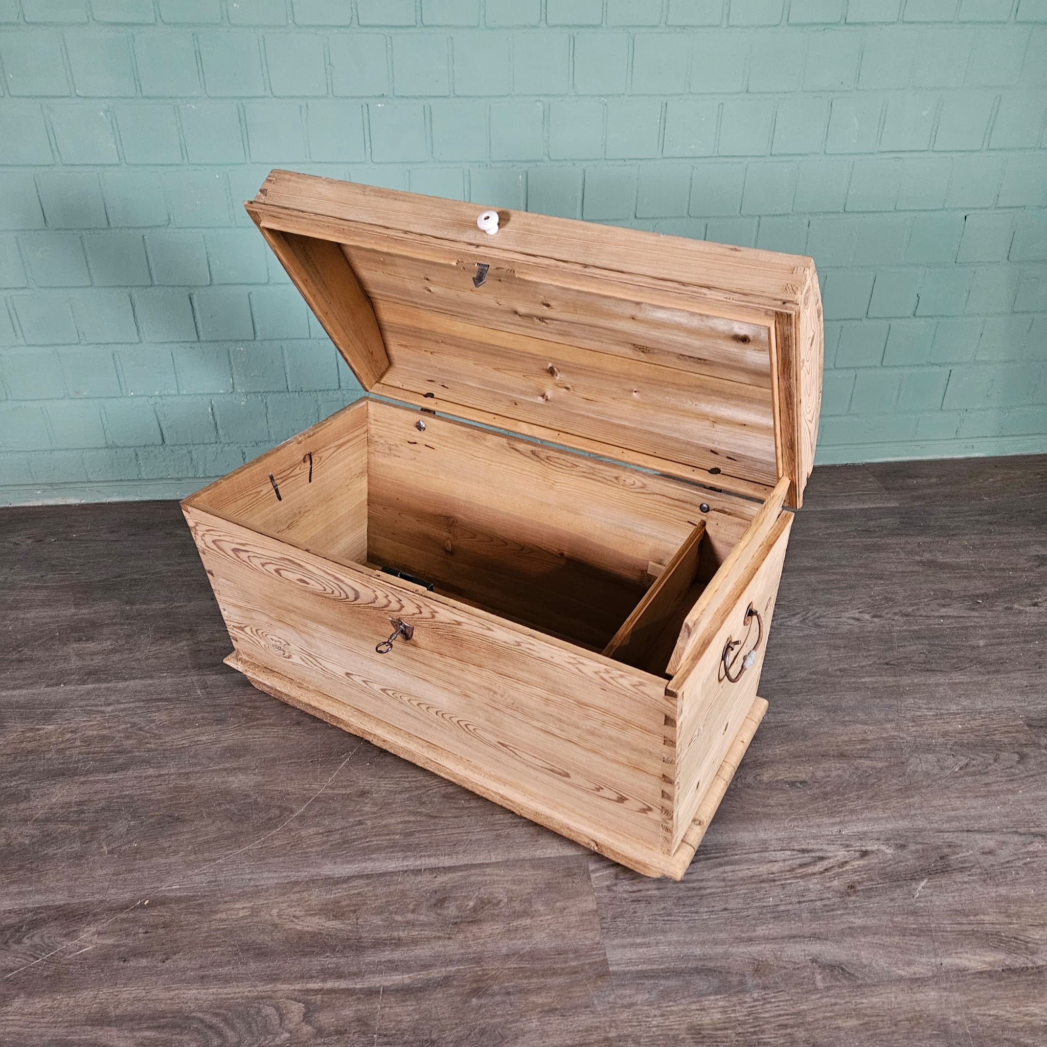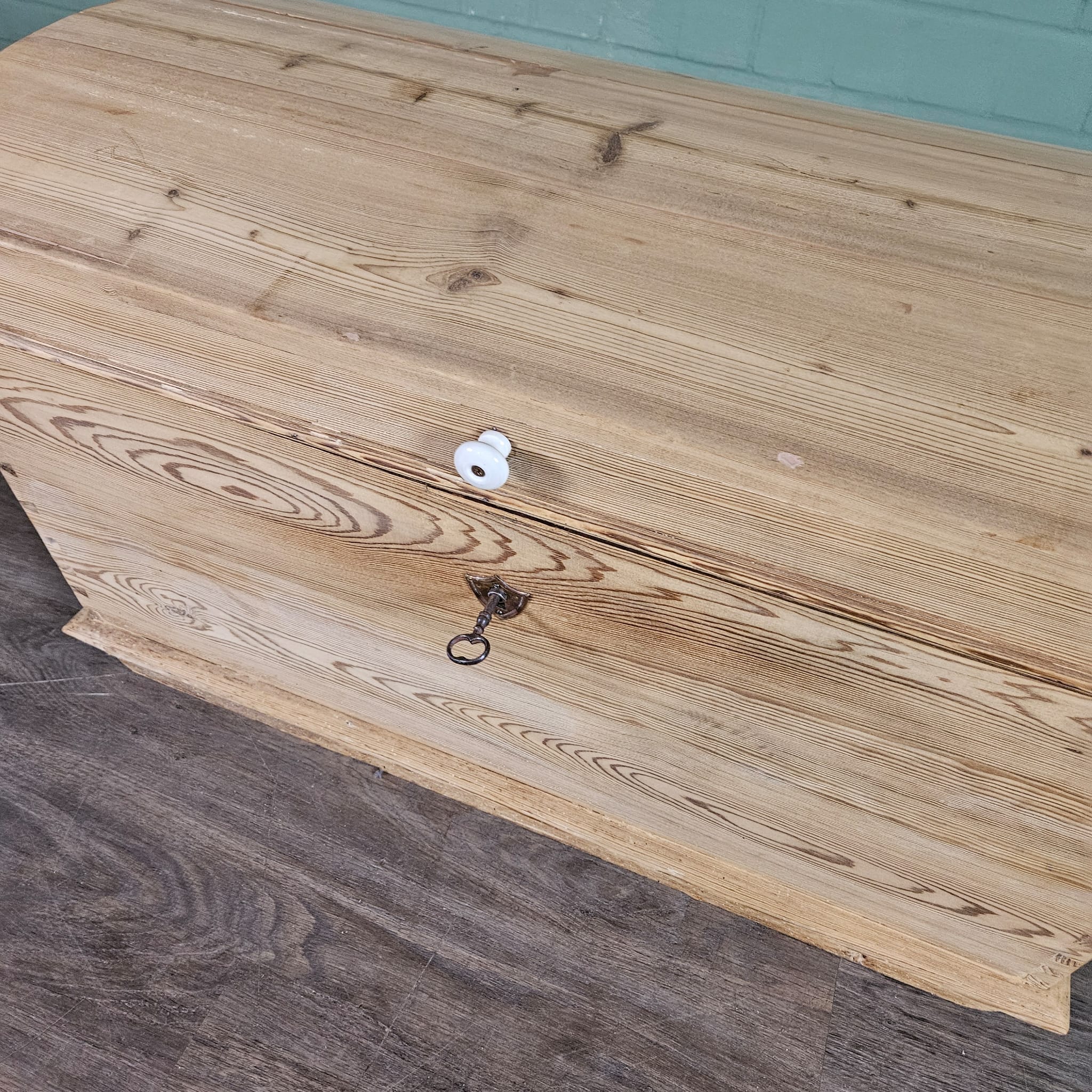 209,24€ Exkl. MwSt.Restaurierte Jugendstil Truhe aus massiv Kiefer (unbehandelt) von ca. 1910. Die Runddeckel-Truhe befindet sich in einem sehr guten Zustand und weist nur minimale Gebrauchsspuren auf.