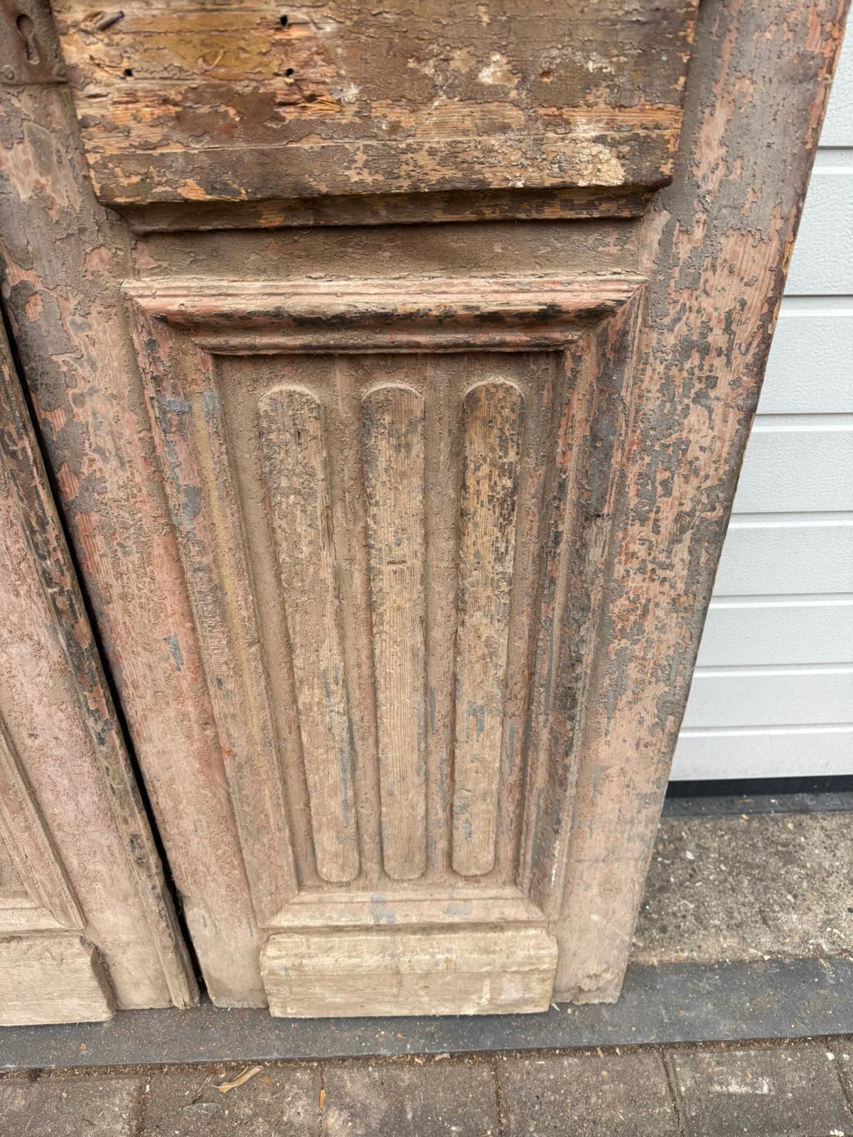 Authentische Patina: Die Türen befinden sich im Fundzustand. Die verwitterte Farboberfläche verleiht ihnen einen unvergleichlichen „Shabby Chic“-Charme, kann aber natürlich auch fachgerecht restauriert oder abgelaugt werden.