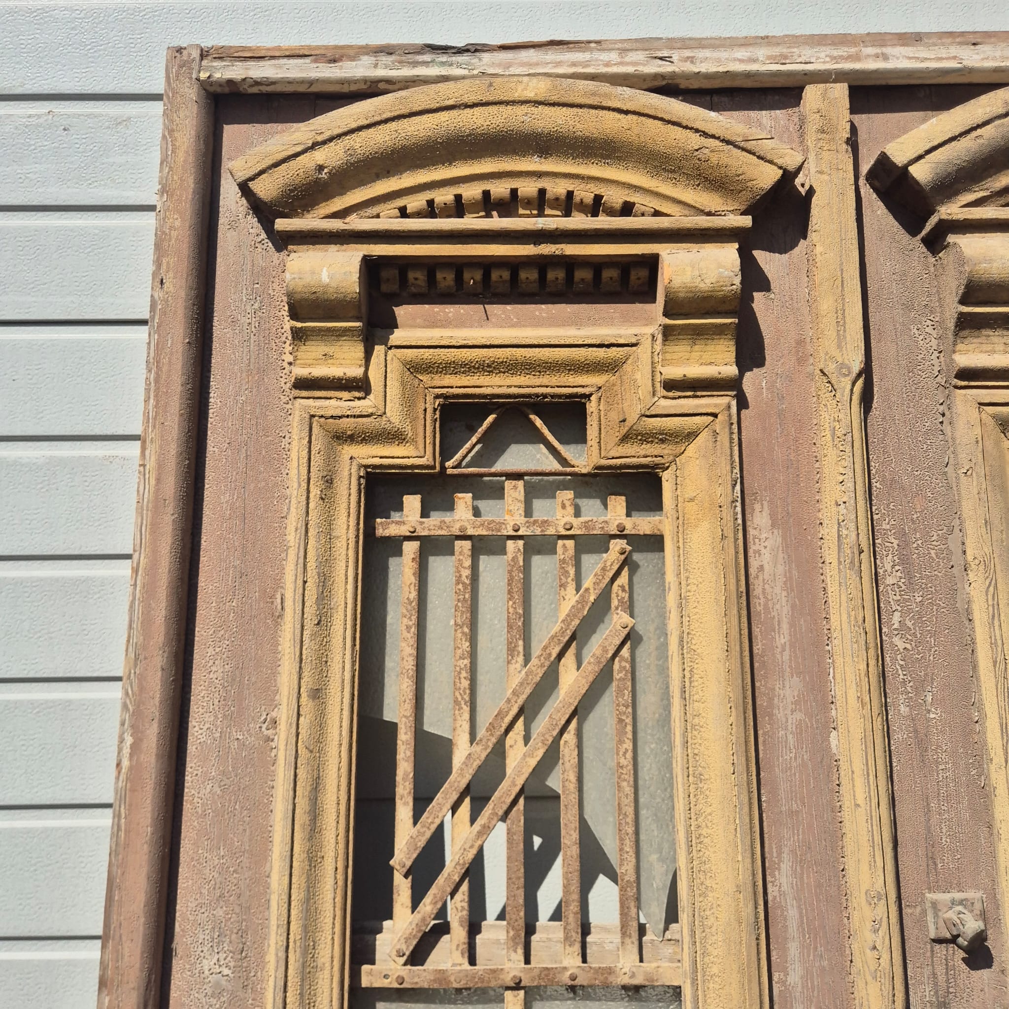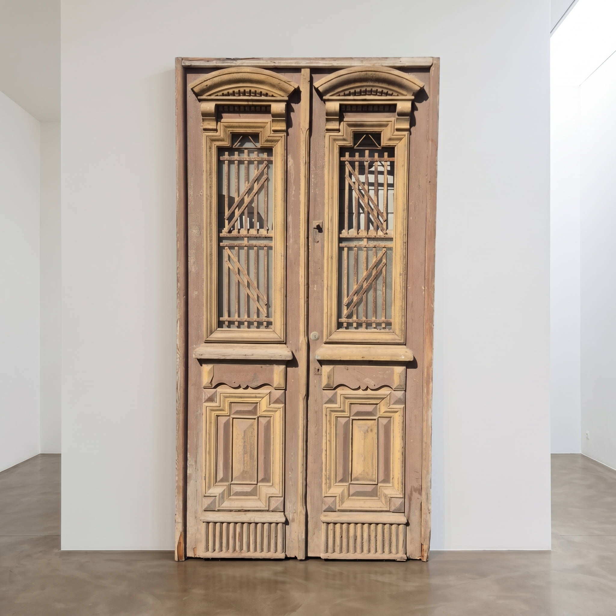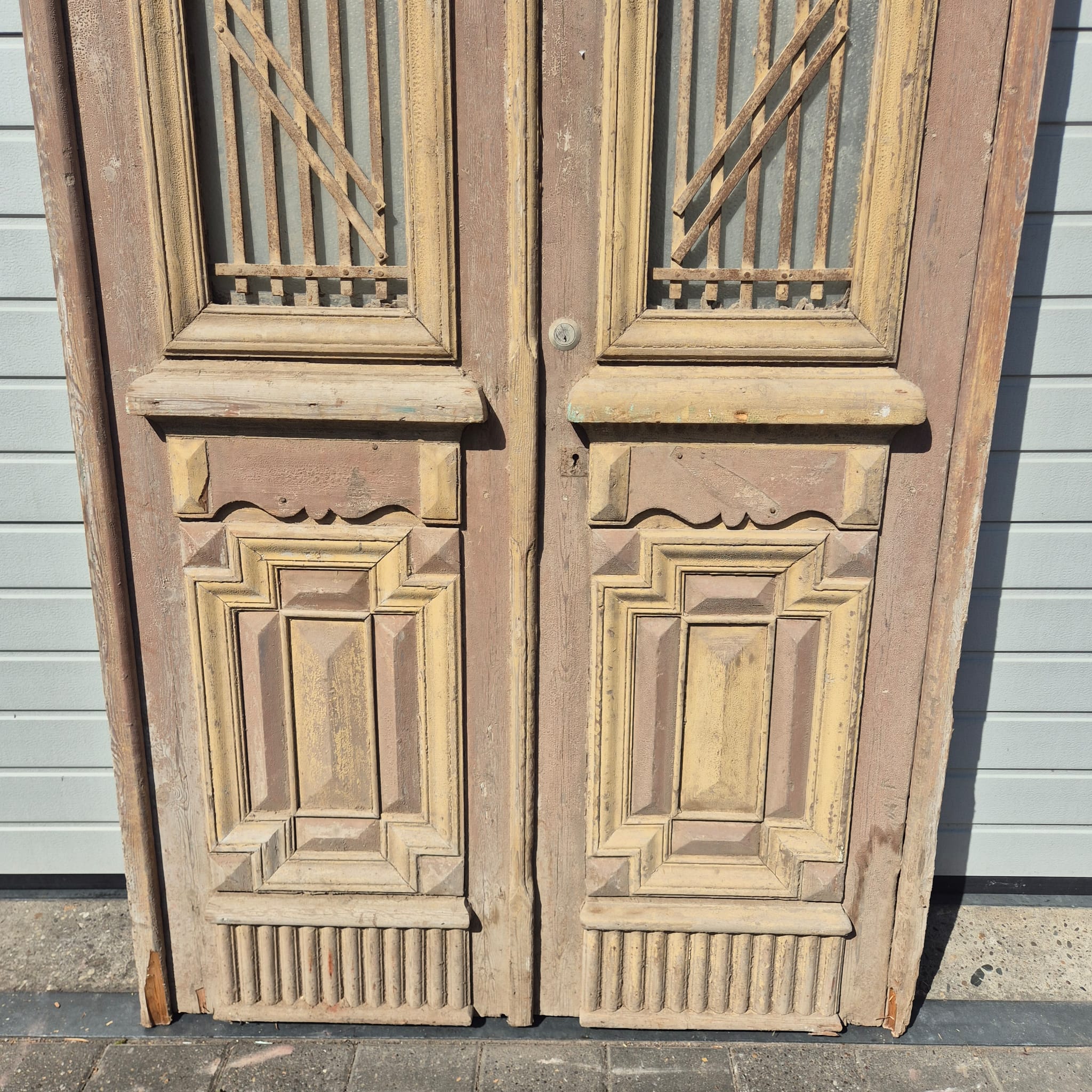 Historisches Design: Der Rahmen und die Türflügel präsentieren sich im unrestaurierten Originalzustand mit einer faszinierenden, mehrschichtigen Farbfassung in Beige die eine einzigartige Patina bildet.