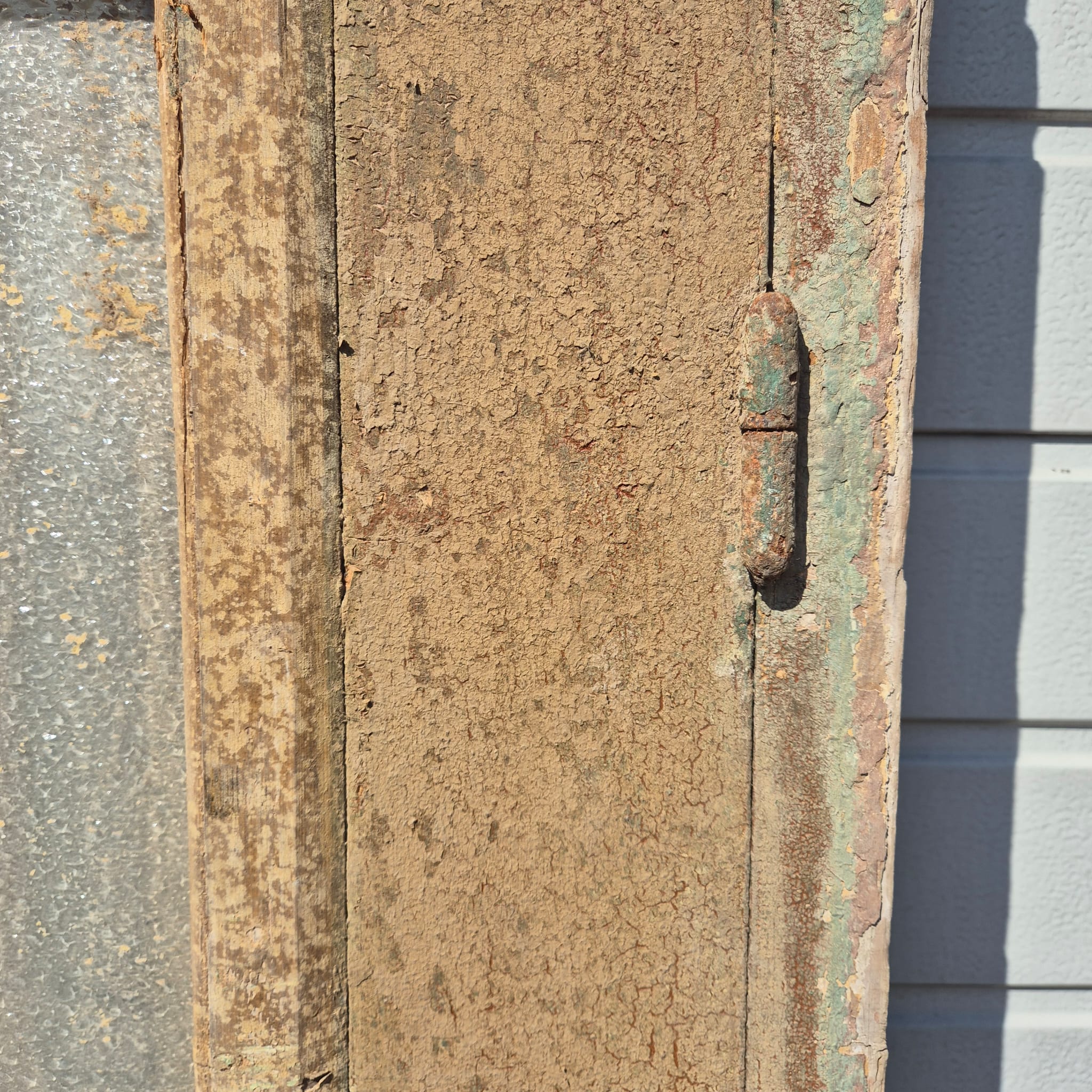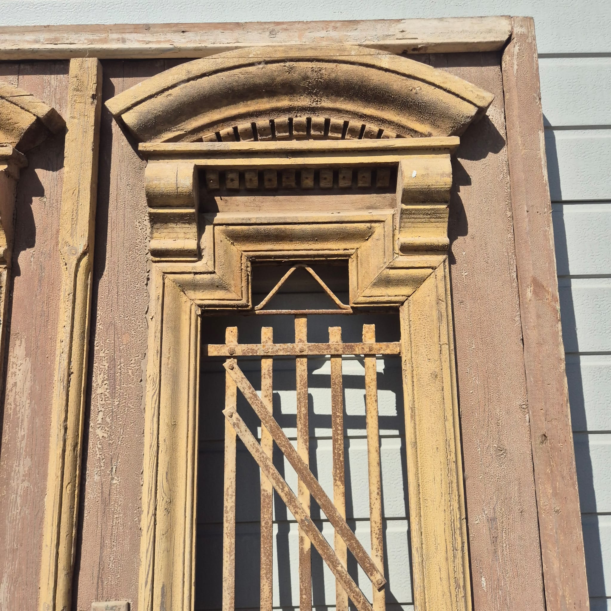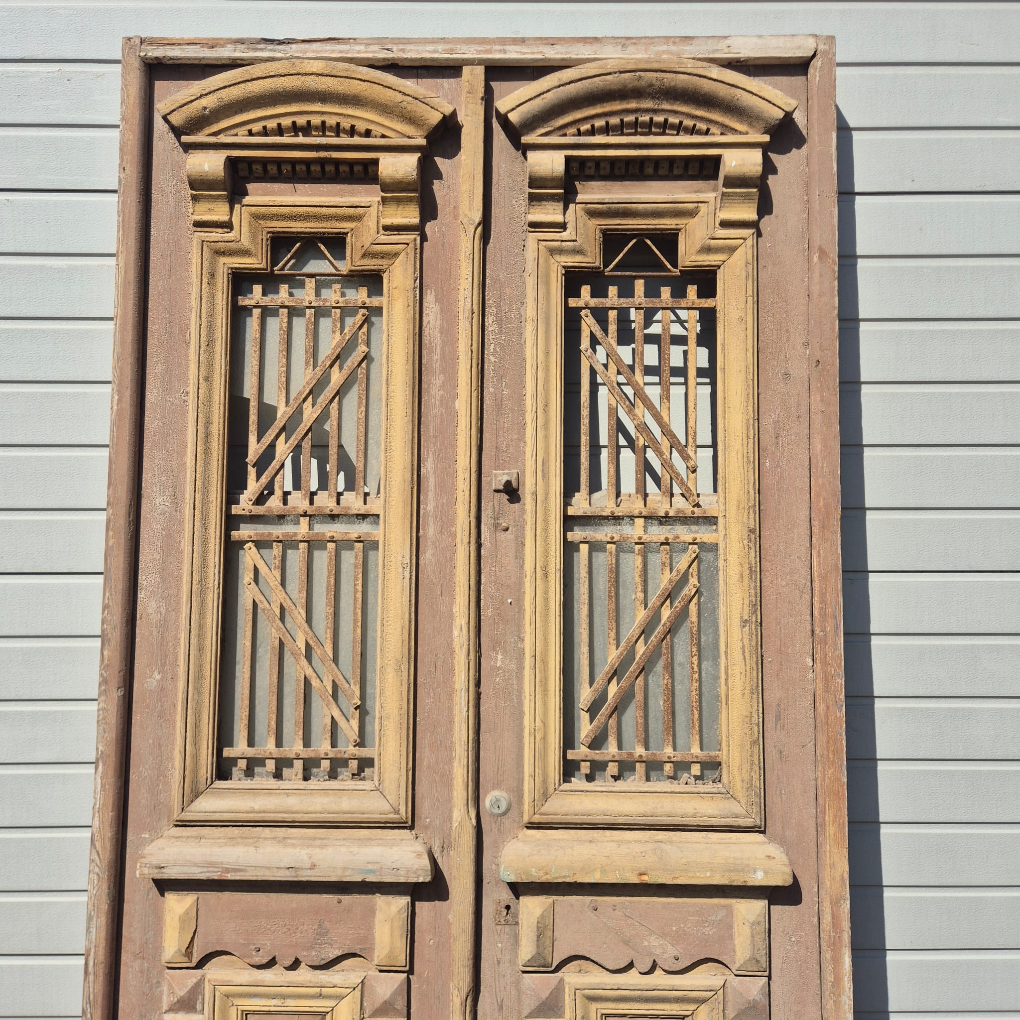 Historisches Design: Der Rahmen und die Türflügel präsentieren sich im unrestaurierten Originalzustand mit einer faszinierenden, mehrschichtigen Farbfassung in Beige die eine einzigartige Patina bildet.